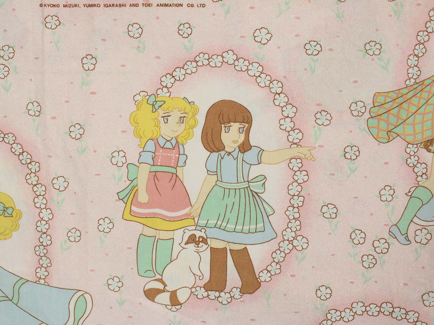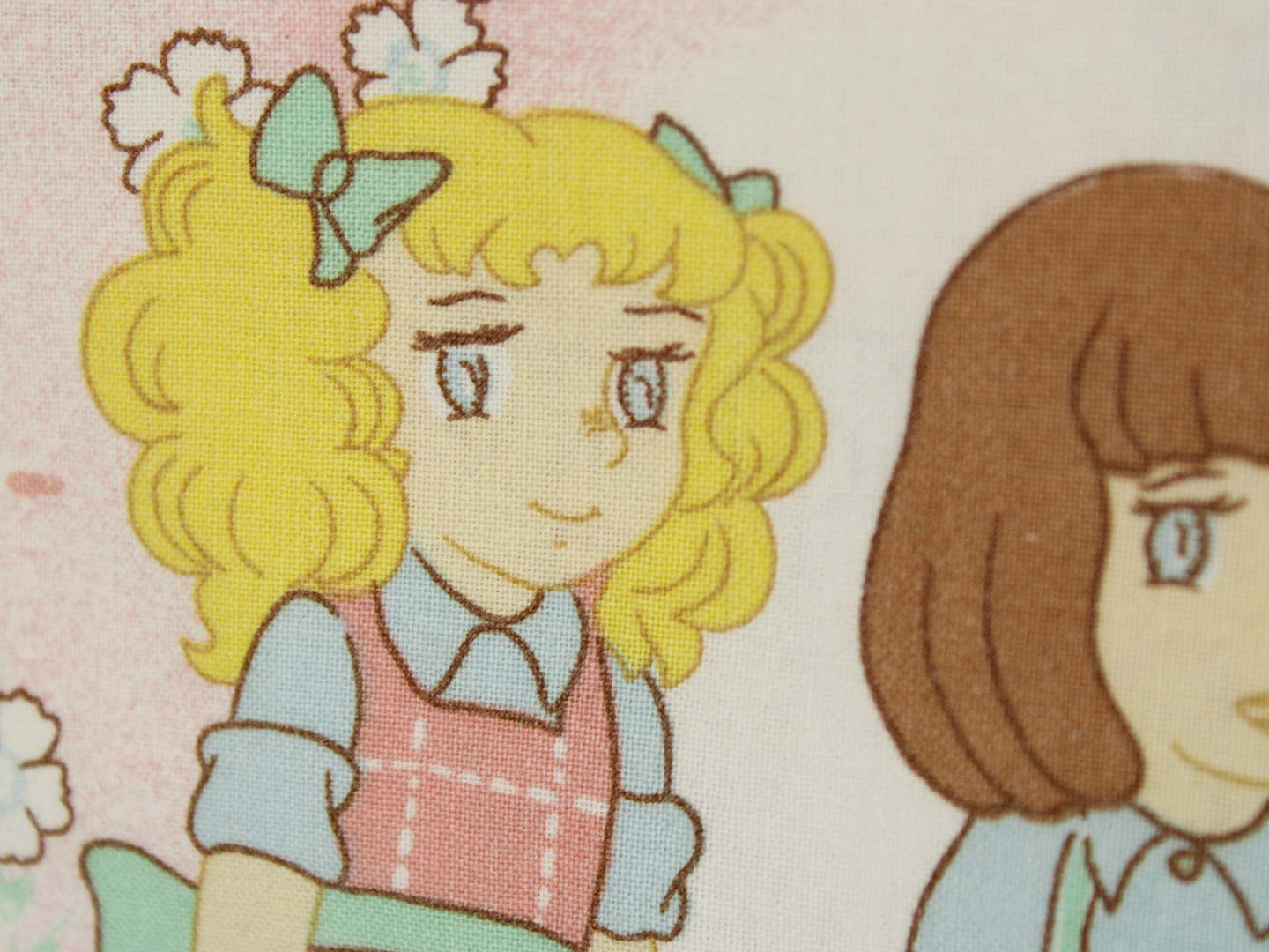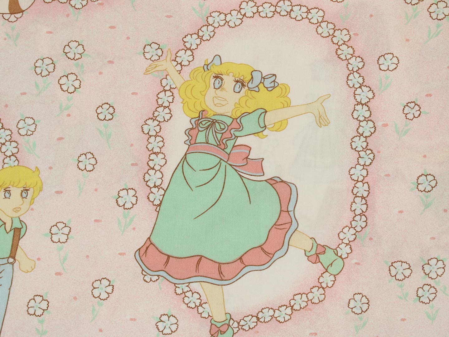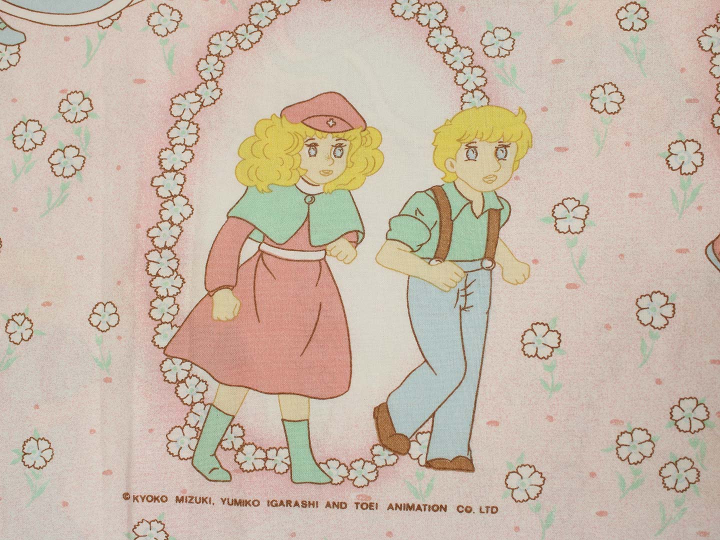 アニメ版キャンディ・キャンディ。ピンク地に小花柄のお布団カバーです。少女時代のキャンディやアニー、丘の上の王子さまが描かれたガーリーなデザインです。お布団カバーは両面同じ絵柄です。やや目の粗い柔らかなコットン製です。