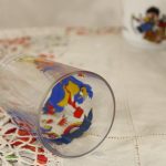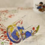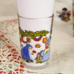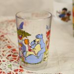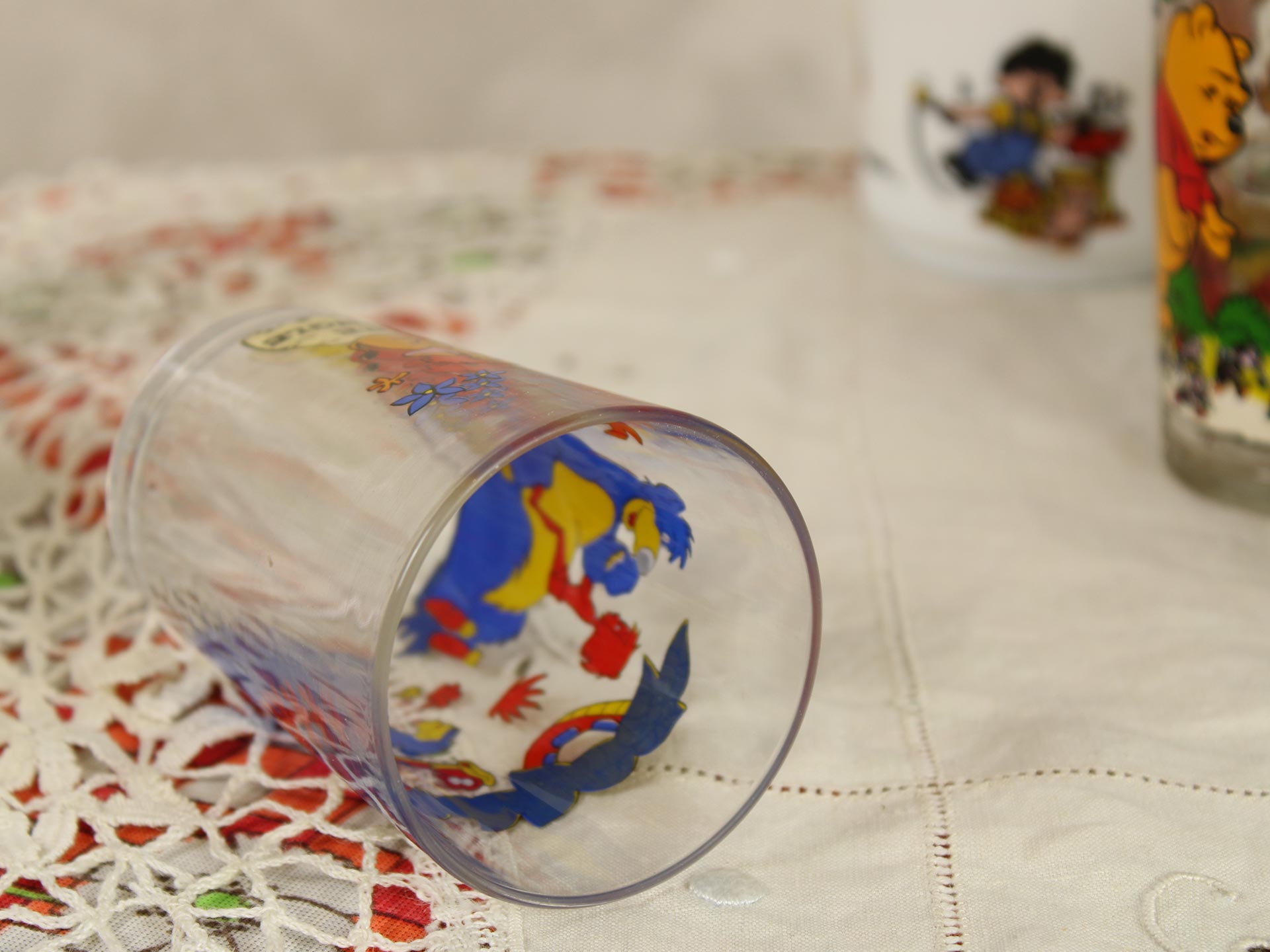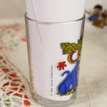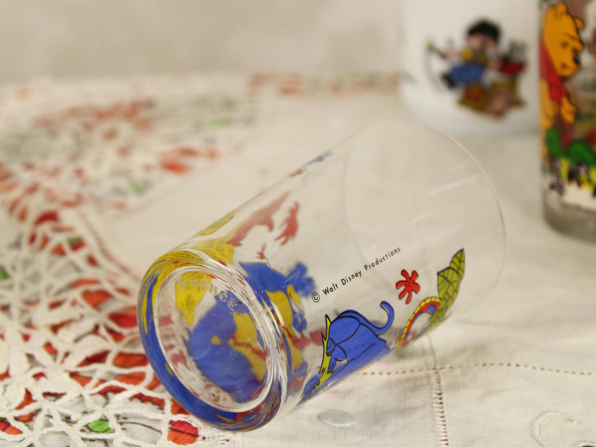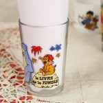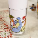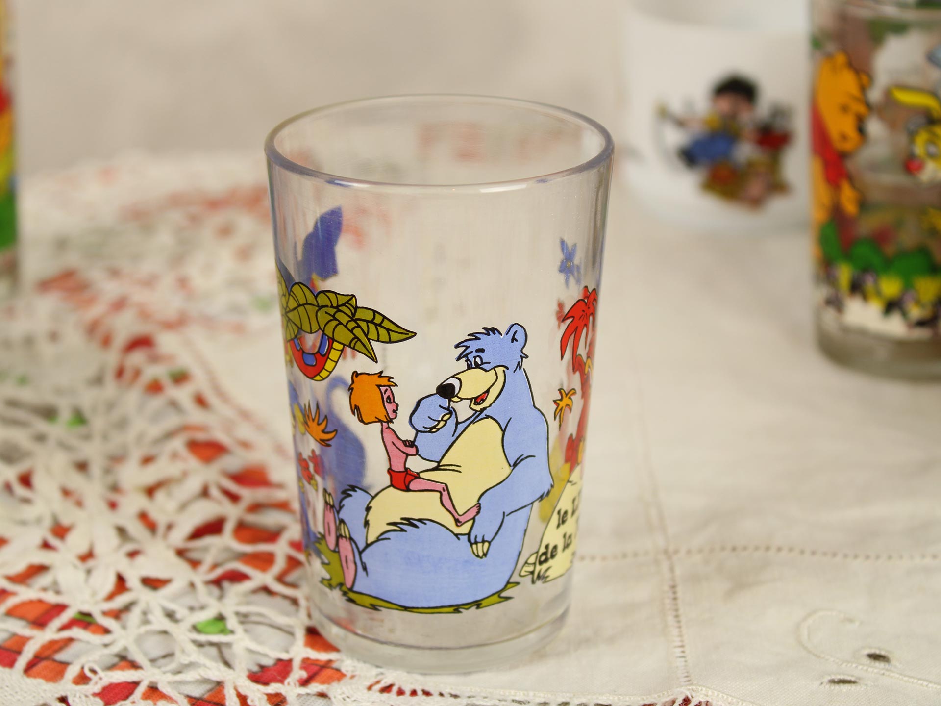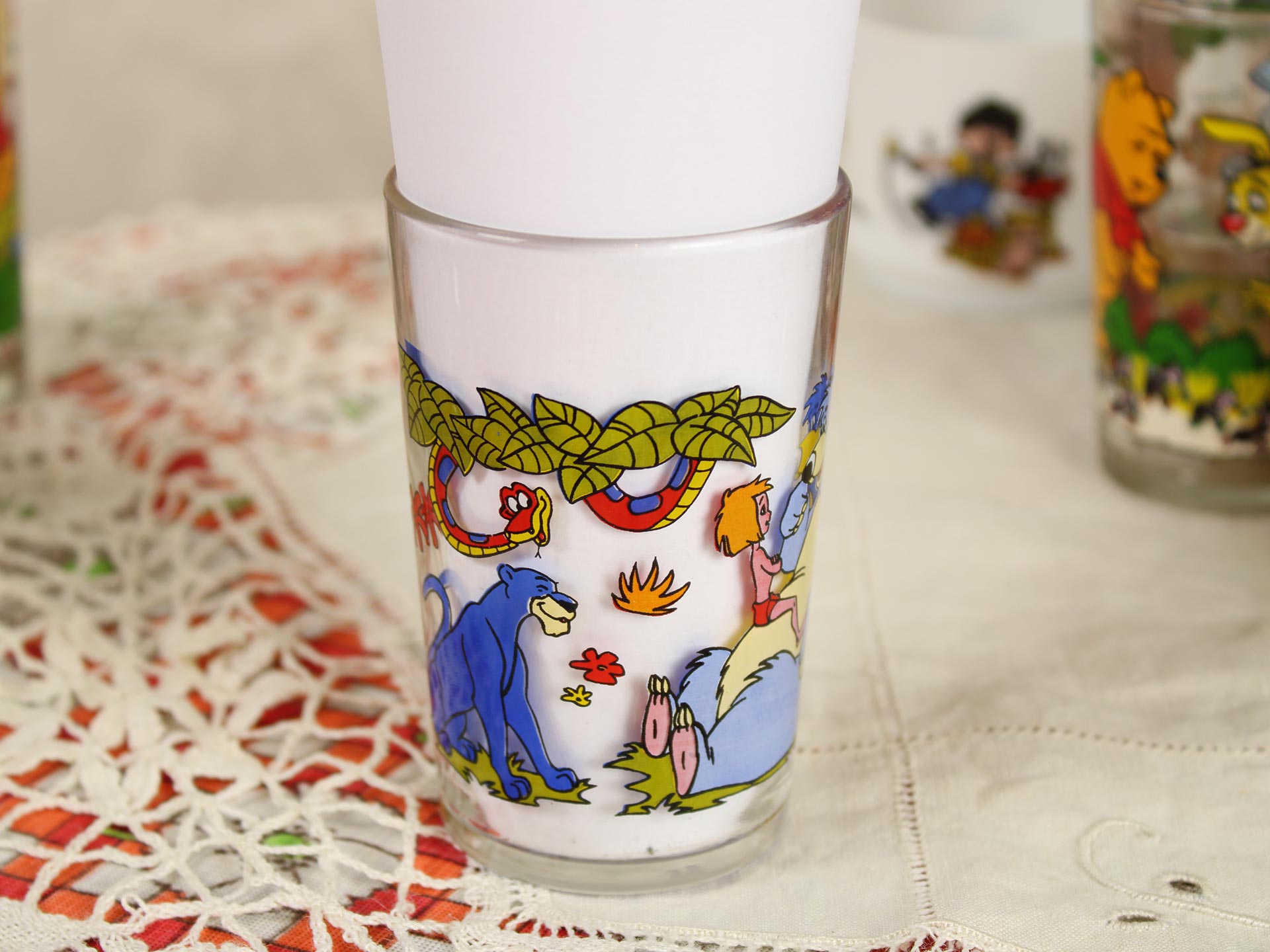 モーグリとバルー、ジャングルの仲間たちが描かれたグラス。マスタードグラスと呼ばれる、元々はマスタードが入って売られていたノベルティ品です。小ぶりで可愛らしいグラスです。