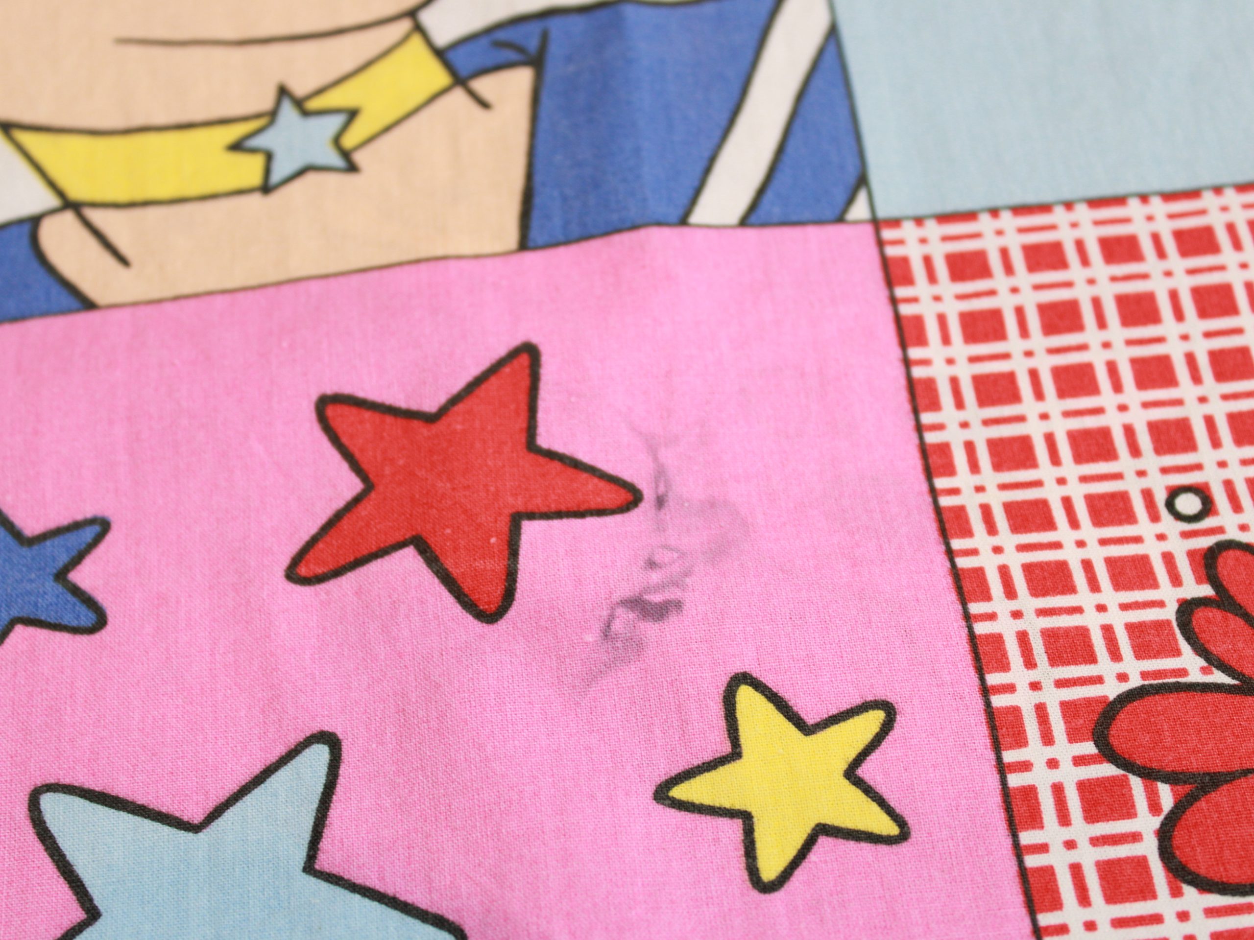 赤地にカラフルなお花が可愛い、セーラームーンのお布団カバー&ピローカバーのベッドセットです。お布団カバーの裏面はルナとアルテミス。表と裏の絵柄が違うリバーシブルタイプです。ピローカバーは両面同じ絵柄です。シワや擦れなど通常程度の使用感。色落ちは少なく、生地劣化もさほど感じられません。シーツには3ヶ所に薄い汚れがあります。
