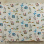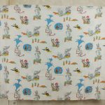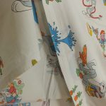 フランス版ルーニー・チューンズ。キャラクターがいっぱいのフラットシーツです。1枚もの。全体画像はフラットシーツを2つ折りにしています。全体的な軽い色落ち、生地表面の擦れがあります。複数ヶ所に汚れがあります。生地端には擦れ、折れ跡があります。