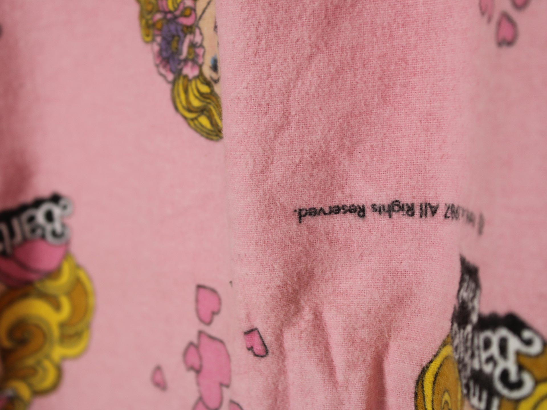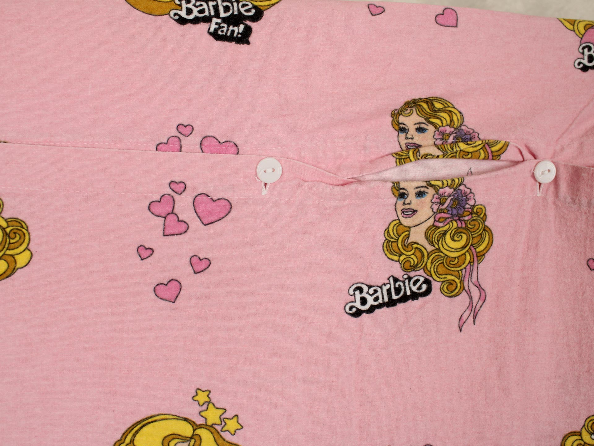 ピンク地にレトロな絵柄のバービーが可愛らしいお布団カバー&ピローカバーのベッドセットです。冬用のコットンフランネル製です。ボタン式。お布団カバーは両面同じ絵柄、ピローカバーは裏表が別の絵柄です。