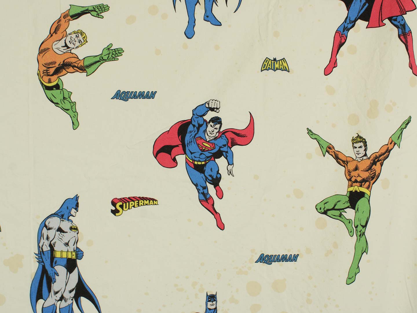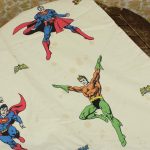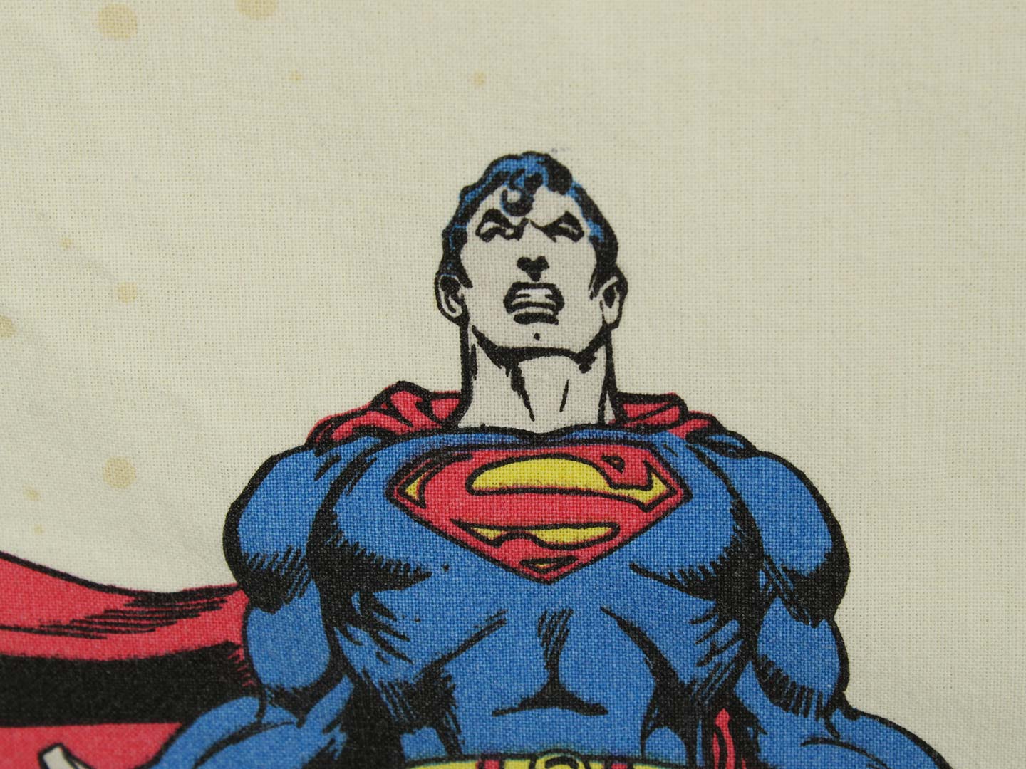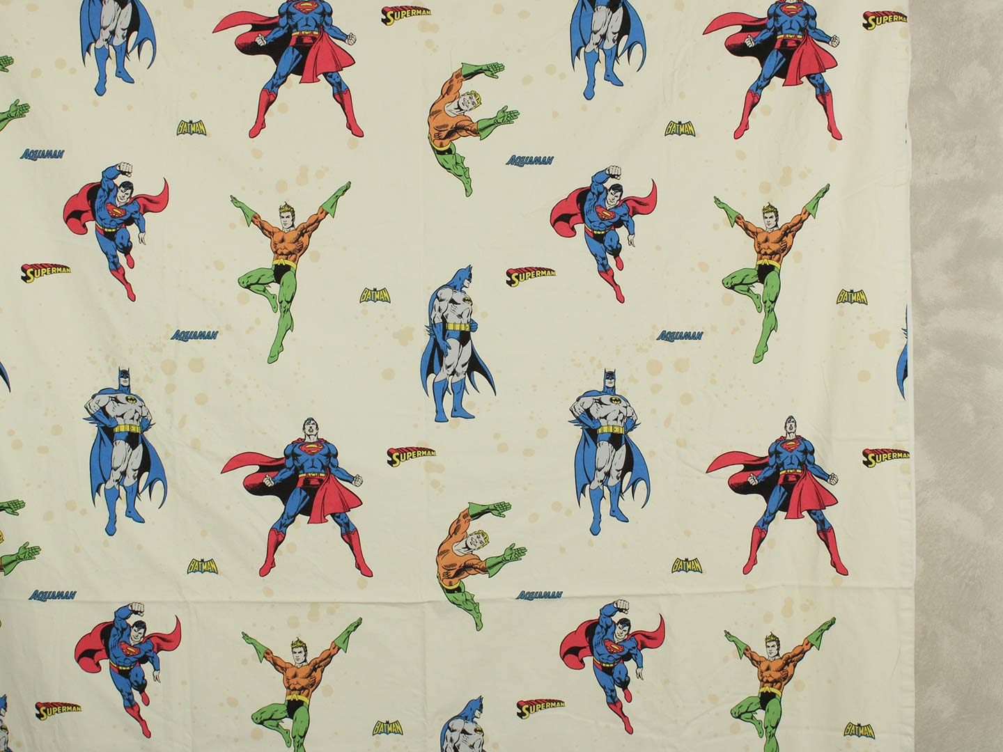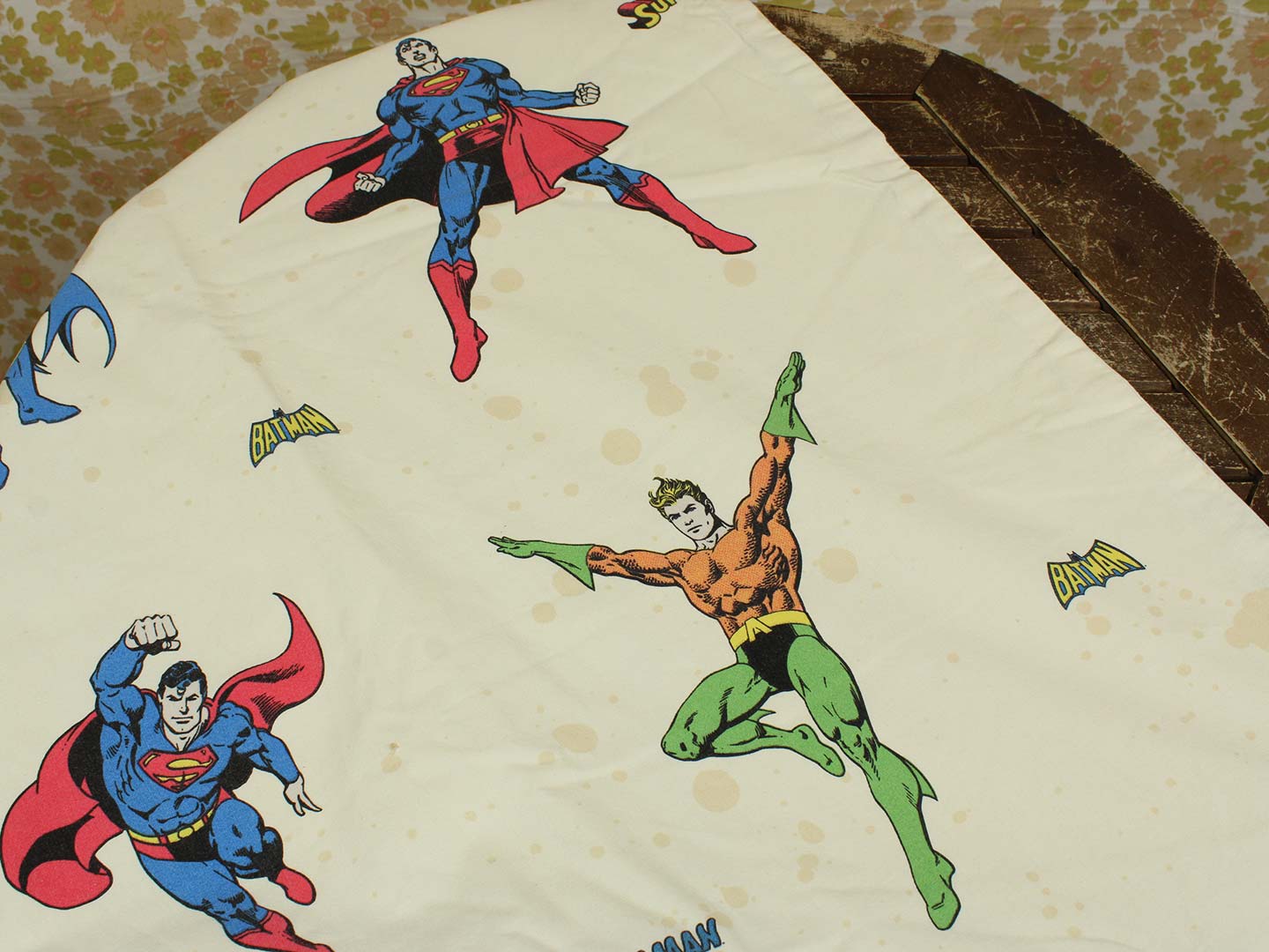 スーパーマン、バットマン、アクアマンのデザインされたお布団カバーです。様々なポーズのキャラクター達とロゴがかっこいいデザイン。背景には水しぶきのような模様が入っています。片面は無地白色です。しっかりとした生地で仕立てられたハンドメイド品のようです。