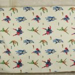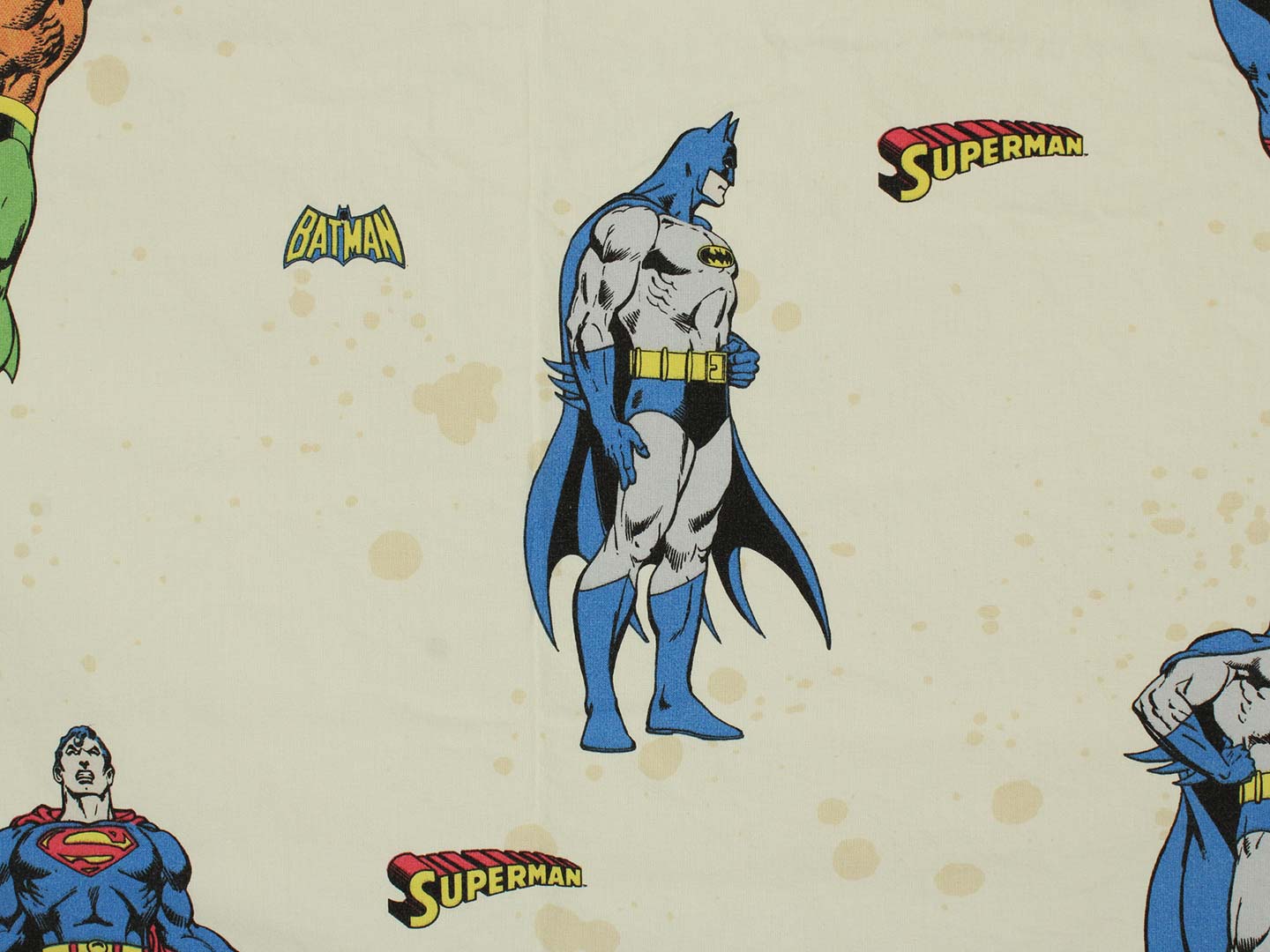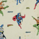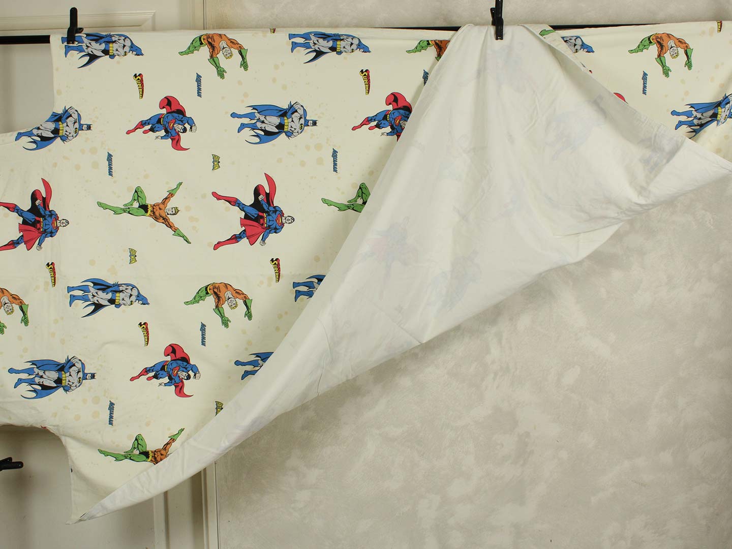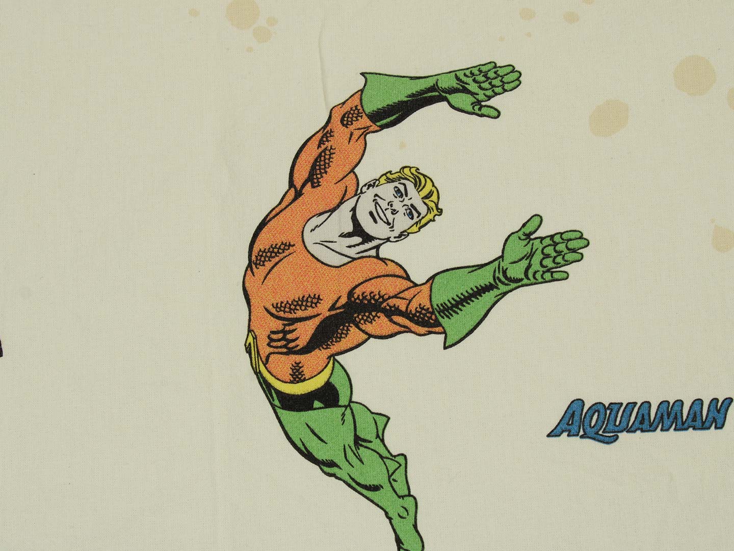スーパーマン、バットマン、アクアマンのデザインされたお布団カバーです。様々なポーズのキャラクター達とロゴがかっこいいデザイン。背景には水しぶきのような模様が入っています。片面は無地白色です。しっかりとした生地で仕立てられたハンドメイド品のようです。