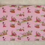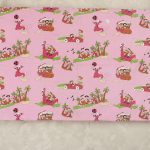 ピンク地にキャラクターがたくさんの、ベビーサイズフラットシーツとピローカバーのベッドセットです。