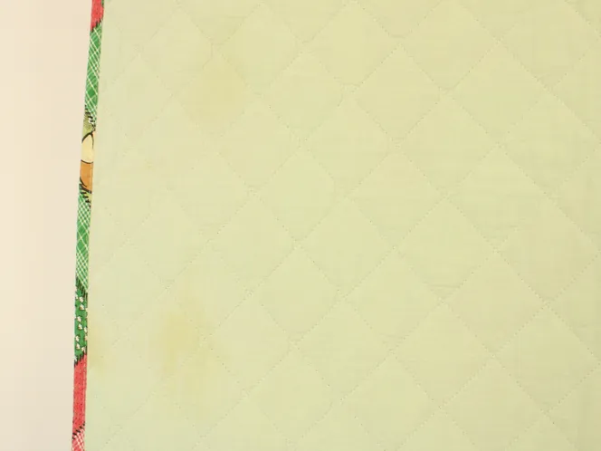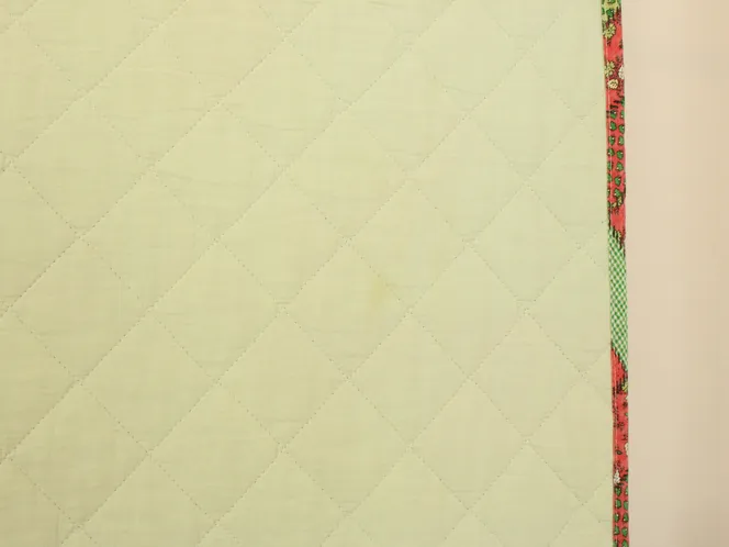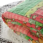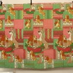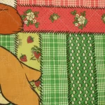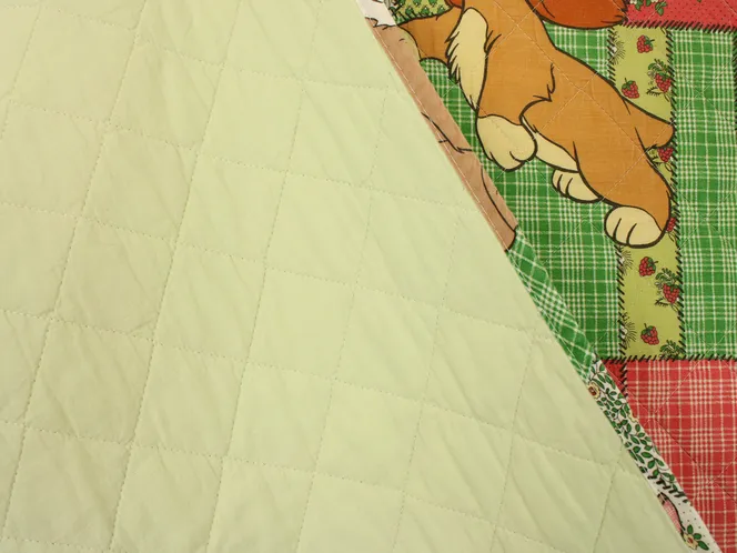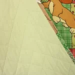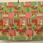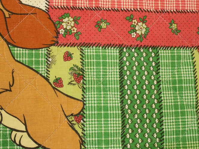 背景は小花やチェック柄のパッチワーク調プリント。3mm程度の厚みのキルト地です。