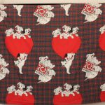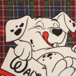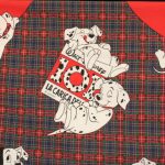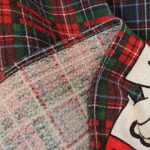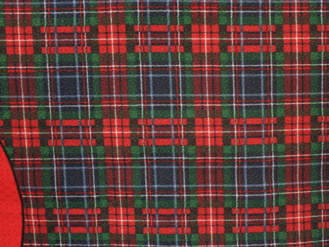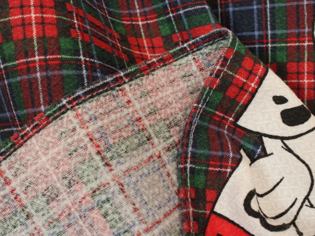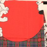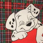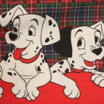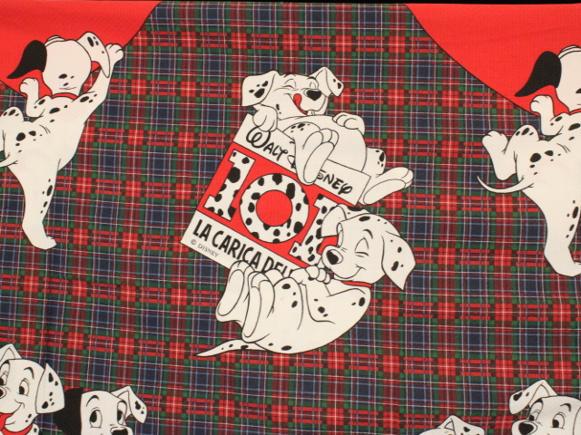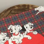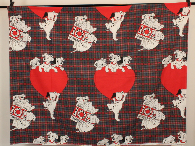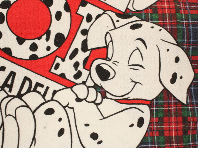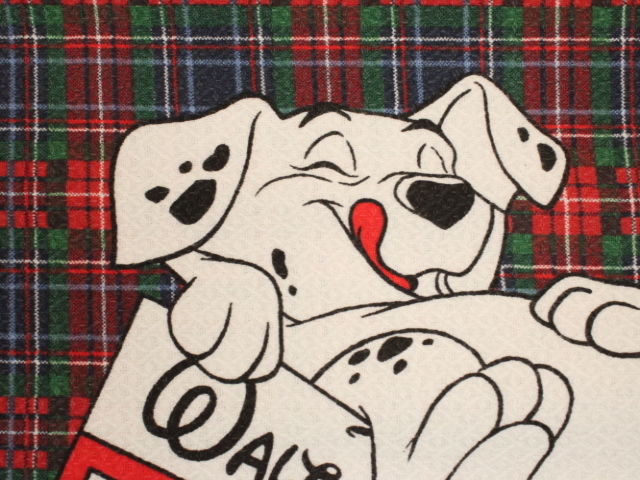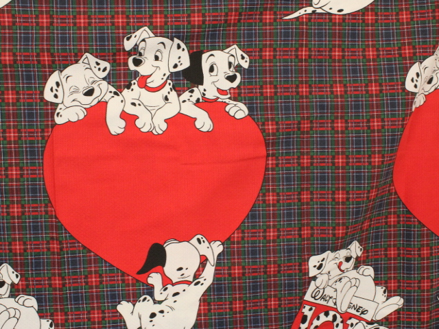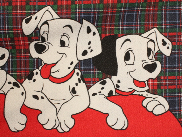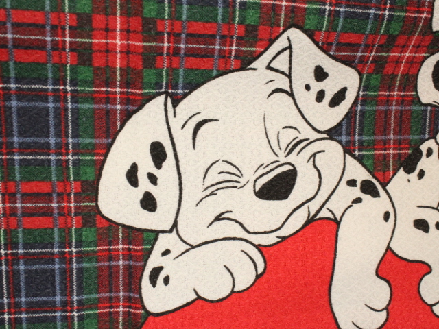 赤と緑のタータンチェックに、大きな絵柄の101匹わんちゃん達のベッドカバーです。全体画像(画像1,2枚め)はそれぞれカバーを2つに折って撮影しています。模様の織り込まれた、薄手のパイル地のような素材です。タオルケットのようにサラッとした手触りなので、季節を問わずお使いいただけると思います。伸縮性はありません。