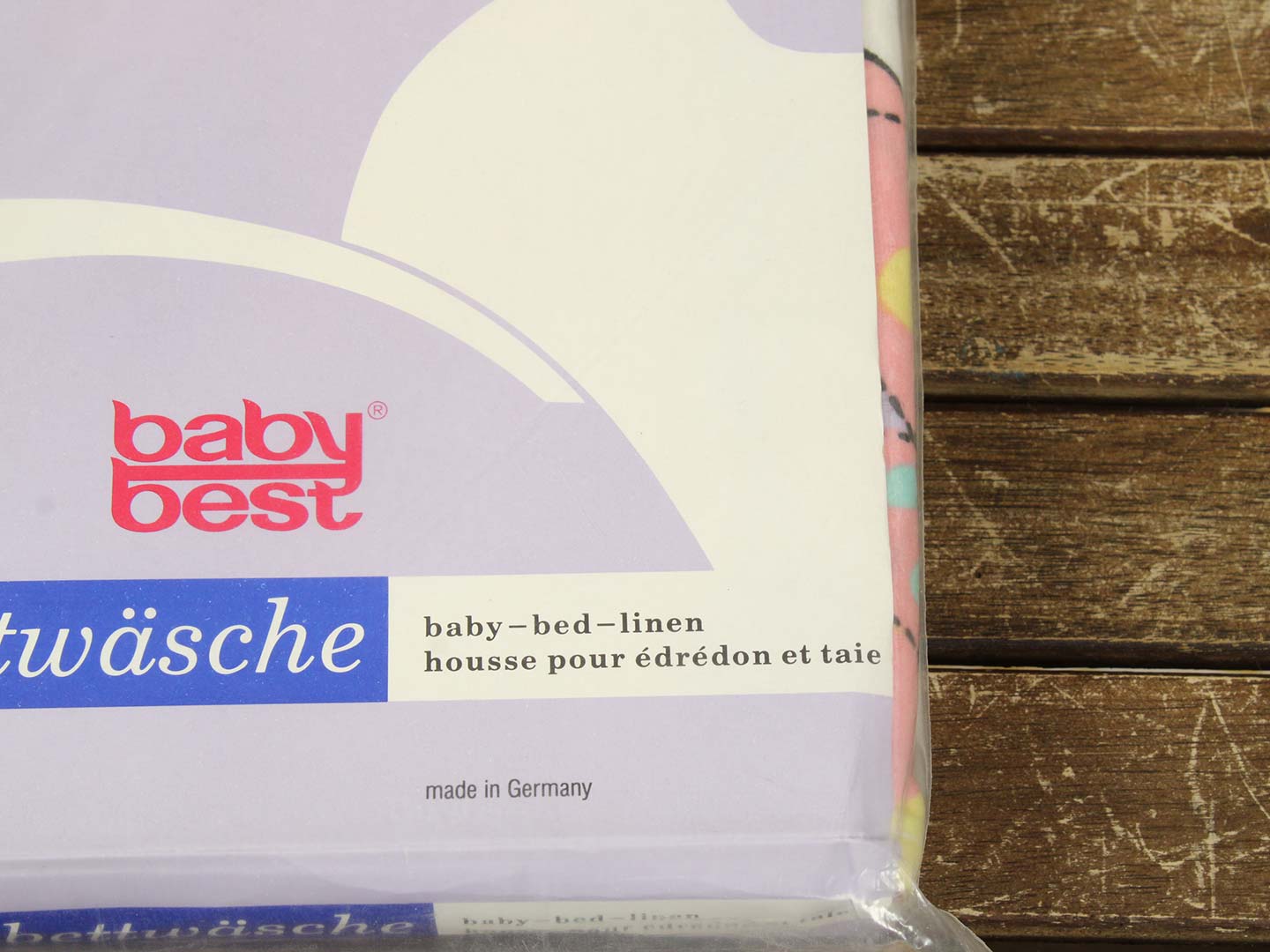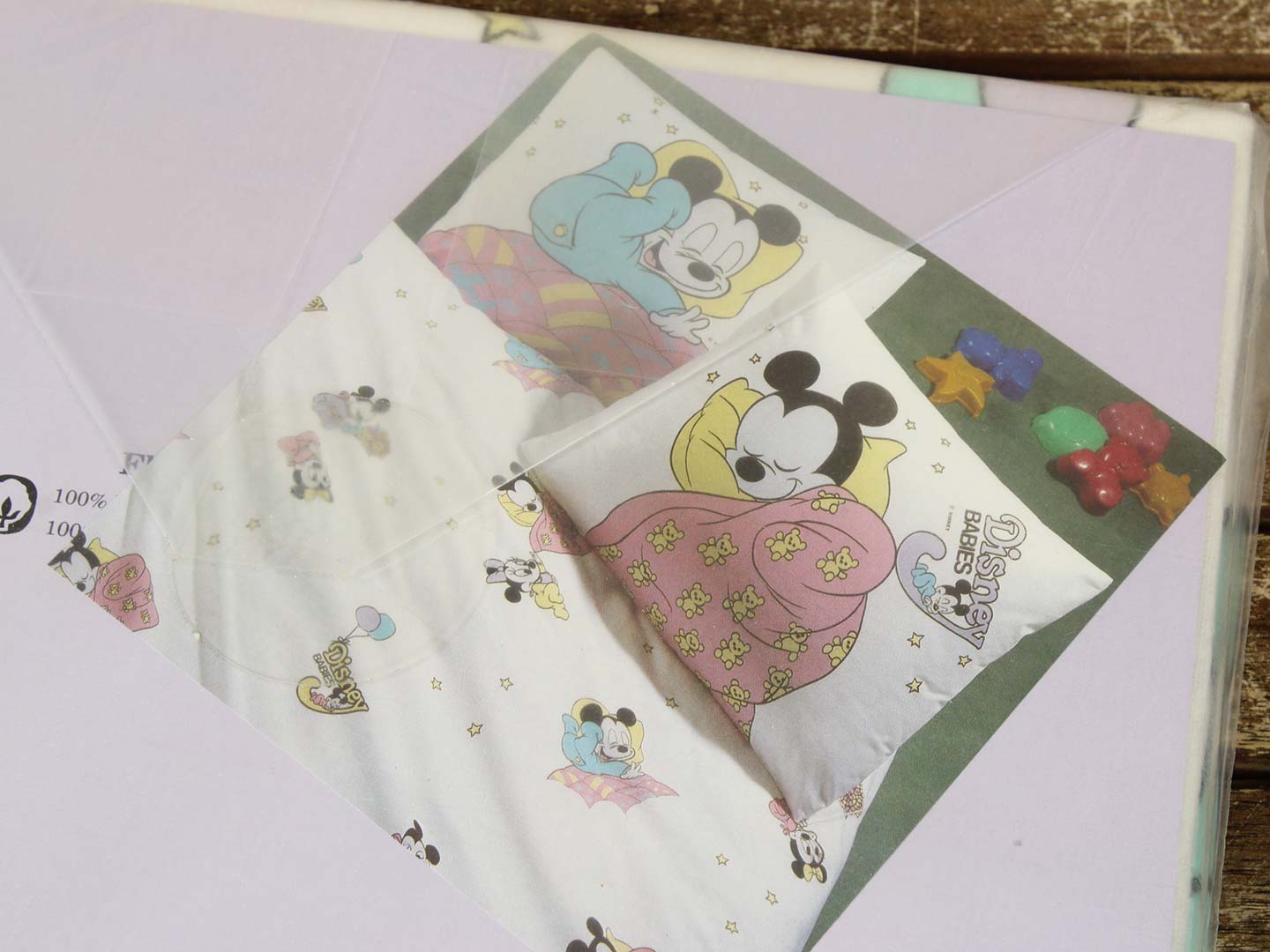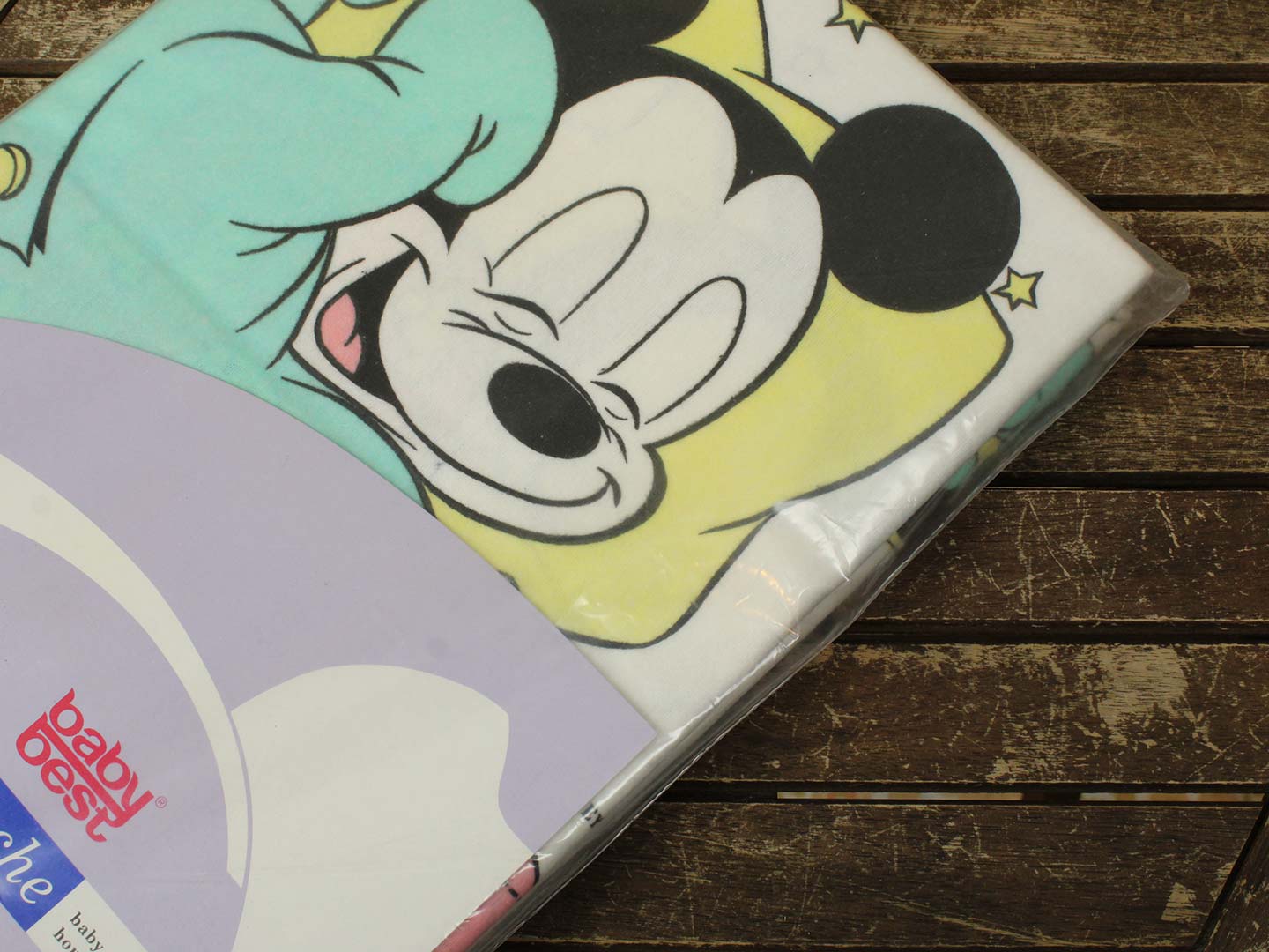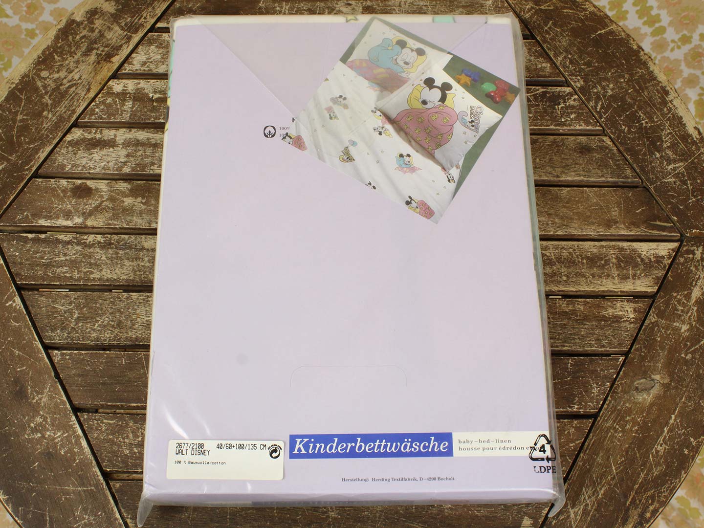 ドイツ製、フランネル生地のベビーサイズお布団カバー&ピローカバーのベッドセットです。レトロ顔のベビーミッキー&ミニー、パステルカラーが可愛らしいデザインです。お布団カバーは両面が同じ絵柄、下部ボタン式。ピローカバーは裏表別柄の大きなミッキーです。絵柄はパッケージをご参照ください。