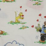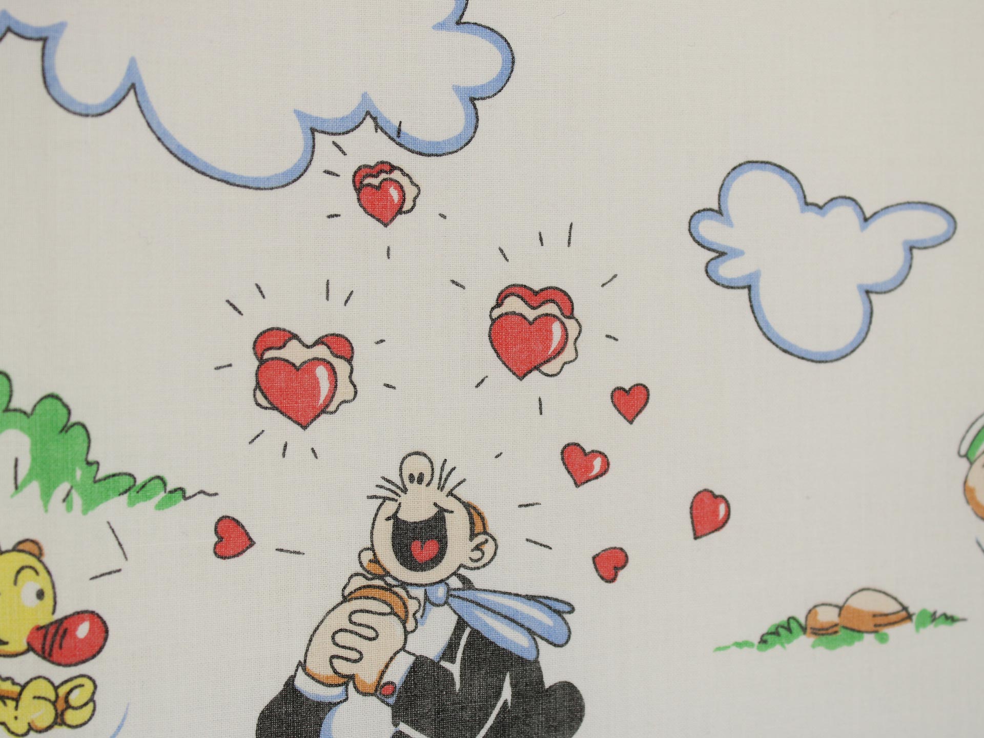 ポパイのキャラクター達と赤いハートが可愛らしい、お布団カバーとフラットシーツのベッドセットです。お布団カバーは片面が大きなポパイ、裏面は小さなキャラクター達がたくさんいるデザインです。下部折込み式。フラットシーツは1枚もので、全体画像(1,2枚め)はそれぞれシーツを2つ折りにしています。シーツの一端のみに絵柄があります。薄手のコットン製で、透け感があります。