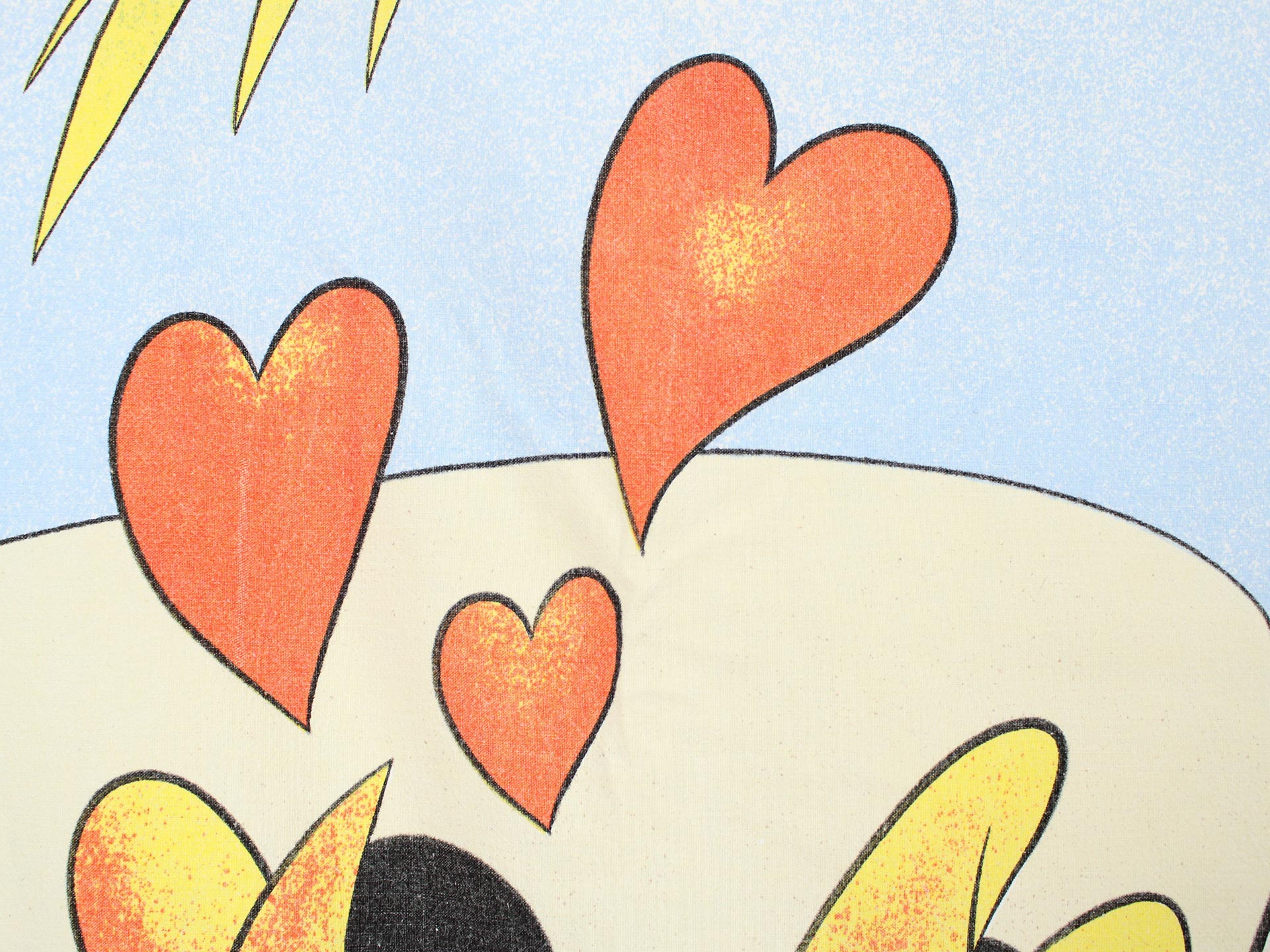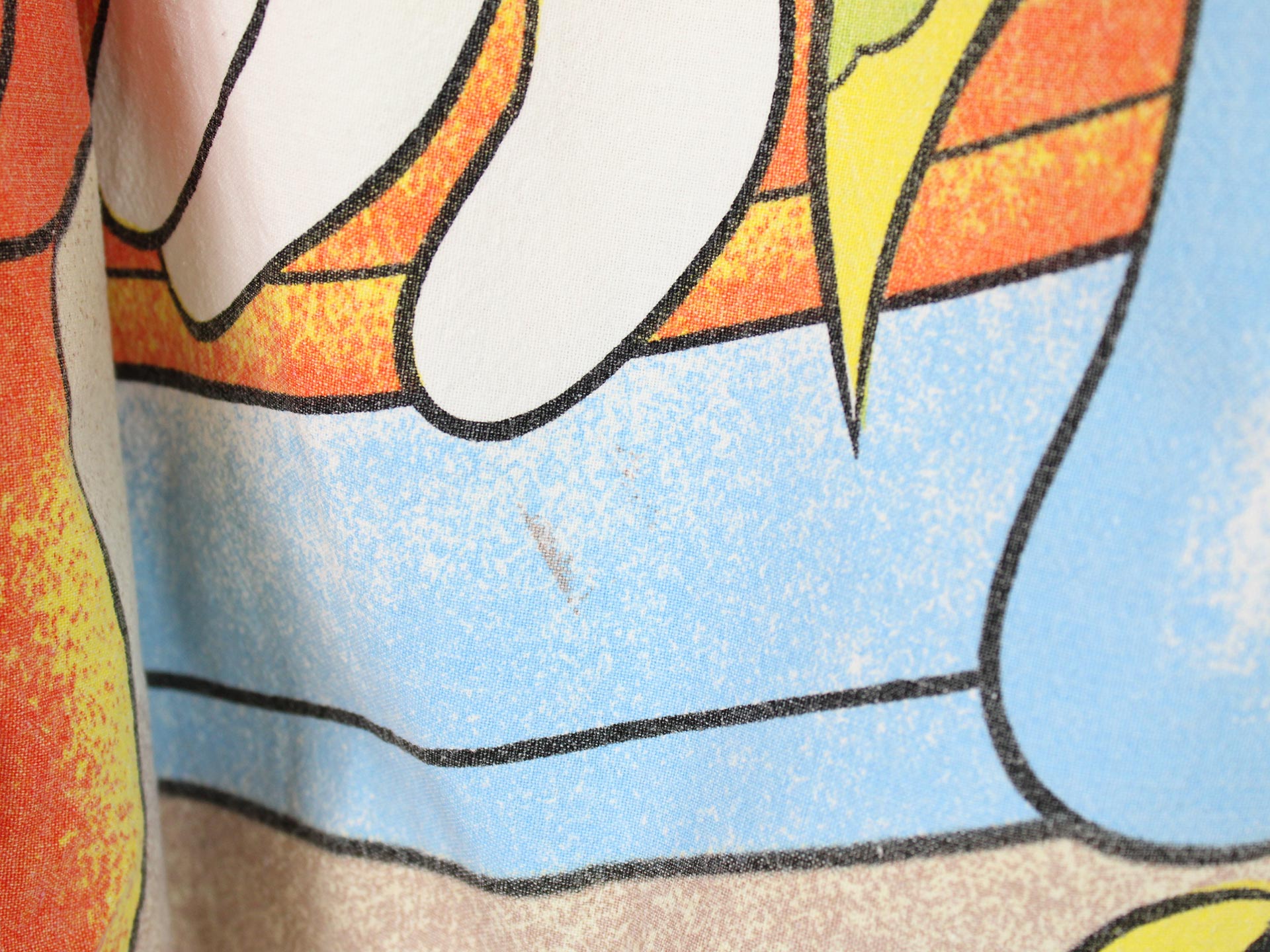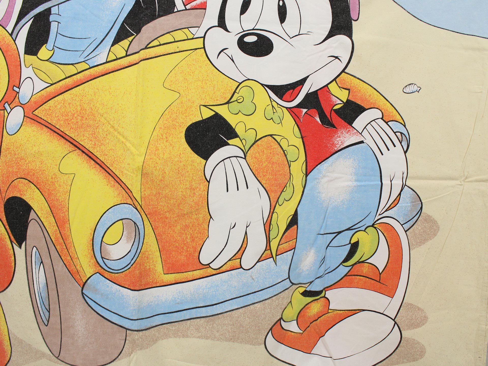 ミッキー&ミニーのサーフィン&ドライブ柄。色鉛筆のようなタッチとレトロな絵柄が可愛らしいお布団カバーとピローカバーのベッドセットです。しっかりとした厚手の生地で仕立てられており、生地表面の擦れが感じられますが概ね良い状態です。