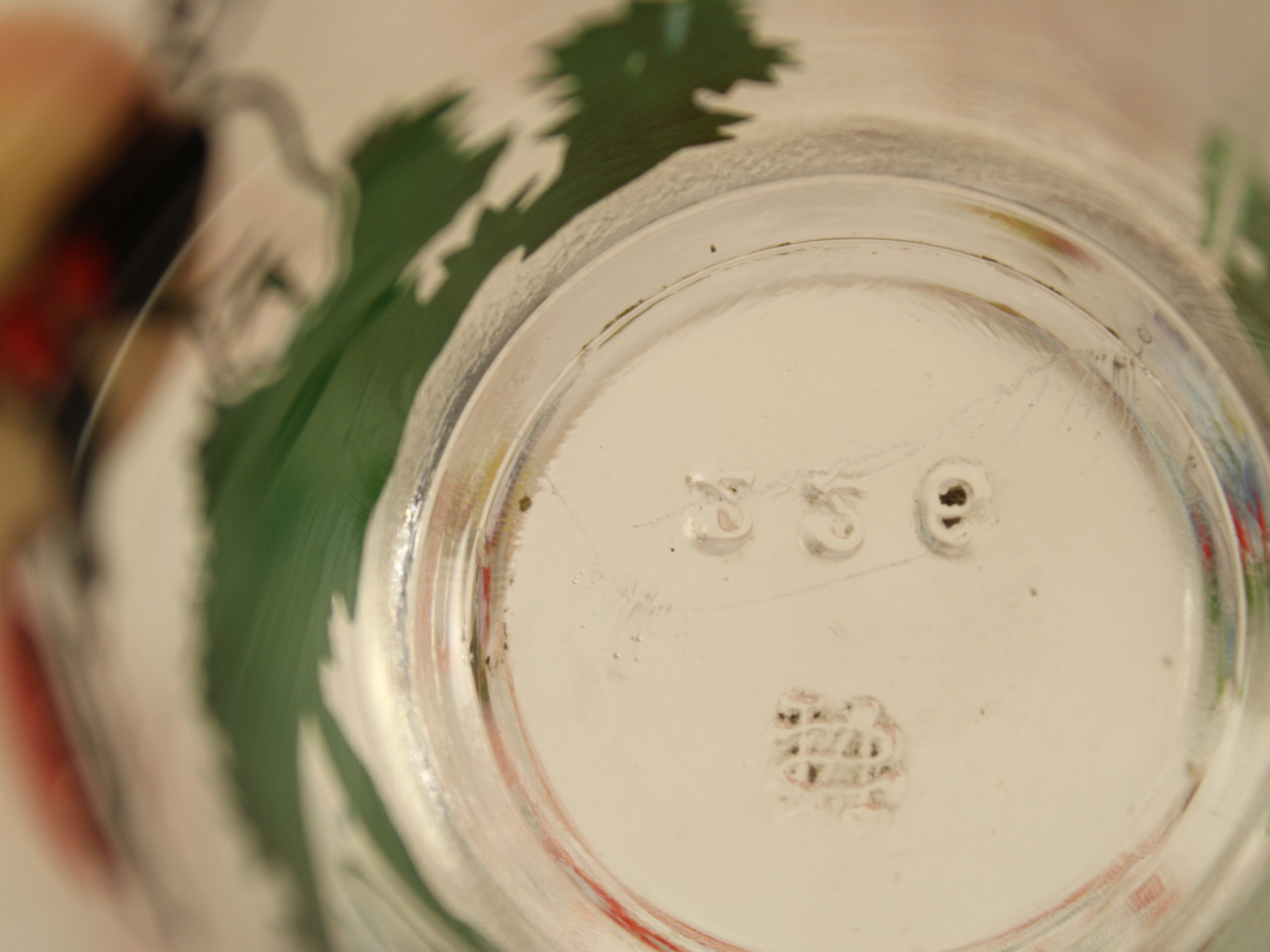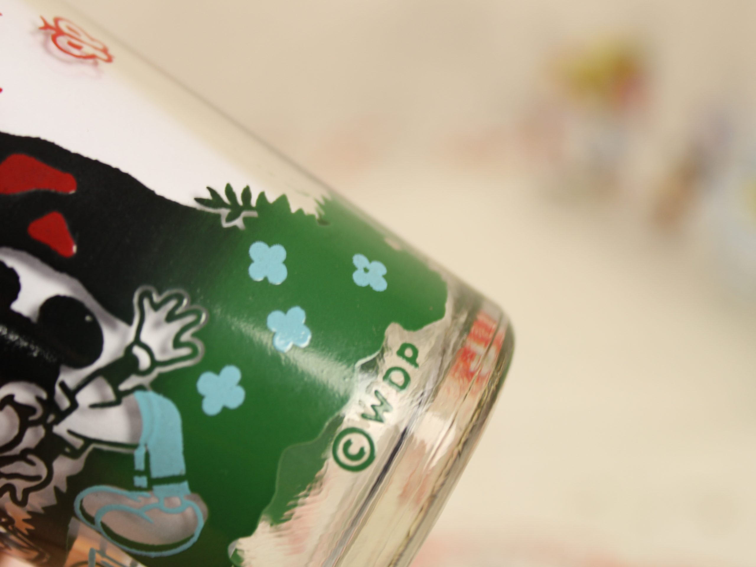 ペイントの剥がれは少なく、コピーライトの横あたりに1ヶ所見られる程度です。欠けやヒビはありません。写真にうつらない細かな傷、擦れが見られます。また、底の内側、外側に製造むらと思われる白い線があります。