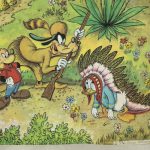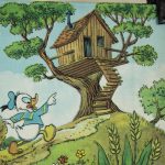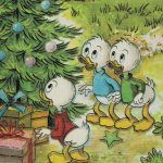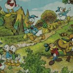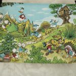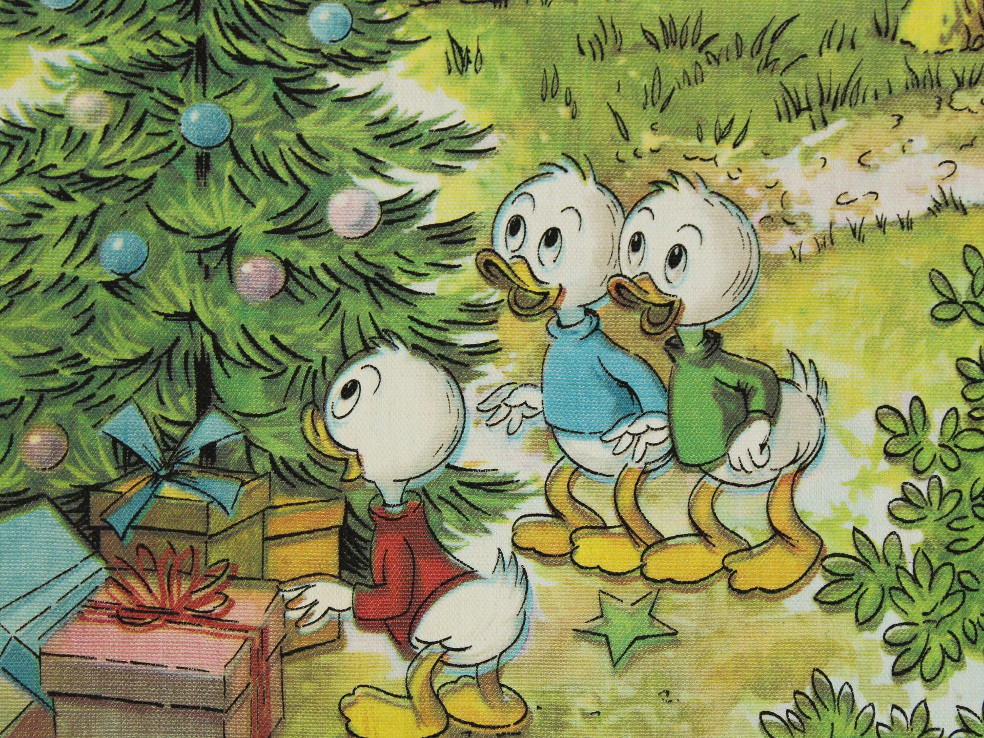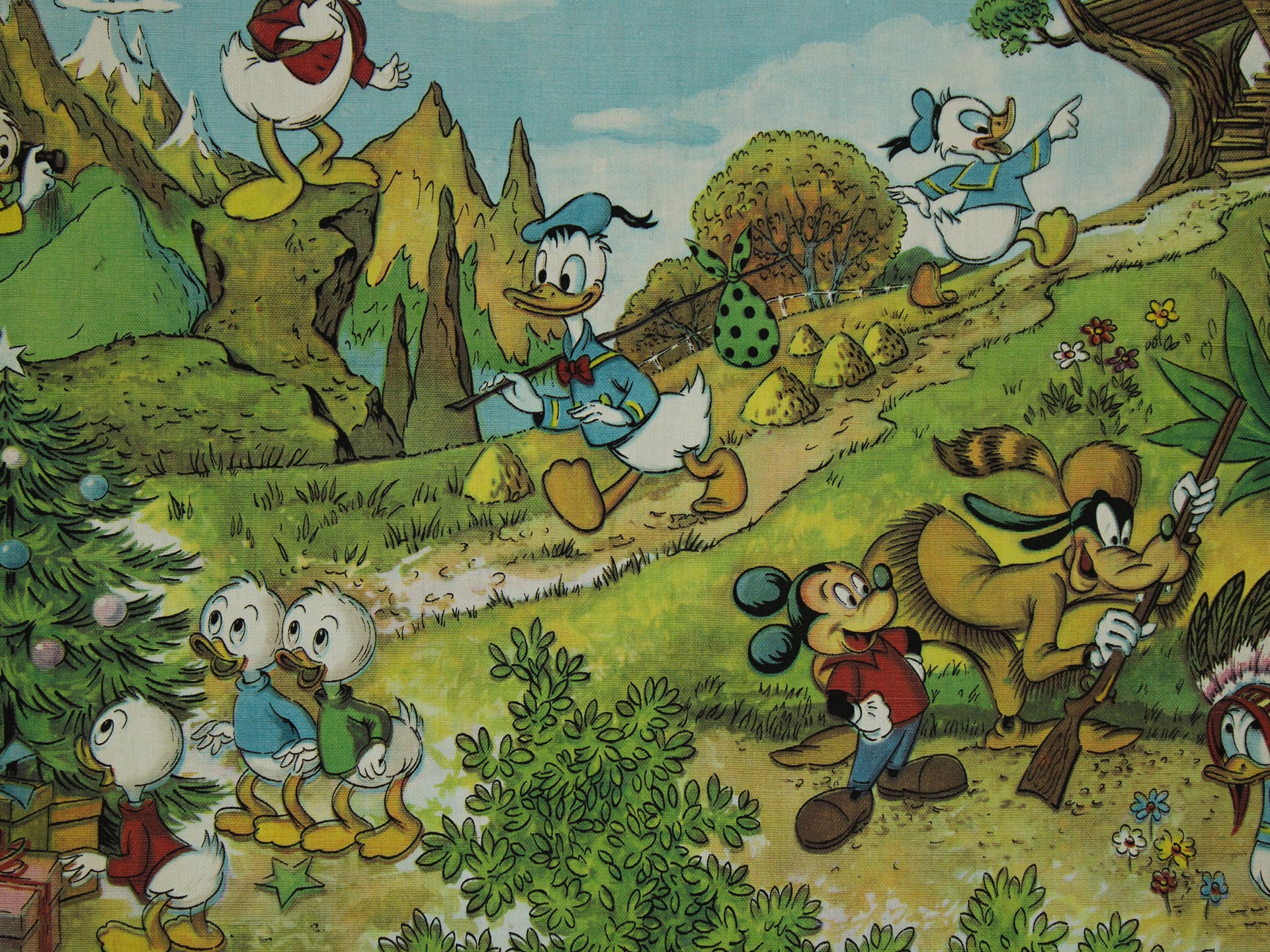 ミッキー、ドナルド、グーフィーの仲良し三人組と、ドナルドの甥っ子たちが描かれています。クリスマスやアルピニスト、インディアンの仮装など、楽しげな雰囲気です。