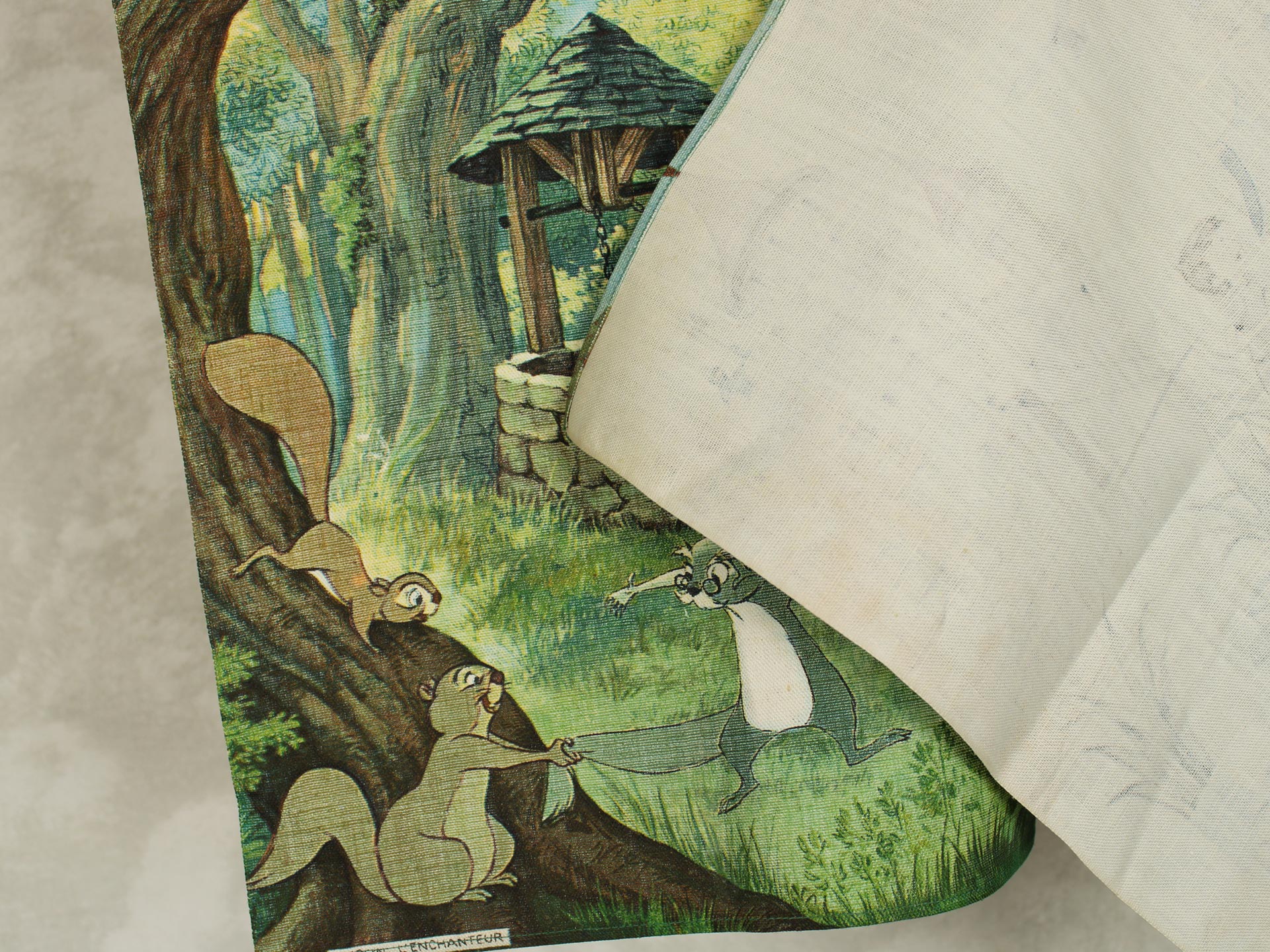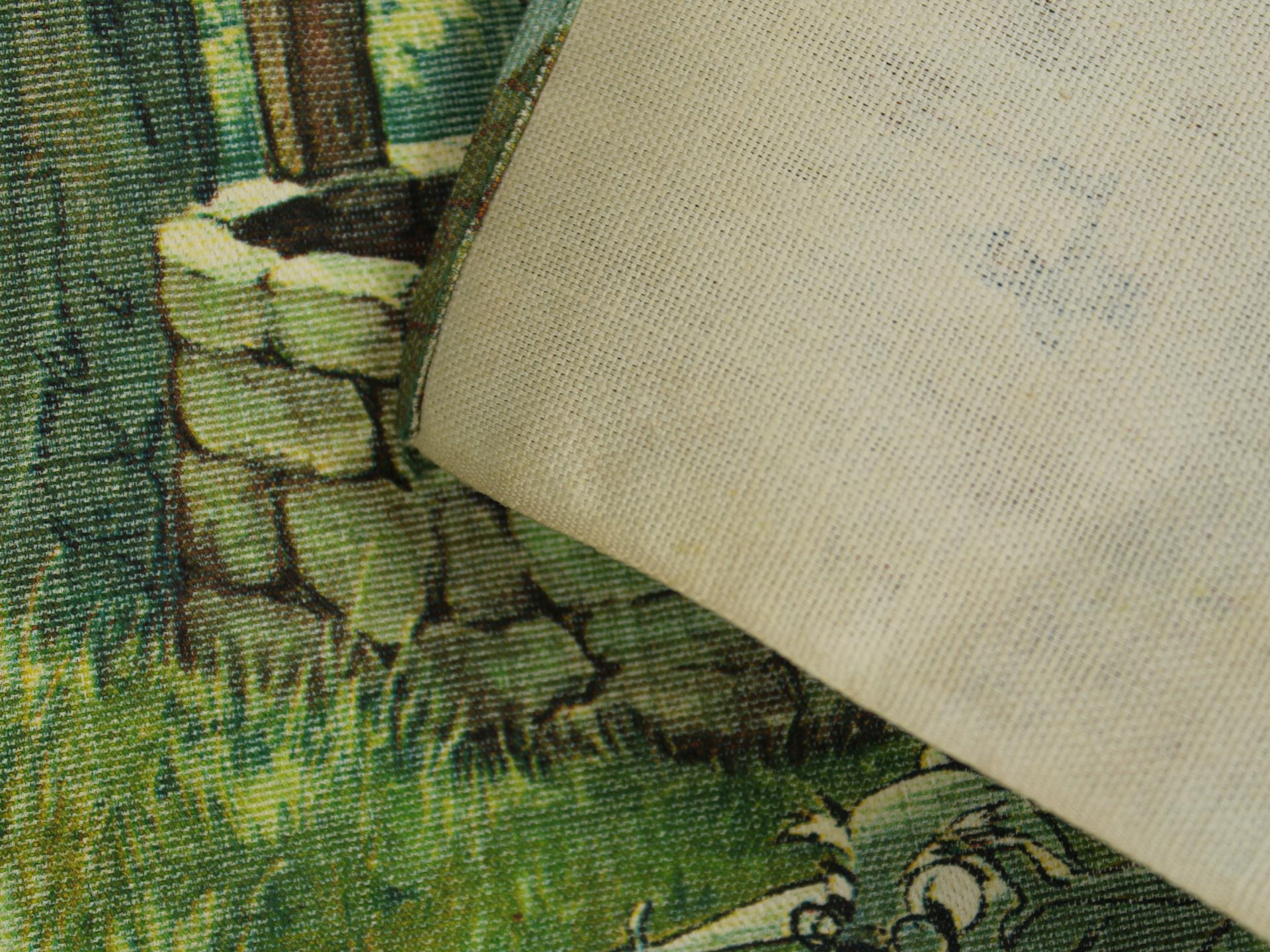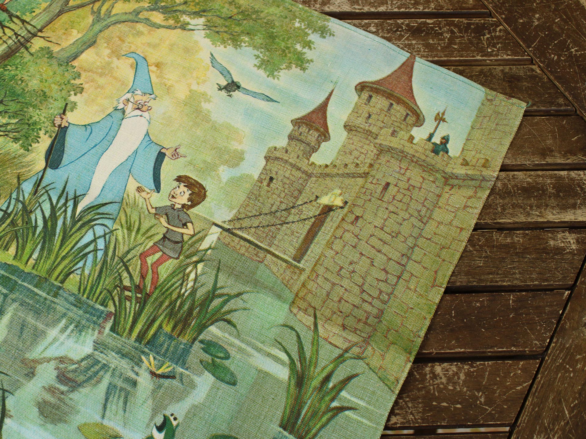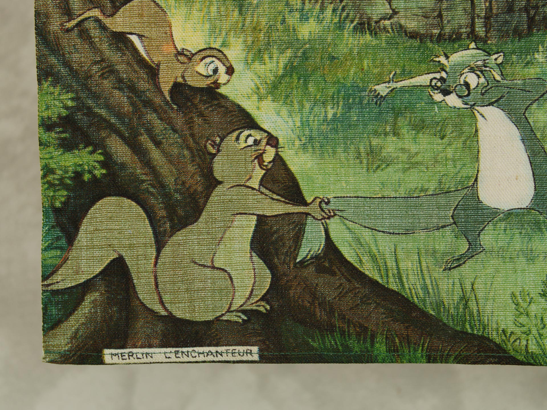 若き日のアーサー王と魔法使いのマーリン、楽しげな動物たちが描かれています。森の情景も生き生きと繊細で、美しい絵画のようなデザイン。透け感のないしっかりとした生地です(7oz程度のようです)。タペストリーとしてお部屋の飾りにいかがでしょうか。