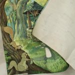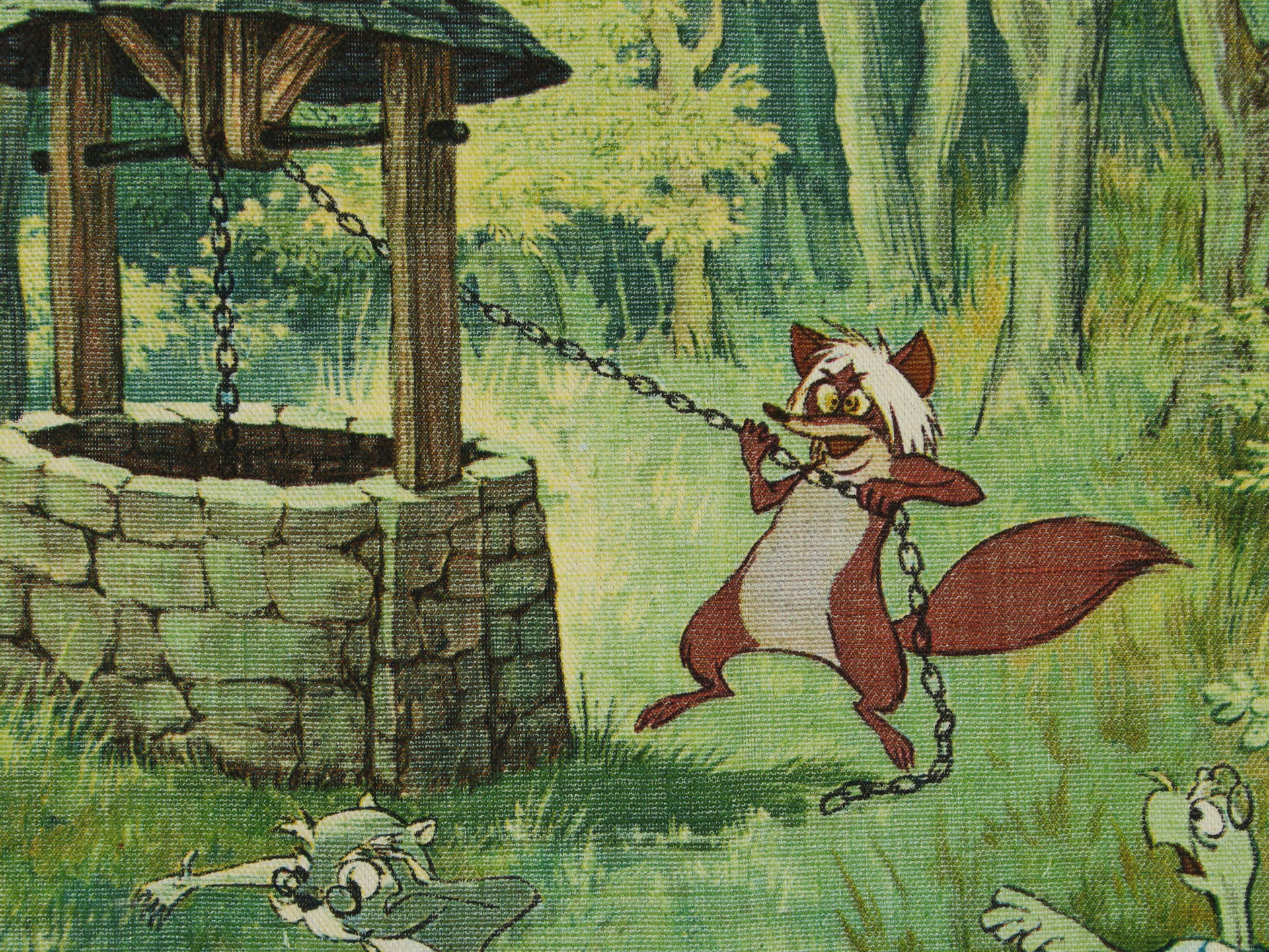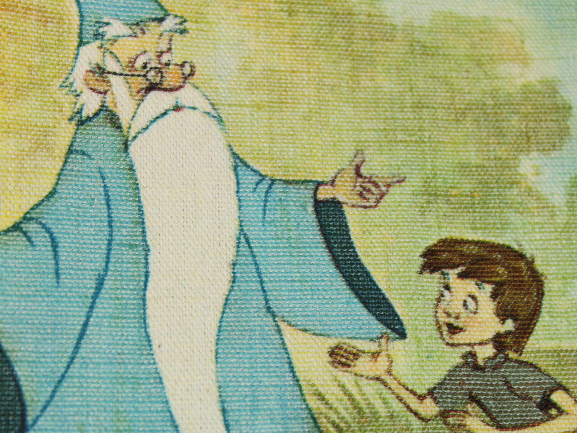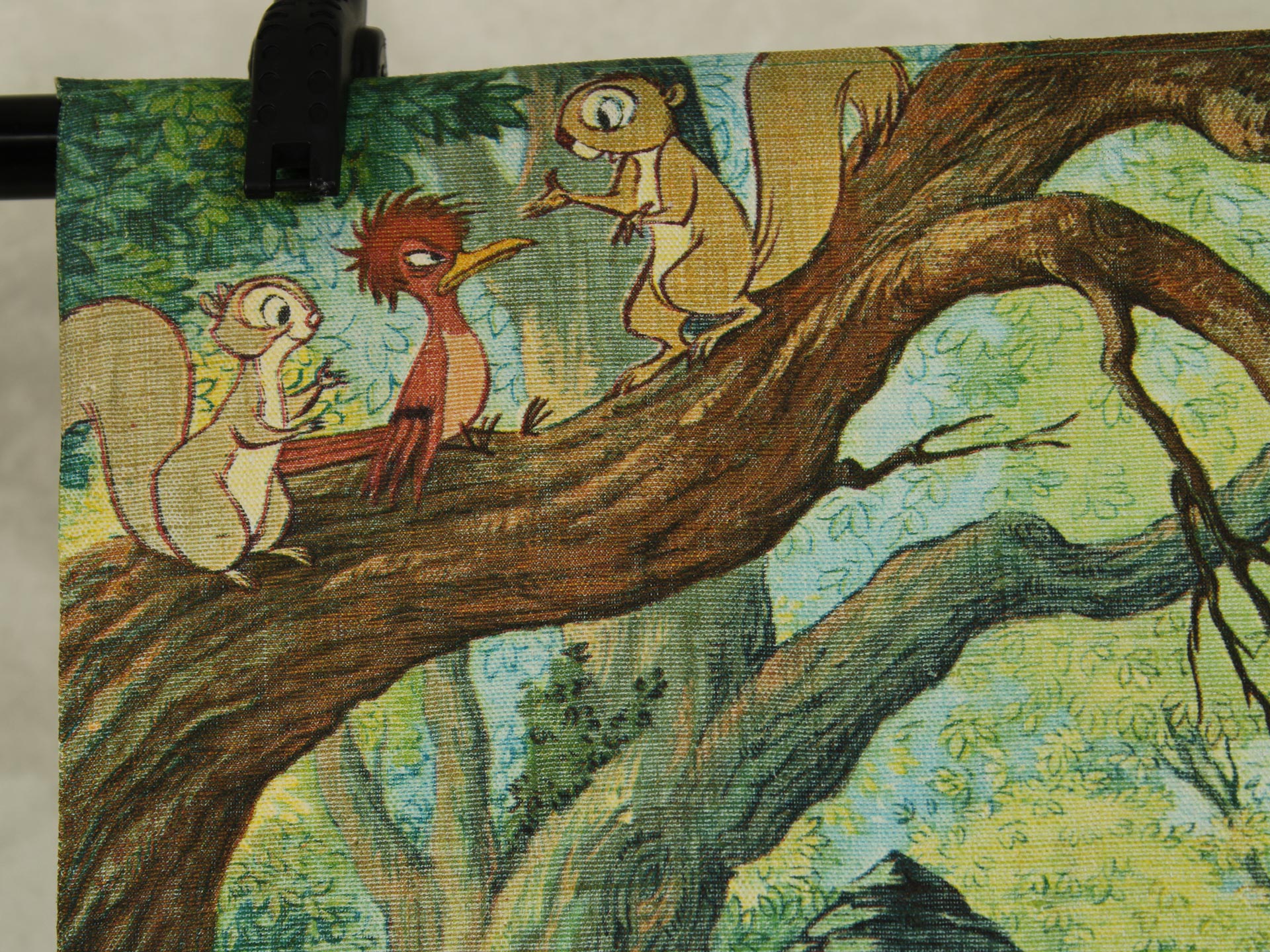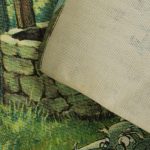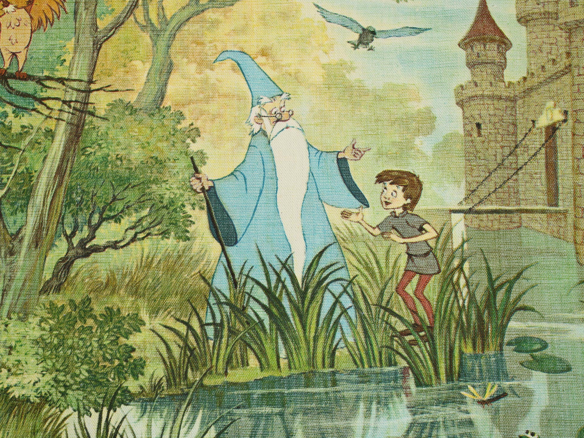 若き日のアーサー王と魔法使いのマーリン、楽しげな動物たちが描かれています。森の情景も生き生きと繊細で、美しい絵画のようなデザイン。透け感のないしっかりとした生地です(7oz程度のようです)。タペストリーとしてお部屋の飾りにいかがでしょうか。