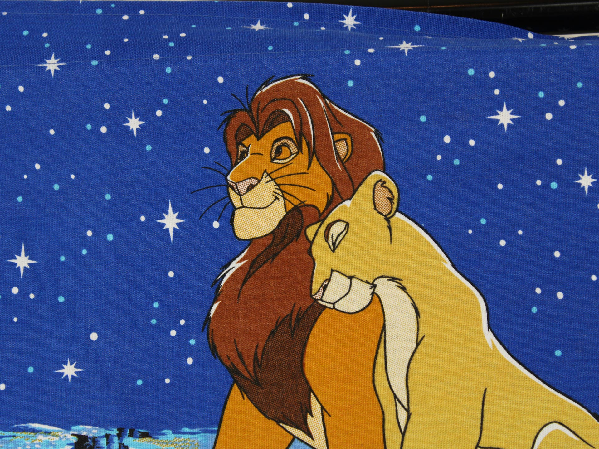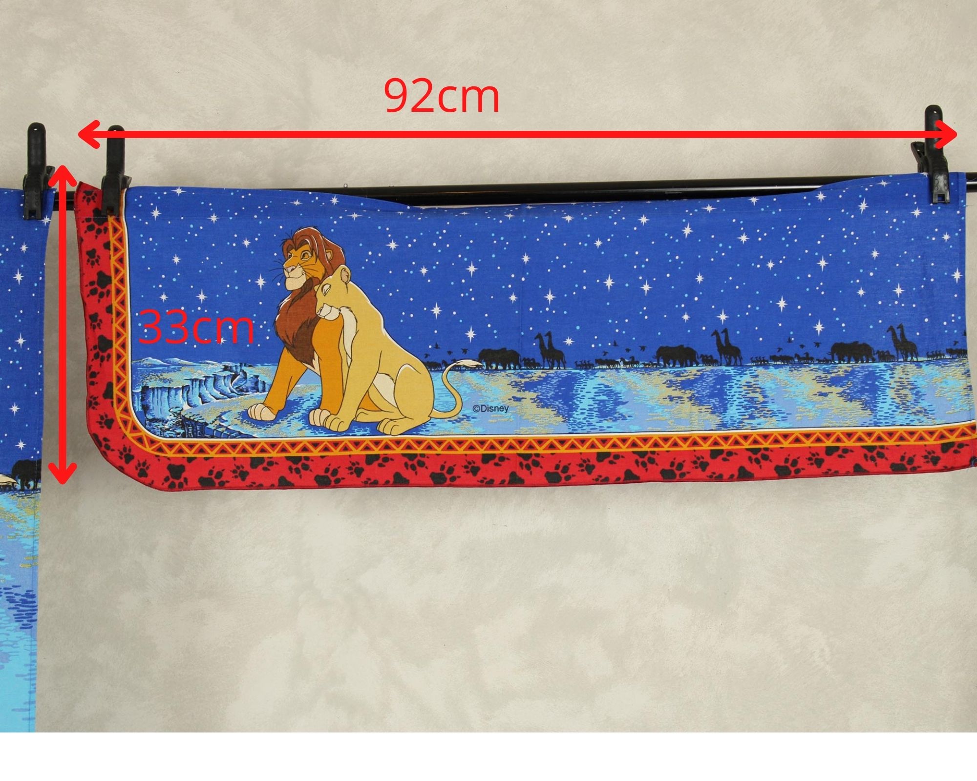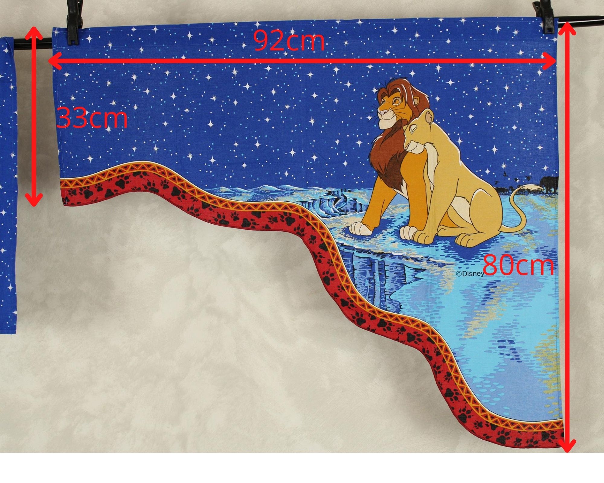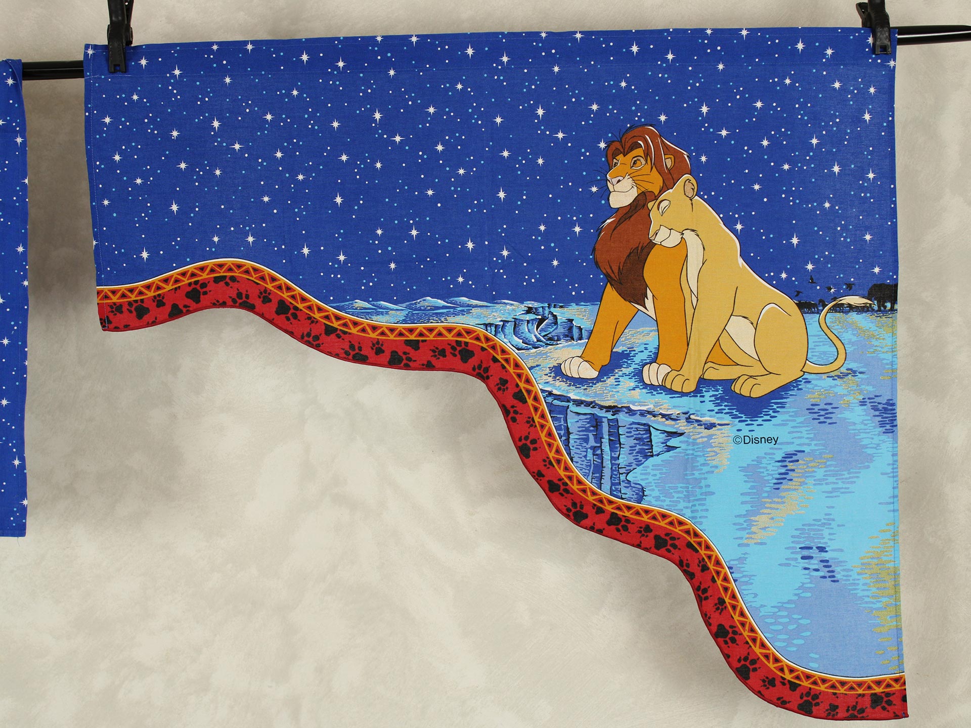 ディズニー、ライオンキング、星空を背景に寄り添う、シンバとナラのカーテン(2枚組)です。1枚は真っ直ぐな形、もう1枚はアシメトリーな波状形です。ロマンチックなお部屋つくりに。