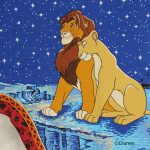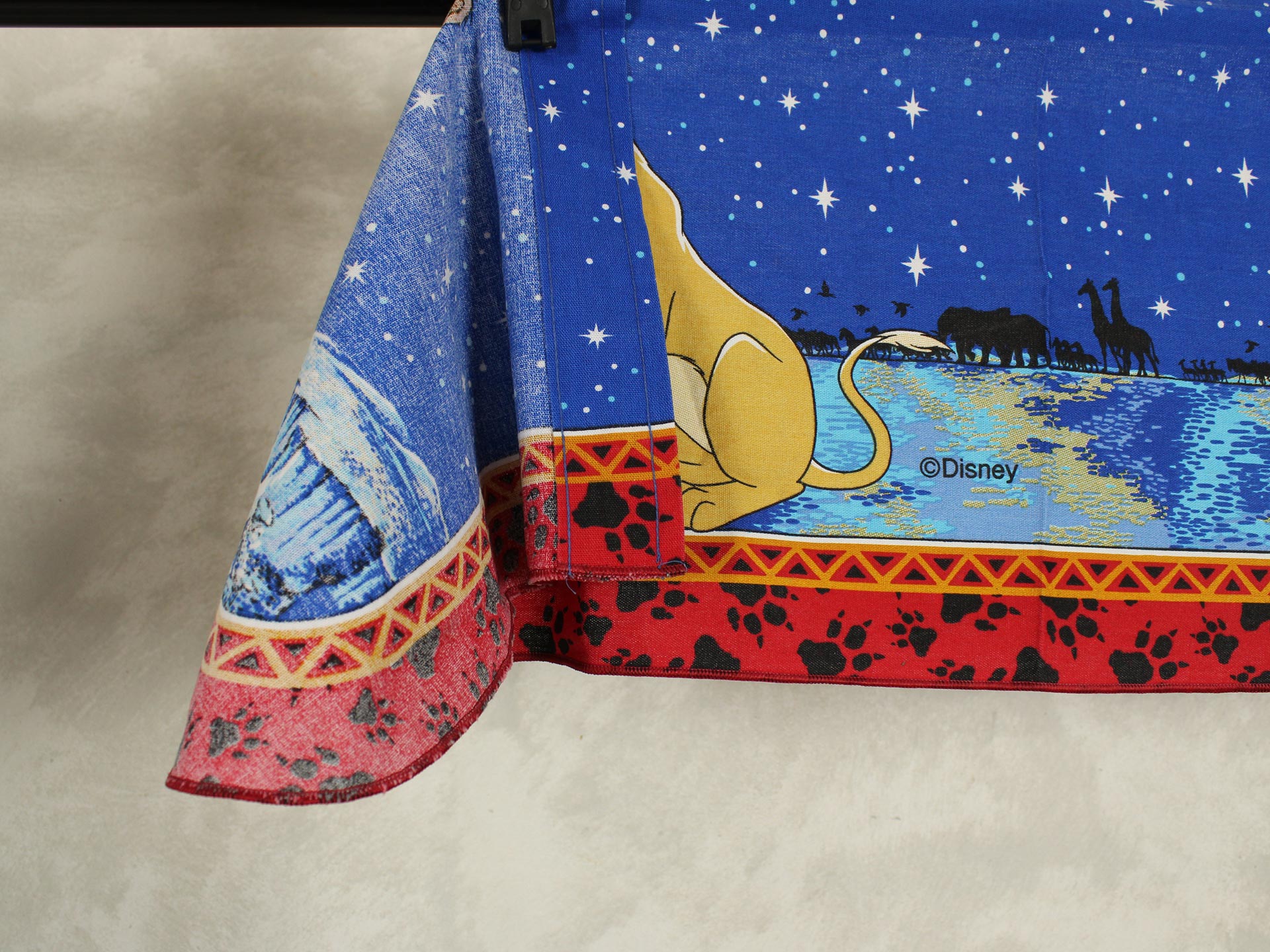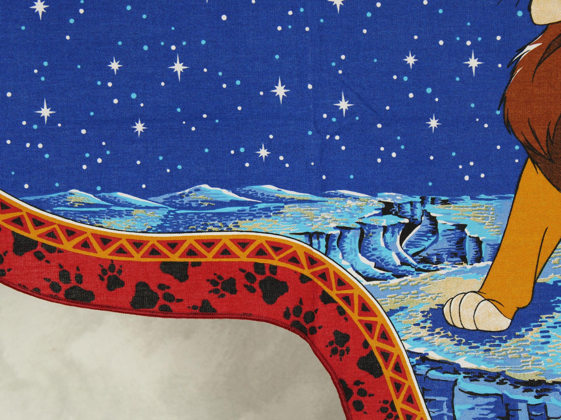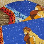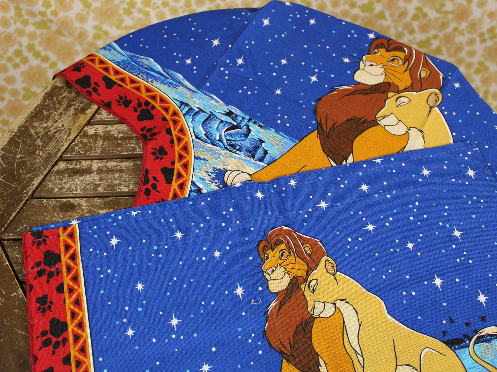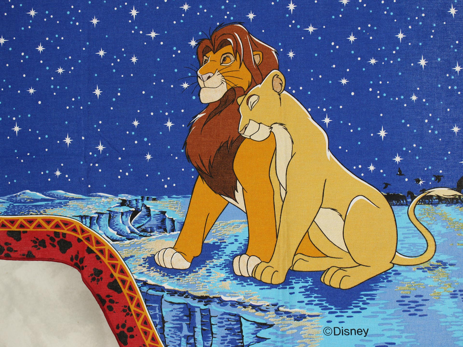 ディズニー、ライオンキング、星空を背景に寄り添う、シンバとナラのカーテン(2枚組)です。1枚は真っ直ぐな形、もう1枚はアシメトリーな波状形です。ロマンチックなお部屋つくりに。