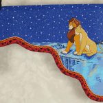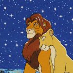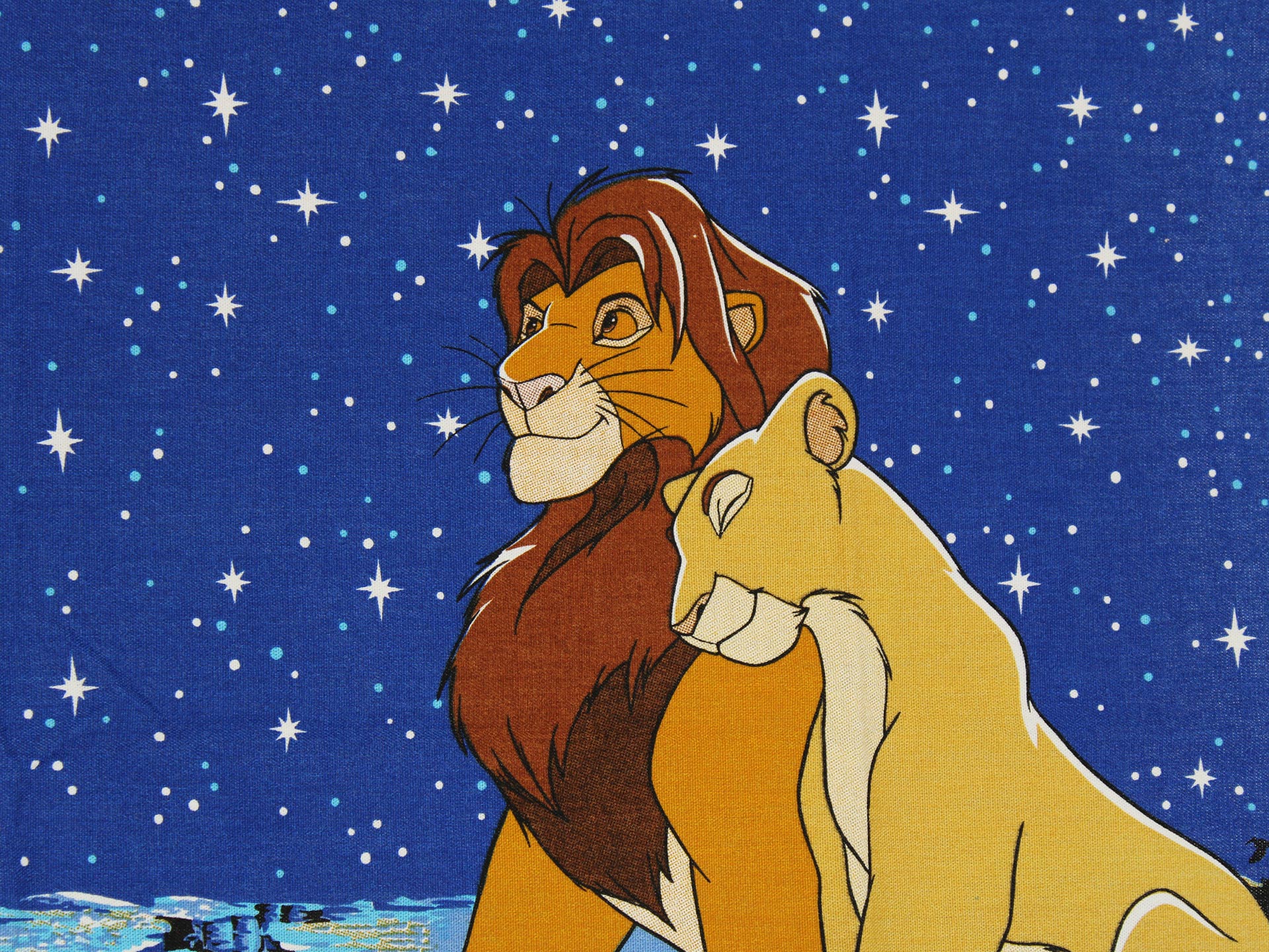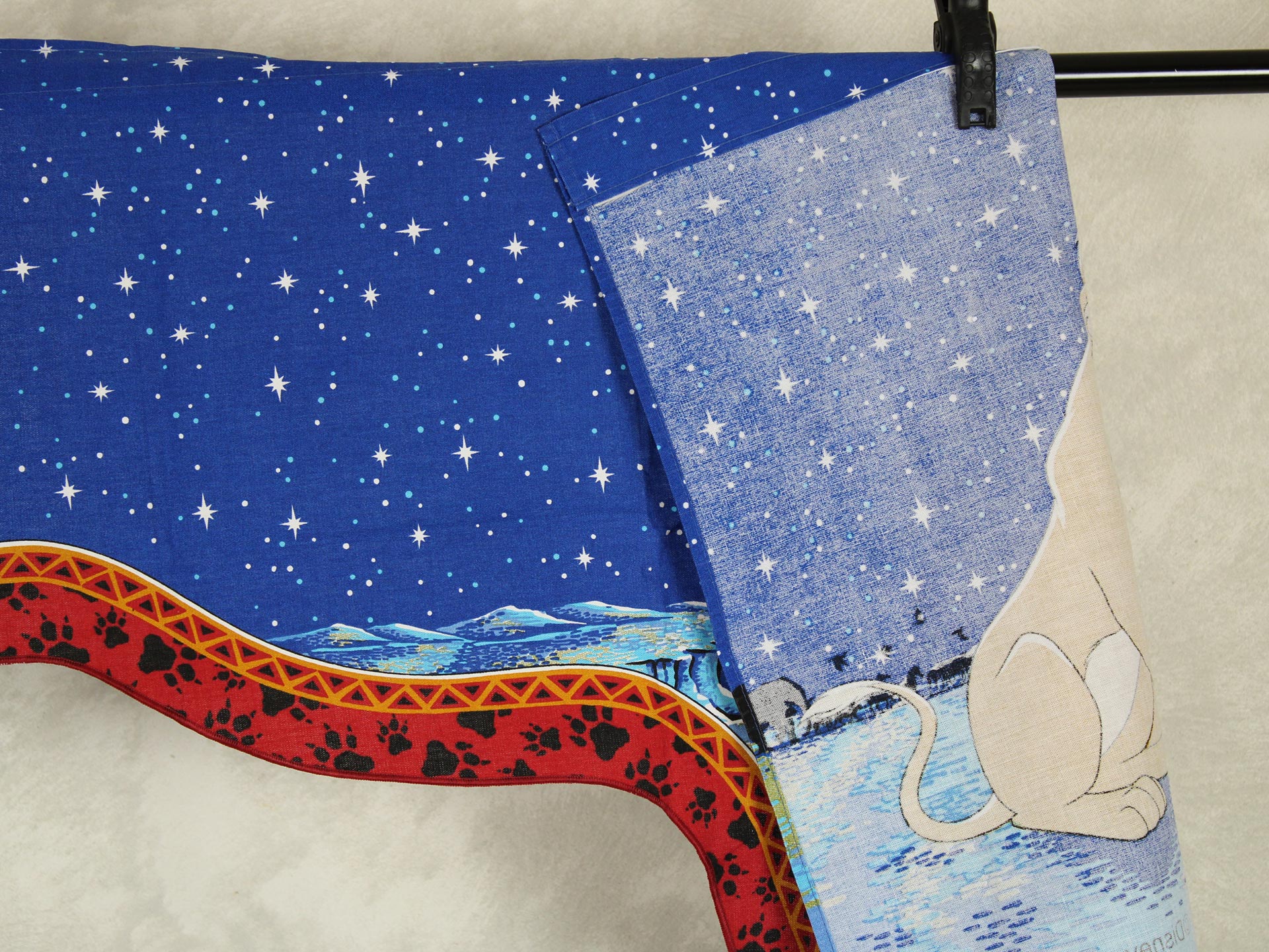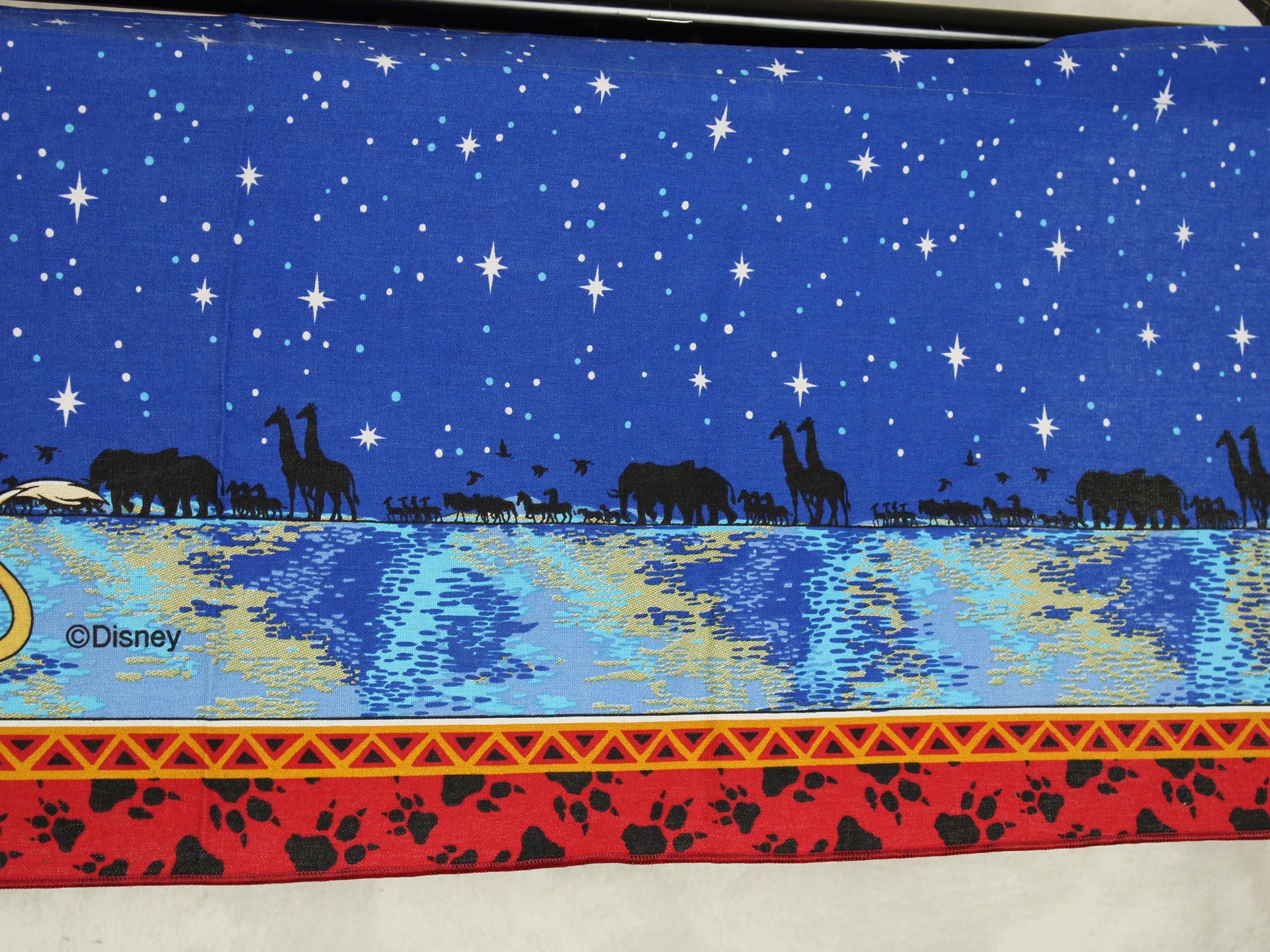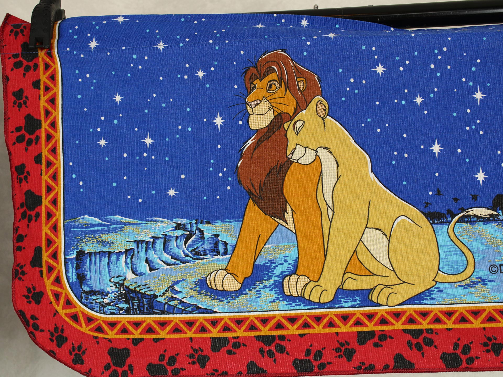 ディズニー、ライオンキング、星空を背景に寄り添う、シンバとナラのカーテン(2枚組)です。1枚は真っ直ぐな形、もう1枚はアシメトリーな波状形です。ロマンチックなお部屋つくりに。