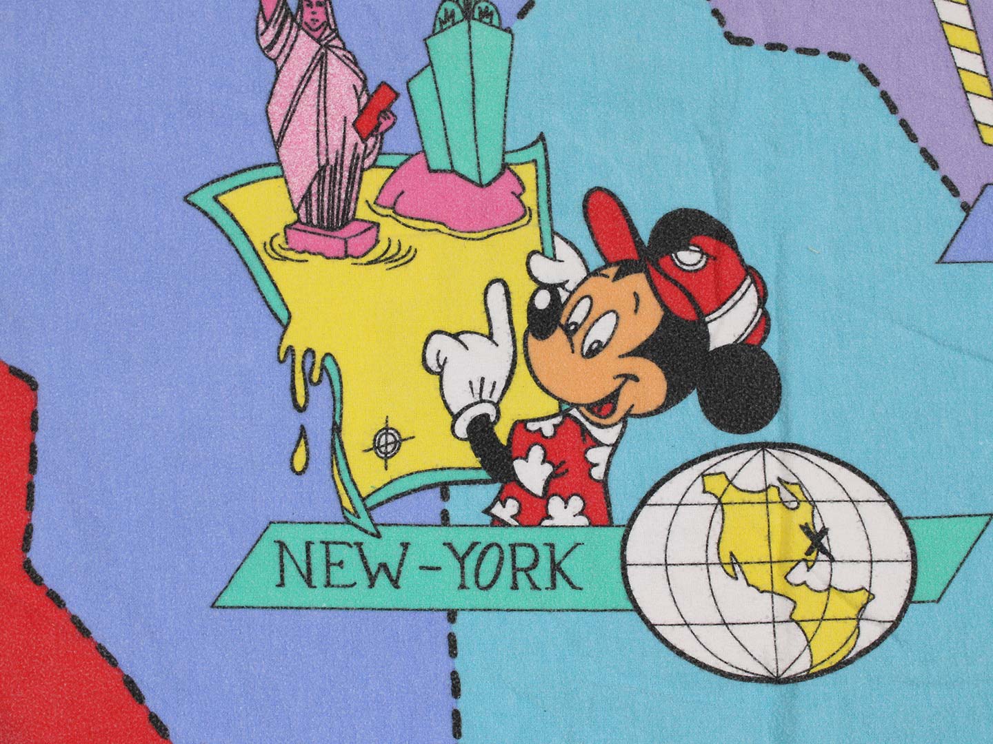 ミッキーの世界一周柄、お布団カバー&ピローカバーのベッドセットです。冬用コットンフランネル製。お布団カバーは両面同じ絵柄、ピローカバーは裏表別柄です。