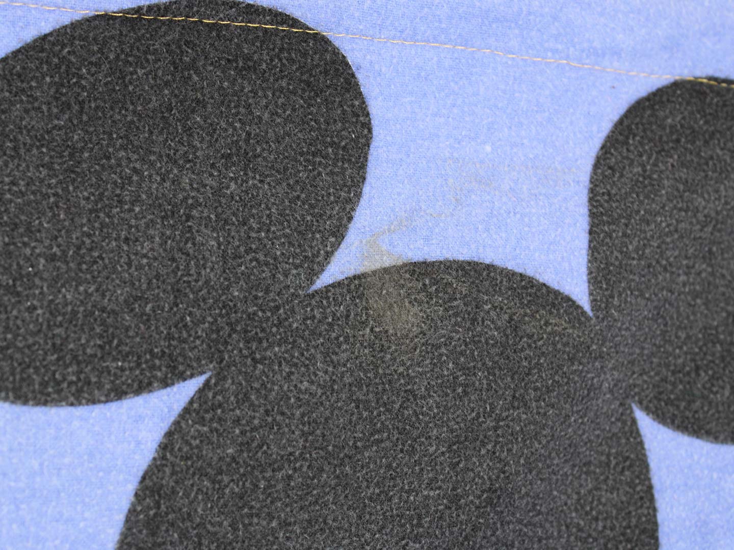 中古品。色落ちは殆ど感じられません。生地表面には毛羽立ちがあります。ピローカバーには汚れがあります。