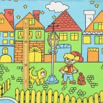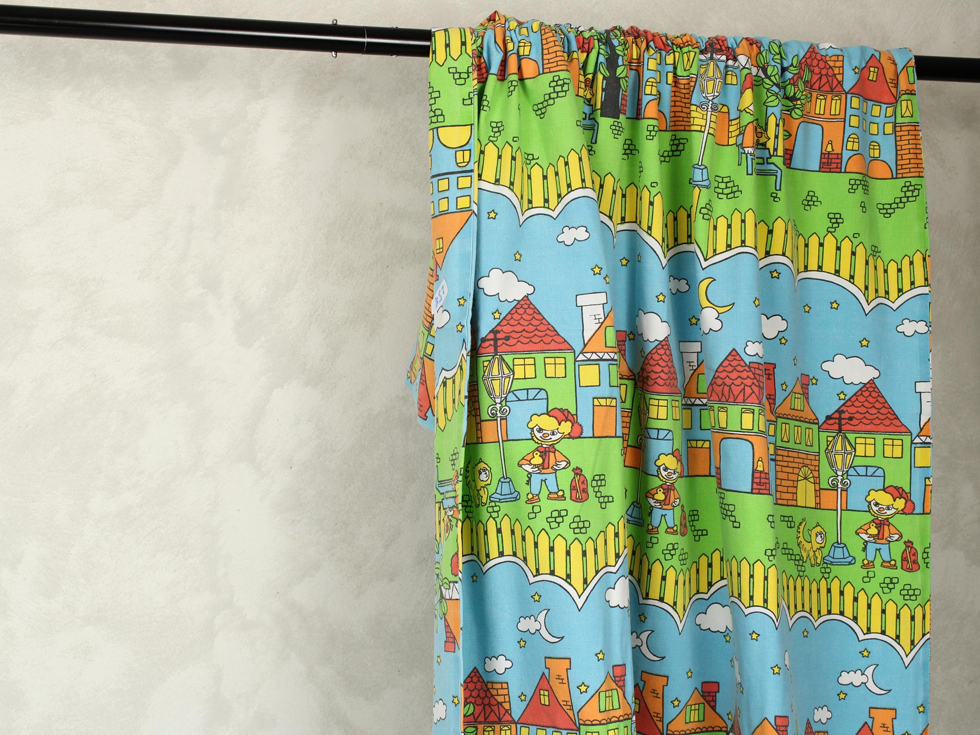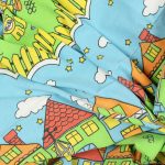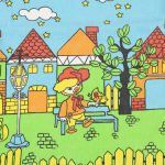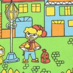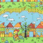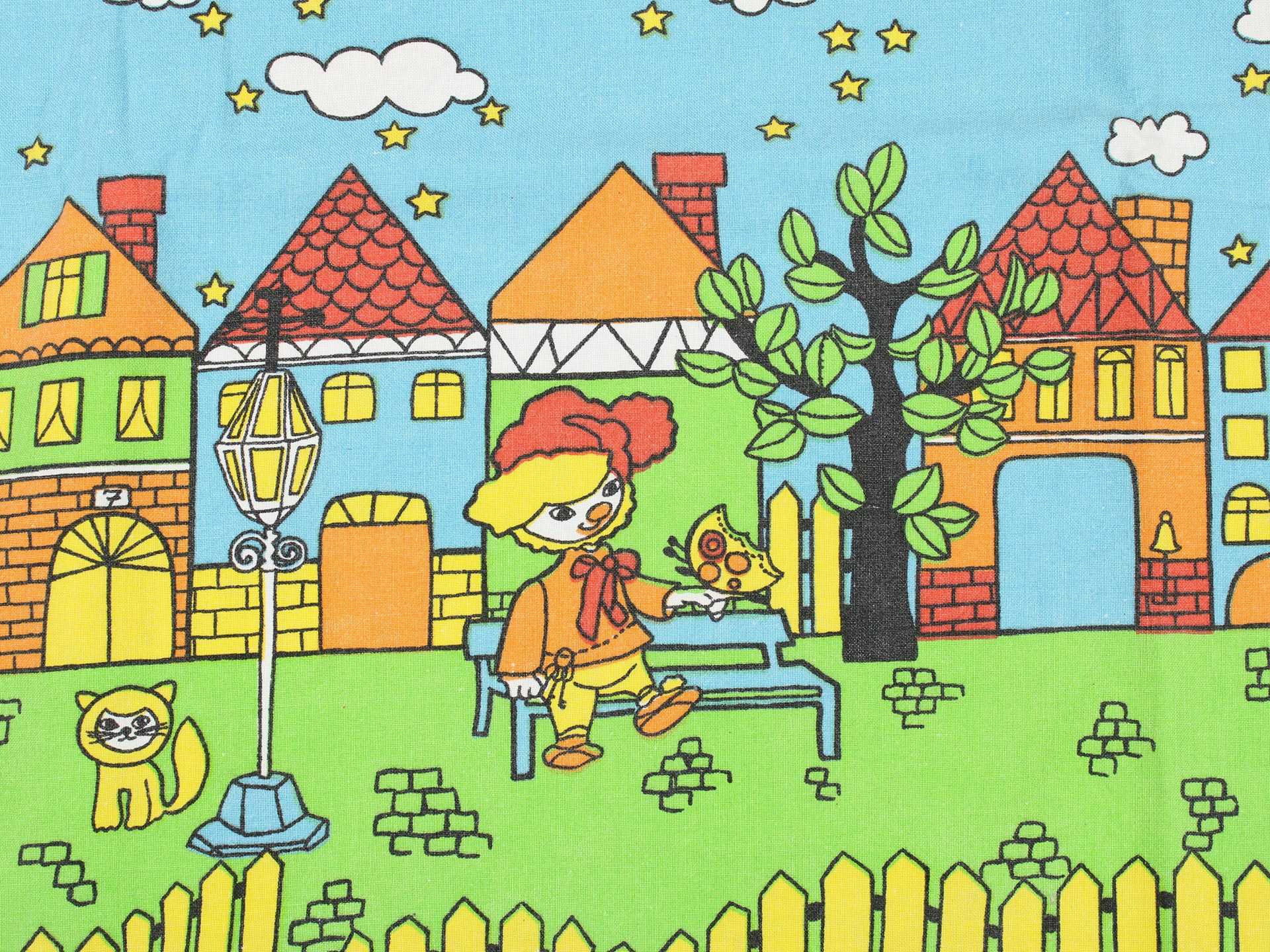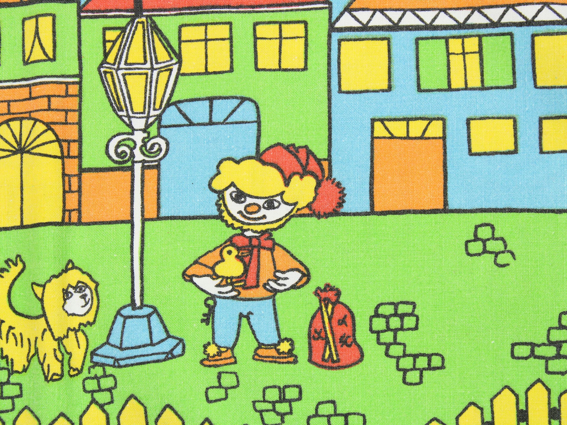 カラフルな夜の街に子供と猫や犬などの動物が描かれています。絵柄のタッチも色合いもレトロで可愛らしいです。