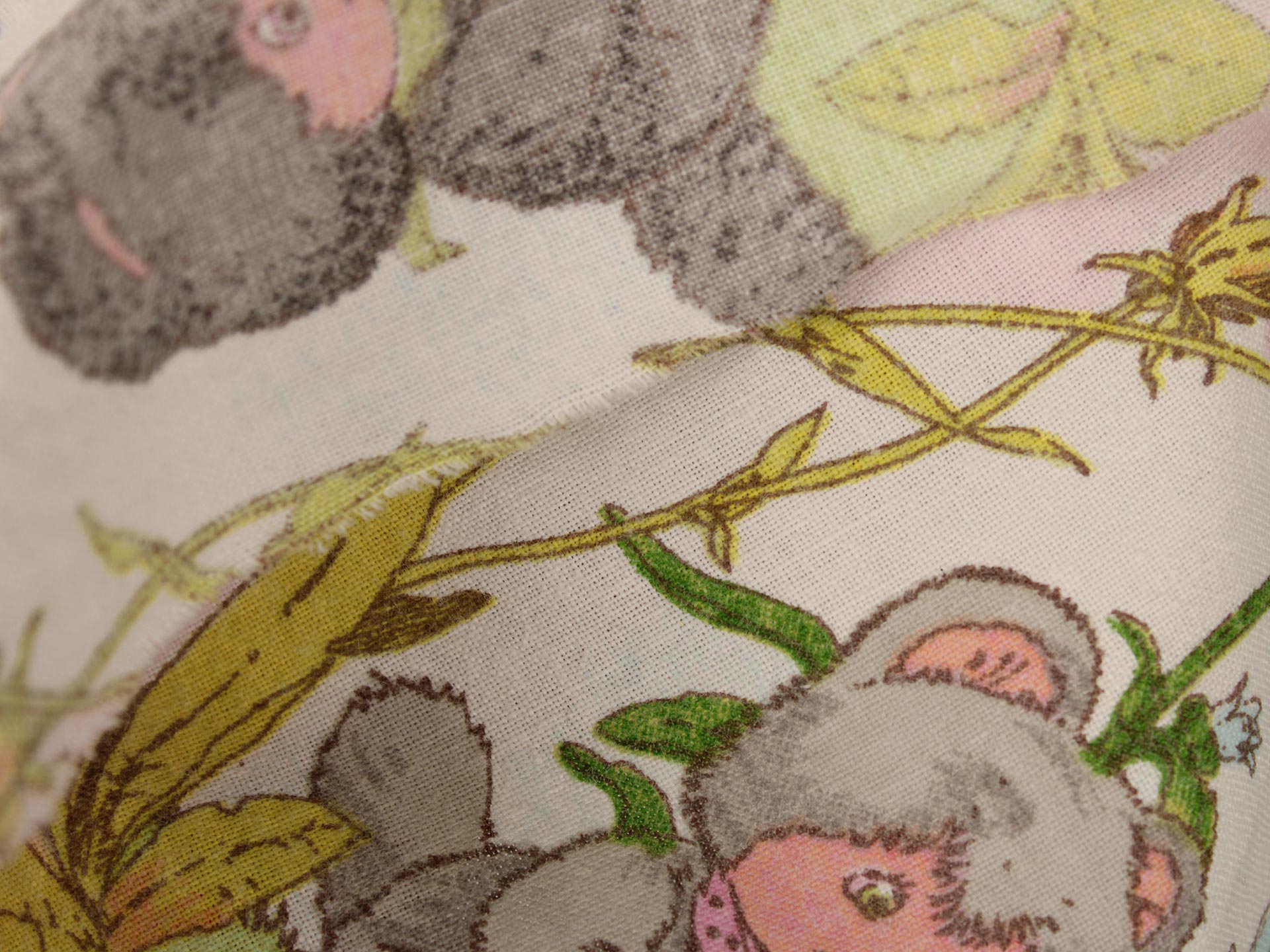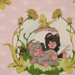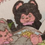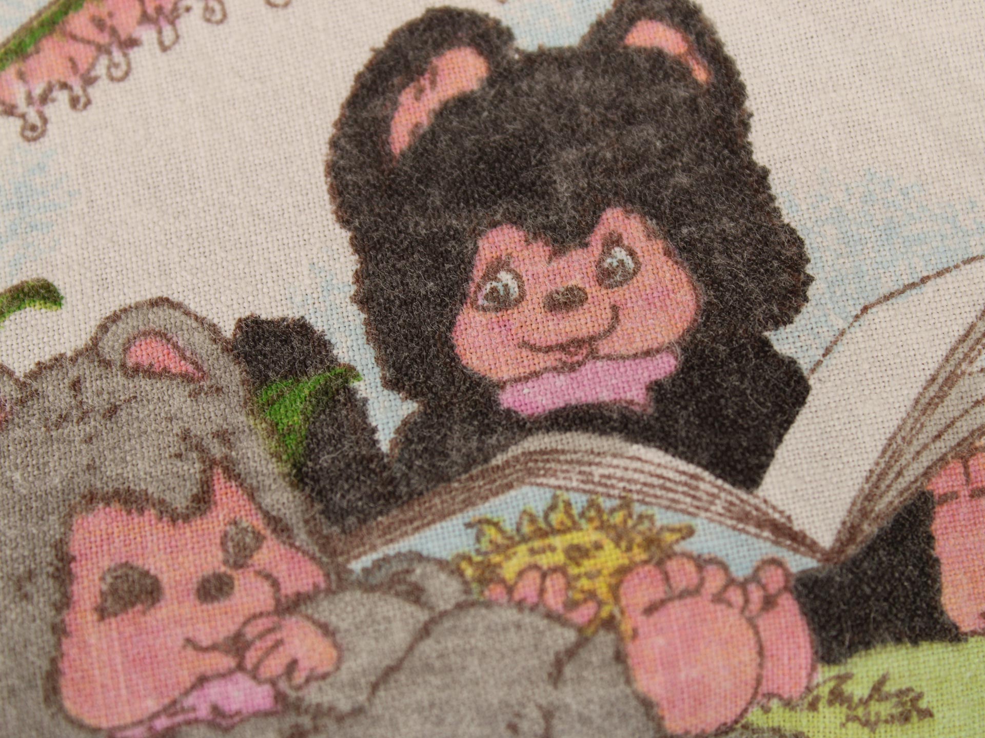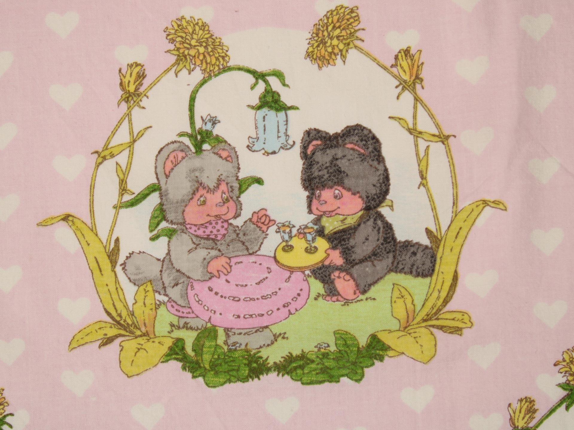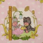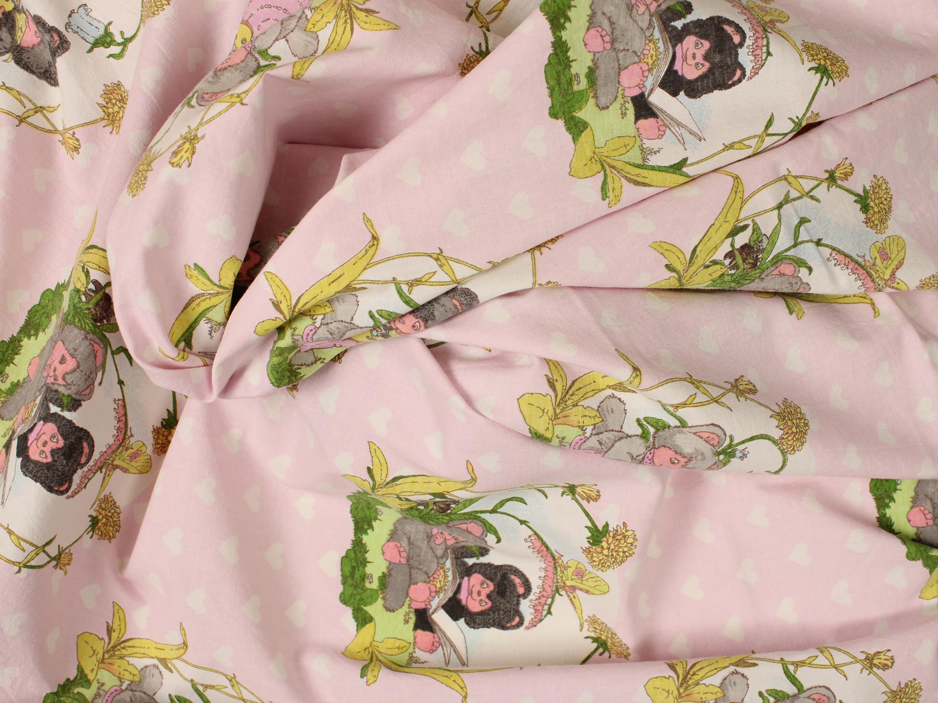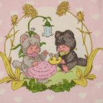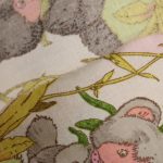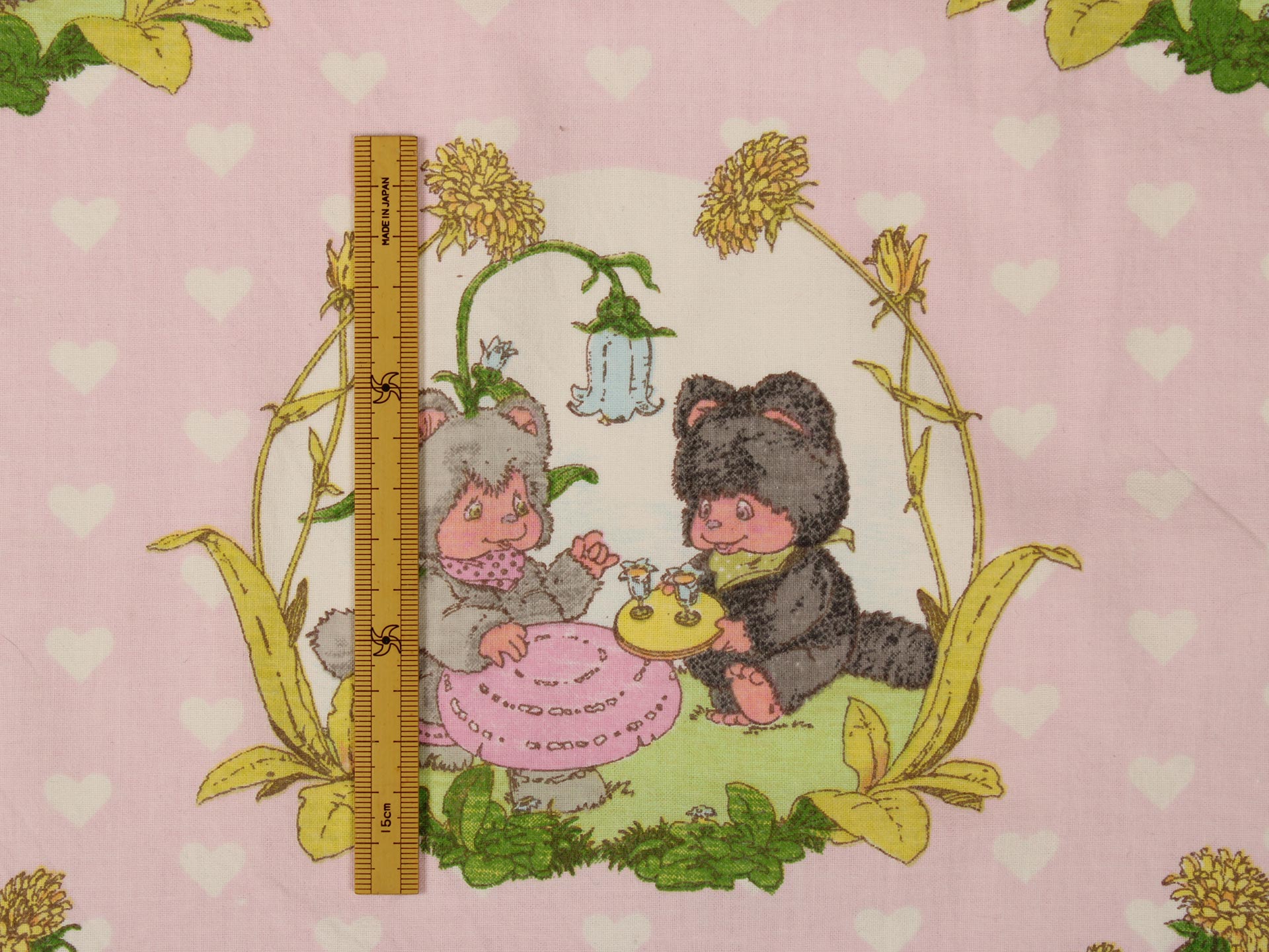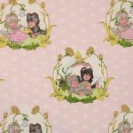 小さなたぬきのようなアニマル柄(ニャーミー)。薄いピンクにハートの背景も可愛らしいです。