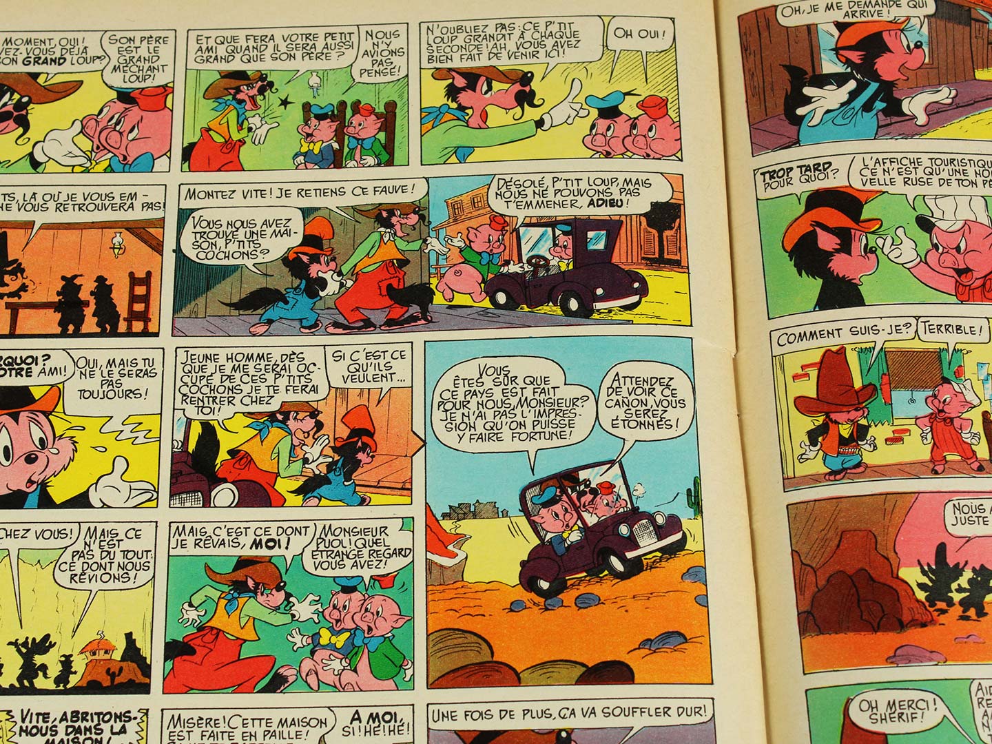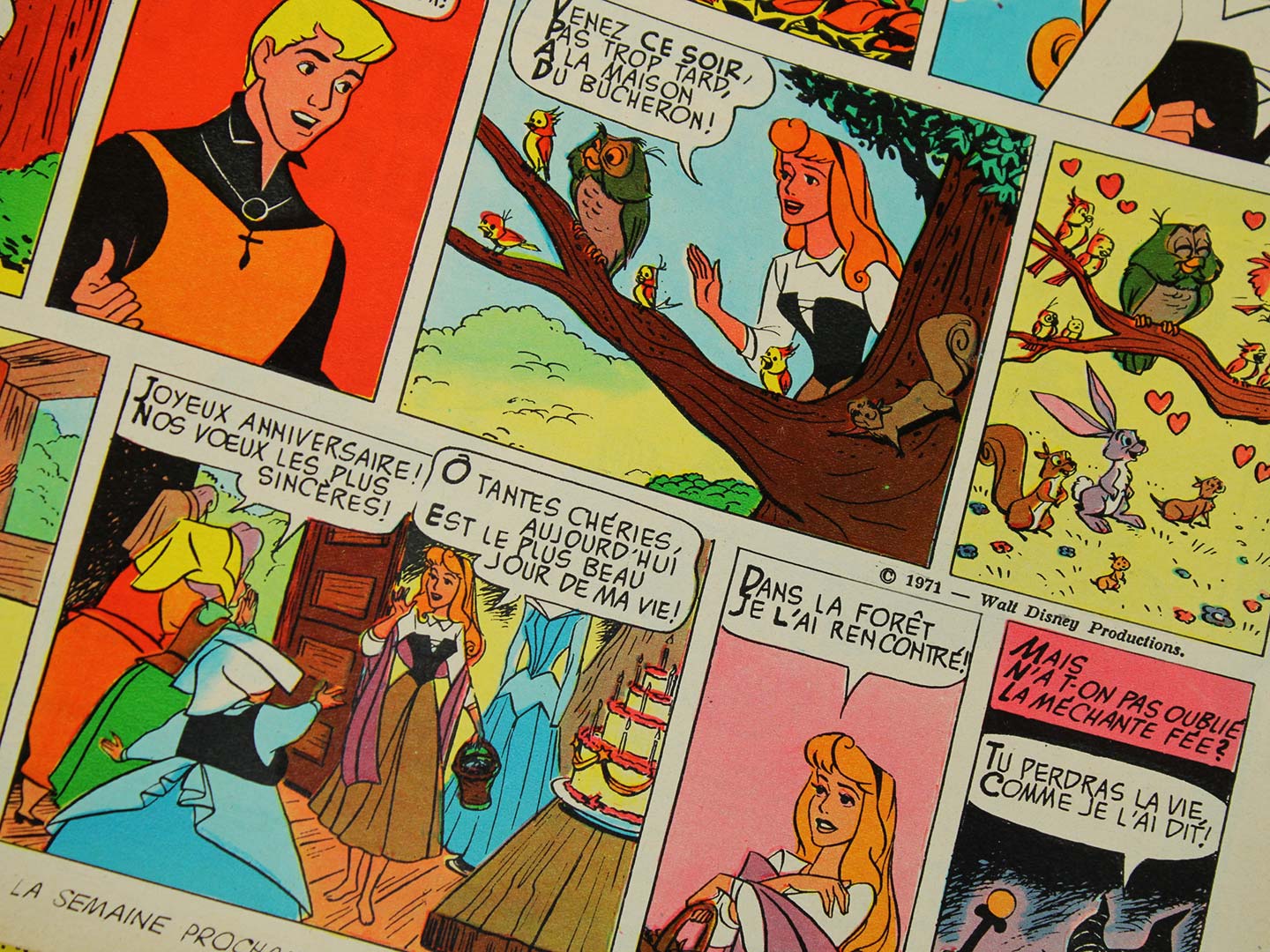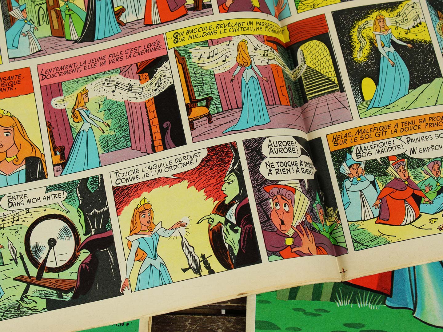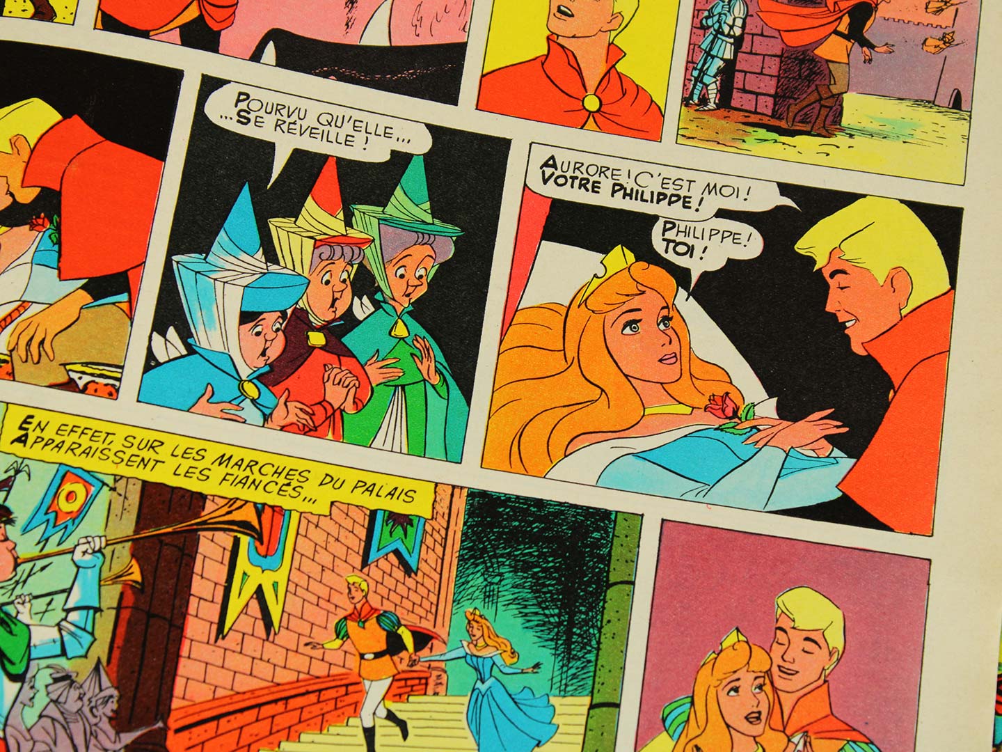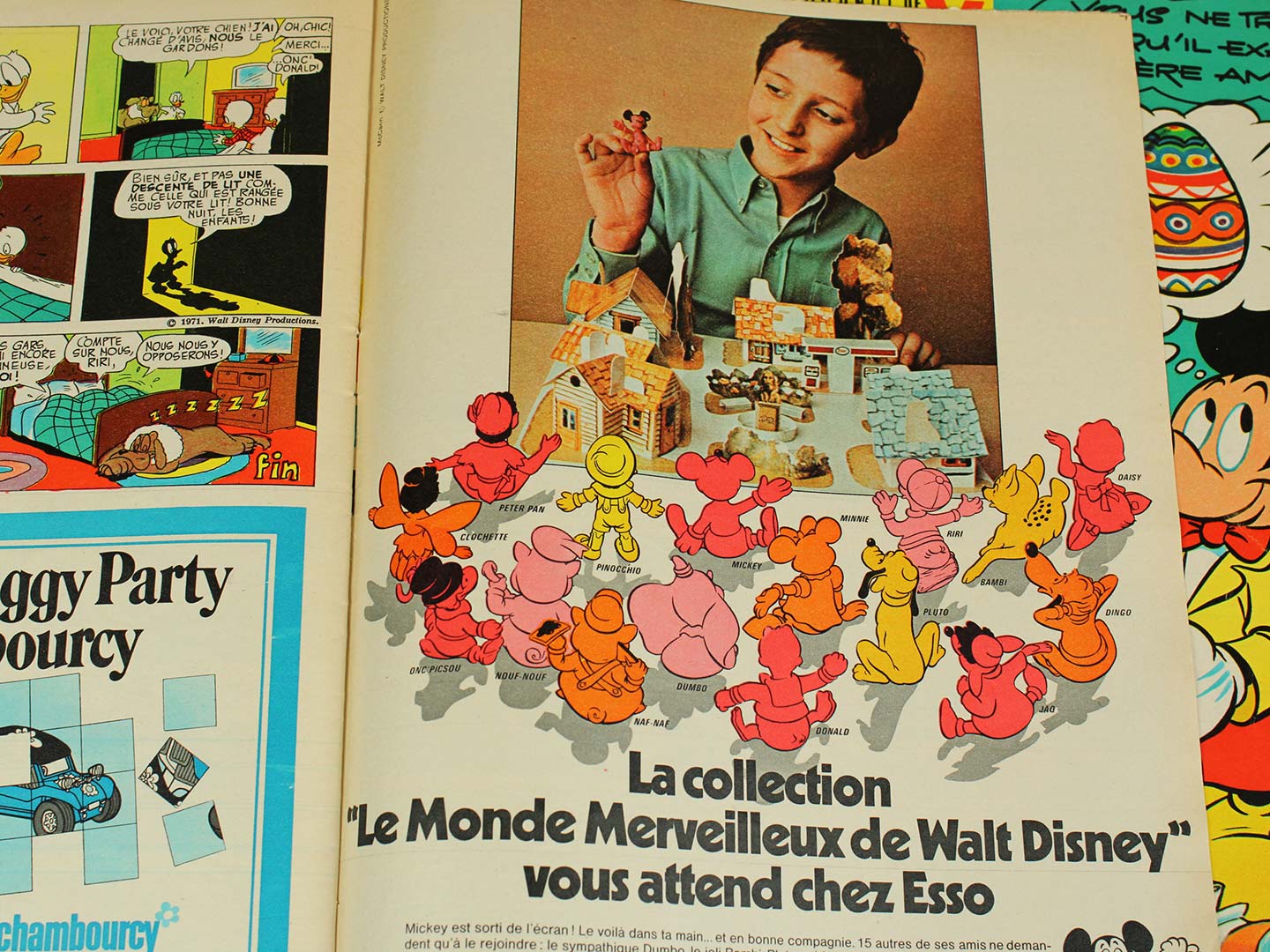 ミッキー&グーフィー、ダックファミリー、三匹の子ブタなどディズニーの通常連載、PIM POM POUMやGUY L’ECLAIRなどのディズニー以外の連載、クロスワードなどの謎解き問題、広告他が掲載されています。No.980〜983には全4話にわたって「眠れる森の美女」が特別連載されています。70年代のレトロな広告なども味わいがあります。