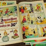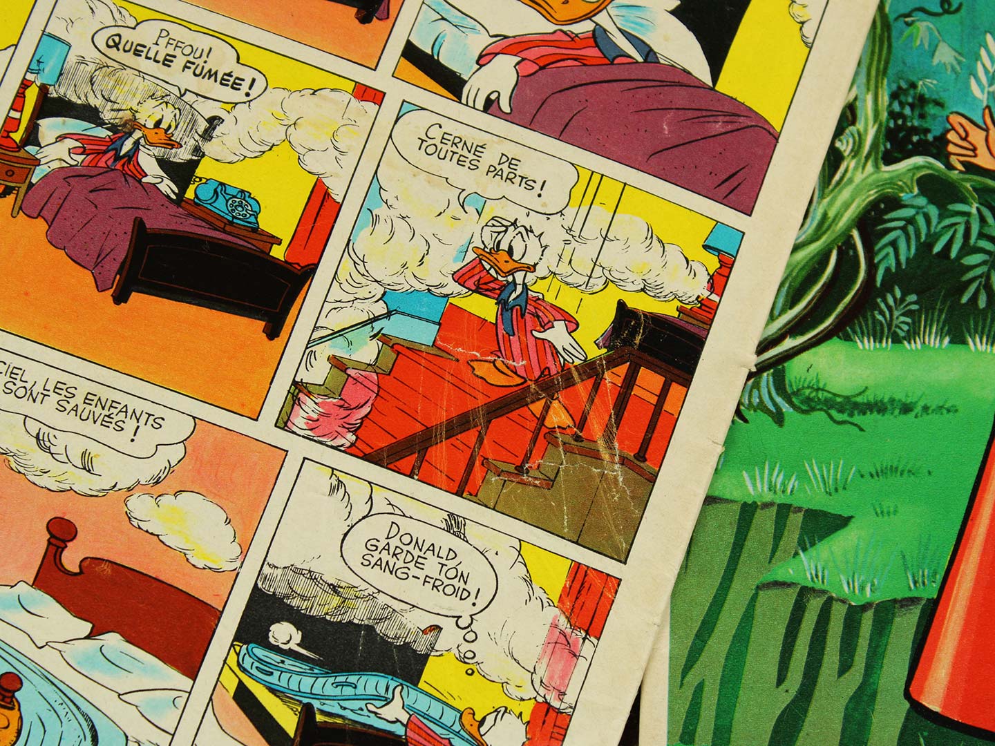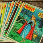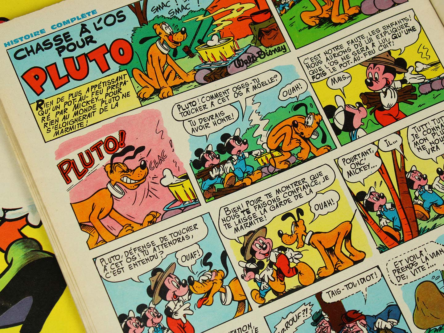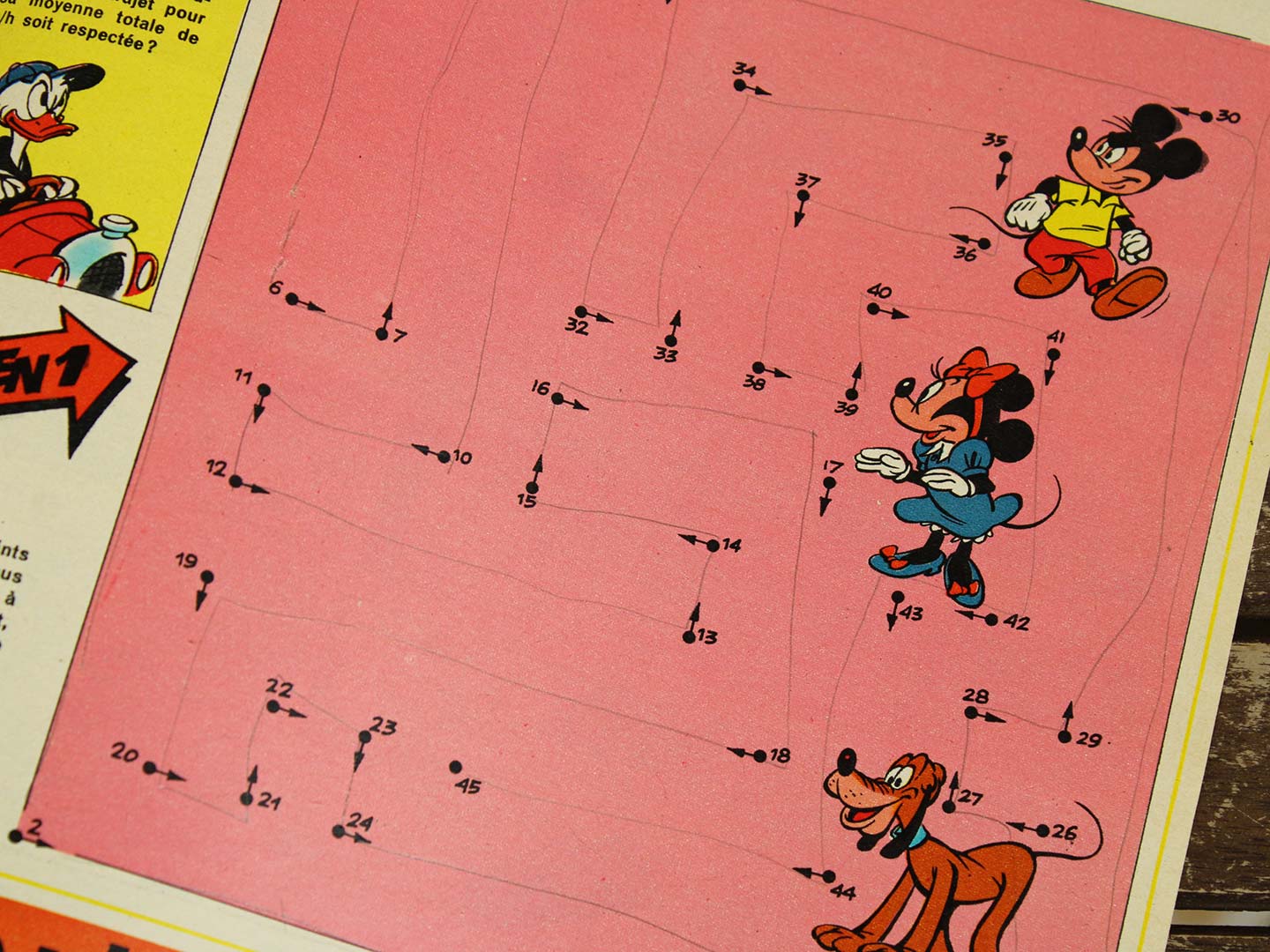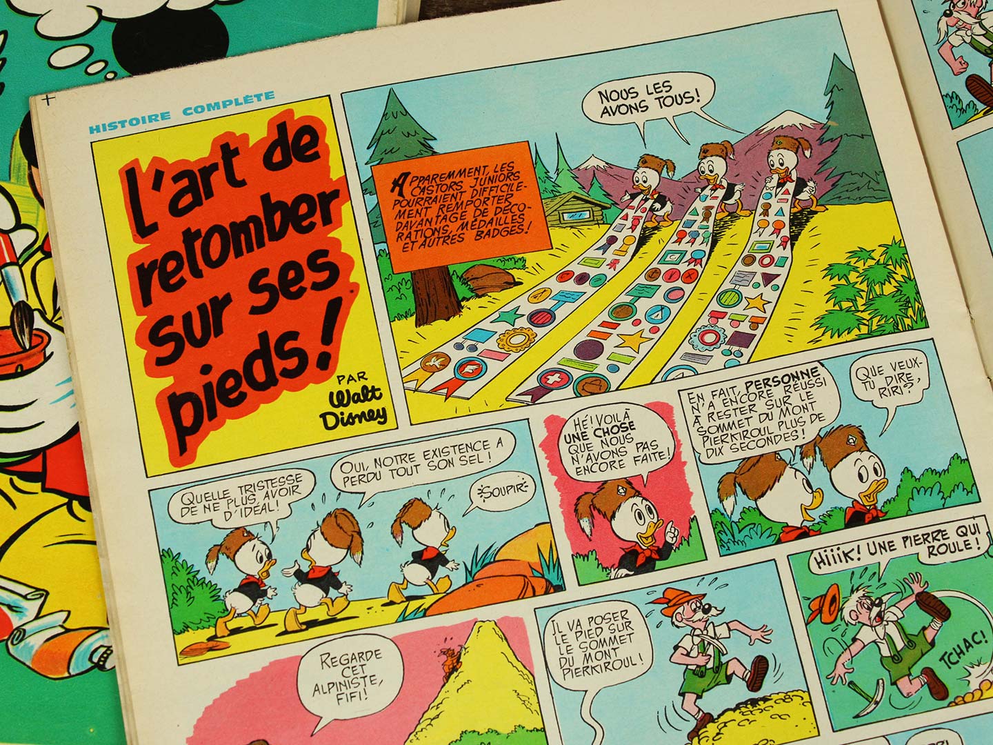 ミッキー&グーフィー、ダックファミリー、三匹の子ブタなどディズニーの通常連載、PIM POM POUMやGUY L’ECLAIRなどのディズニー以外の連載、クロスワードなどの謎解き問題、広告他が掲載されています。No.980〜983には全4話にわたって「眠れる森の美女」が特別連載されています。70年代のレトロな広告なども味わいがあります。