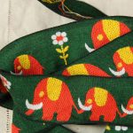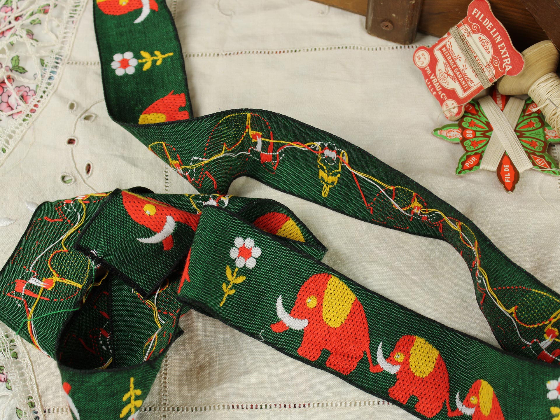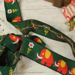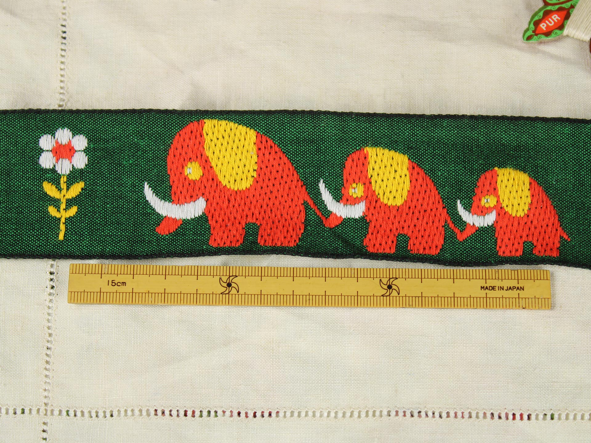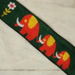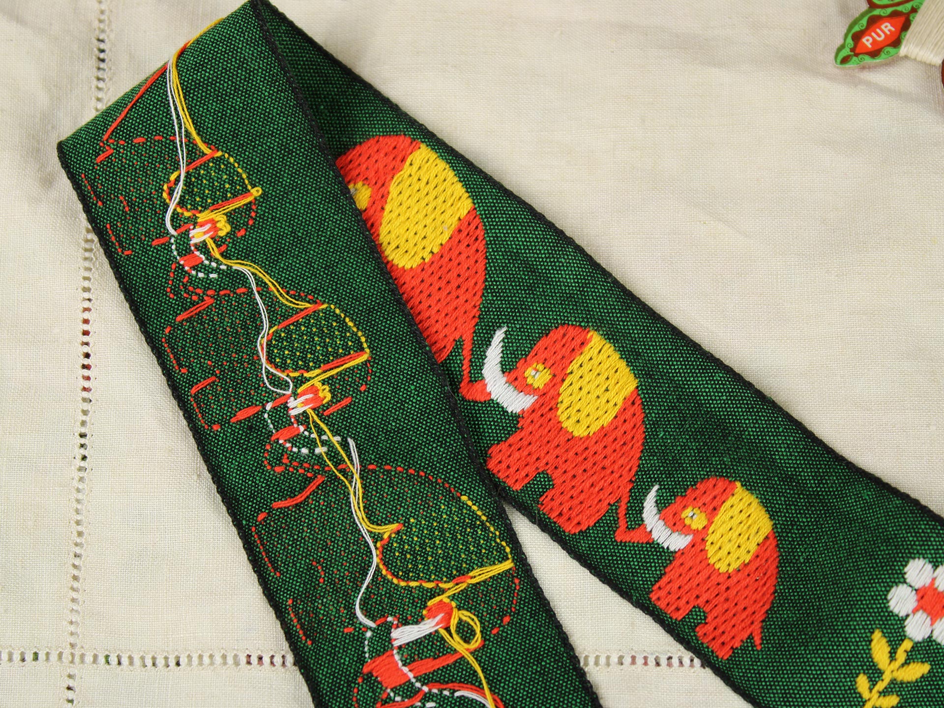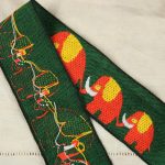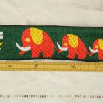 つながってお散歩するぞうがモチーフの、極太幅のヴィンテージ刺繍リボンです。深緑にオレンジのレトロカラー。