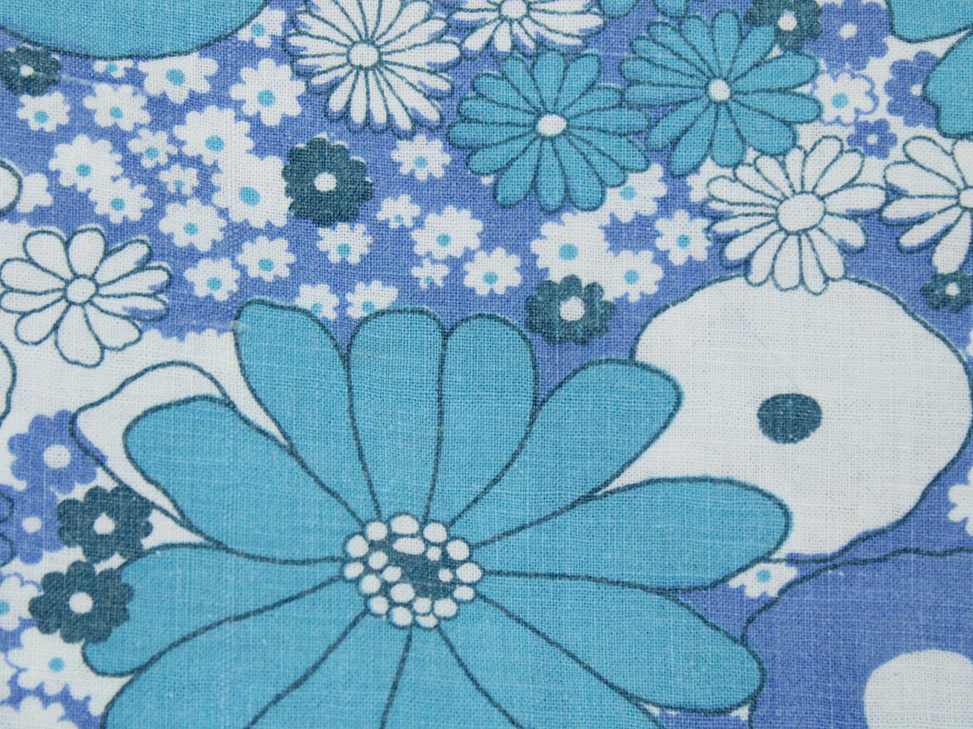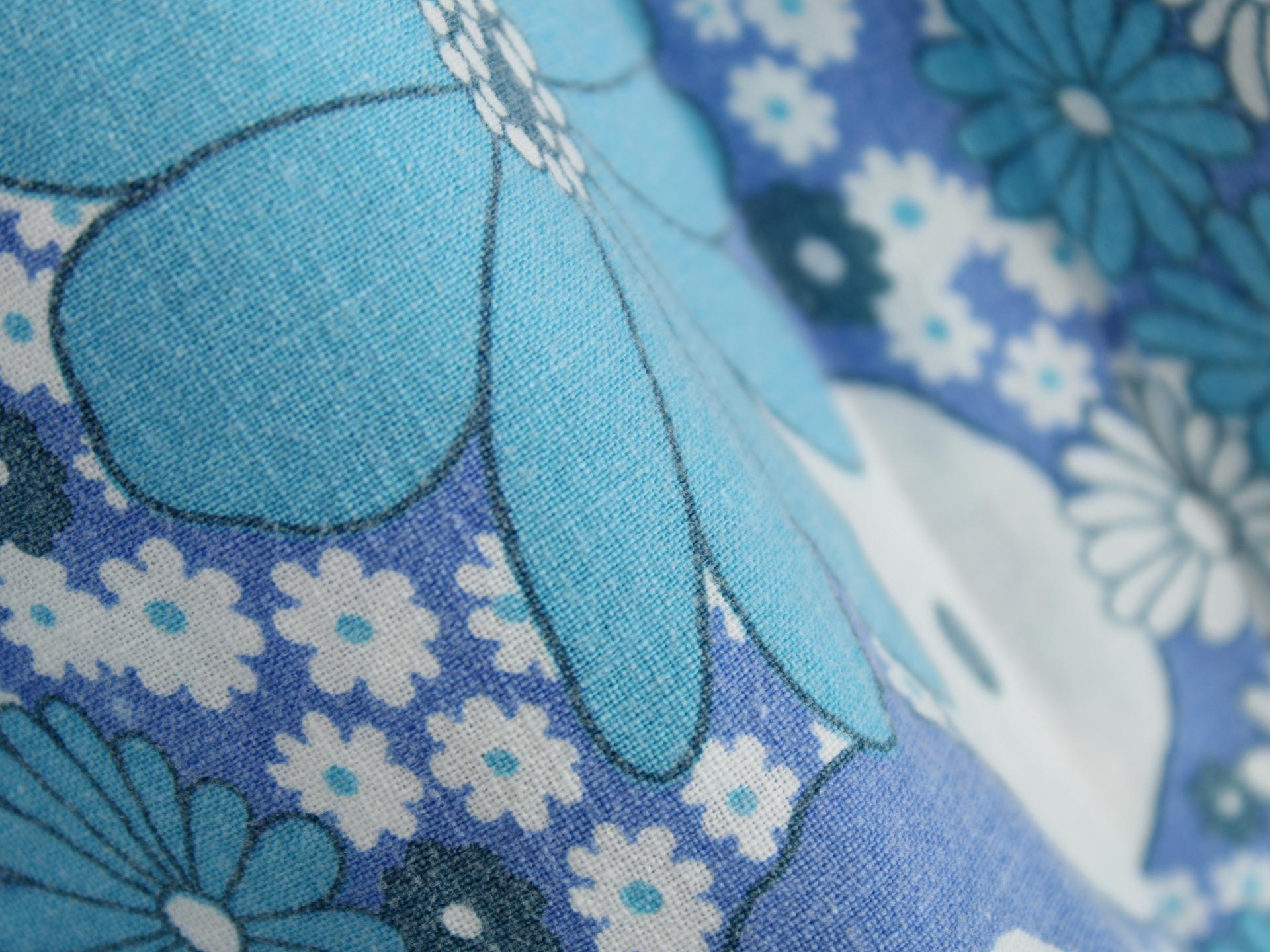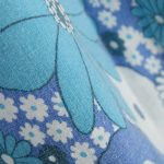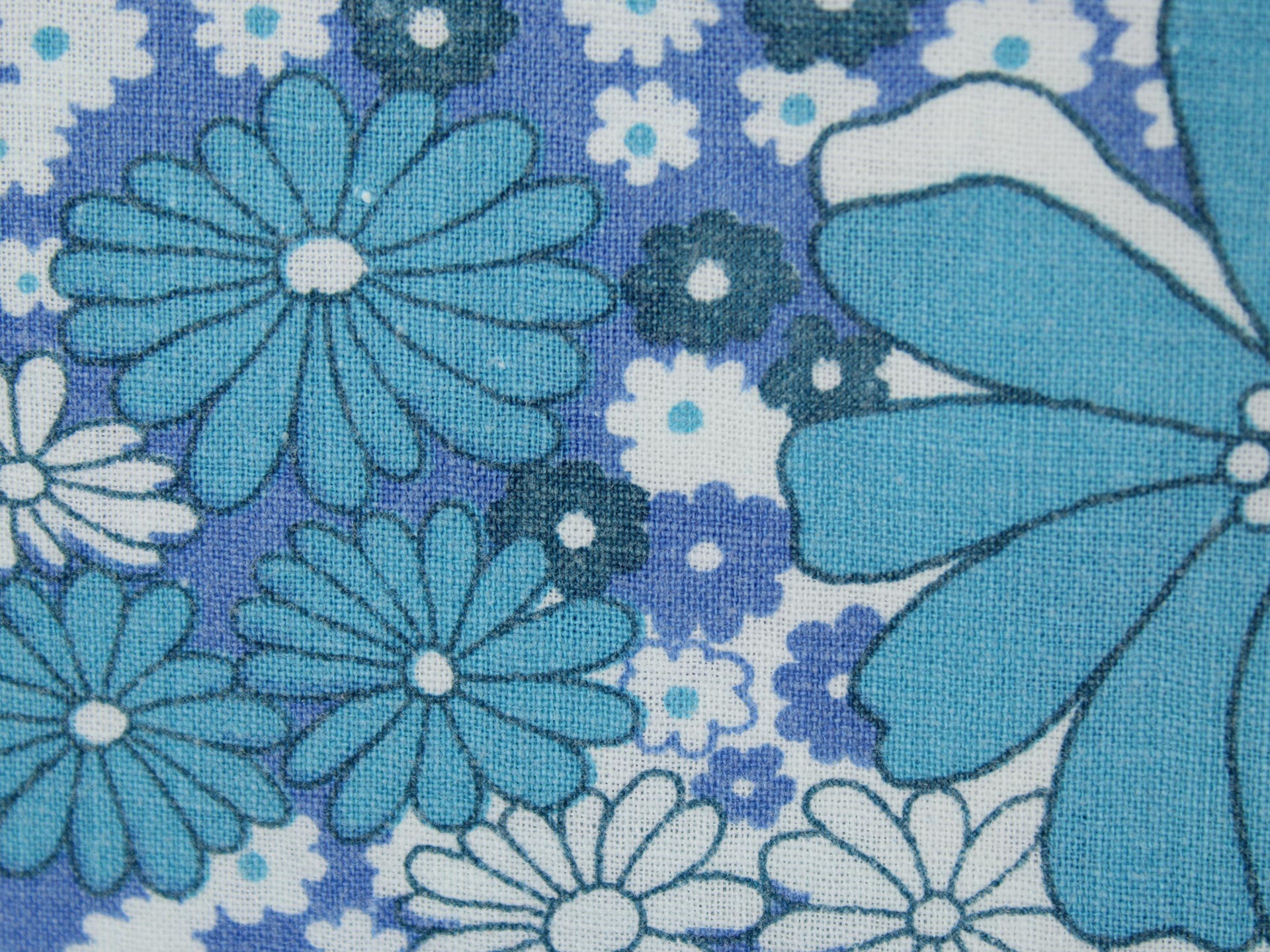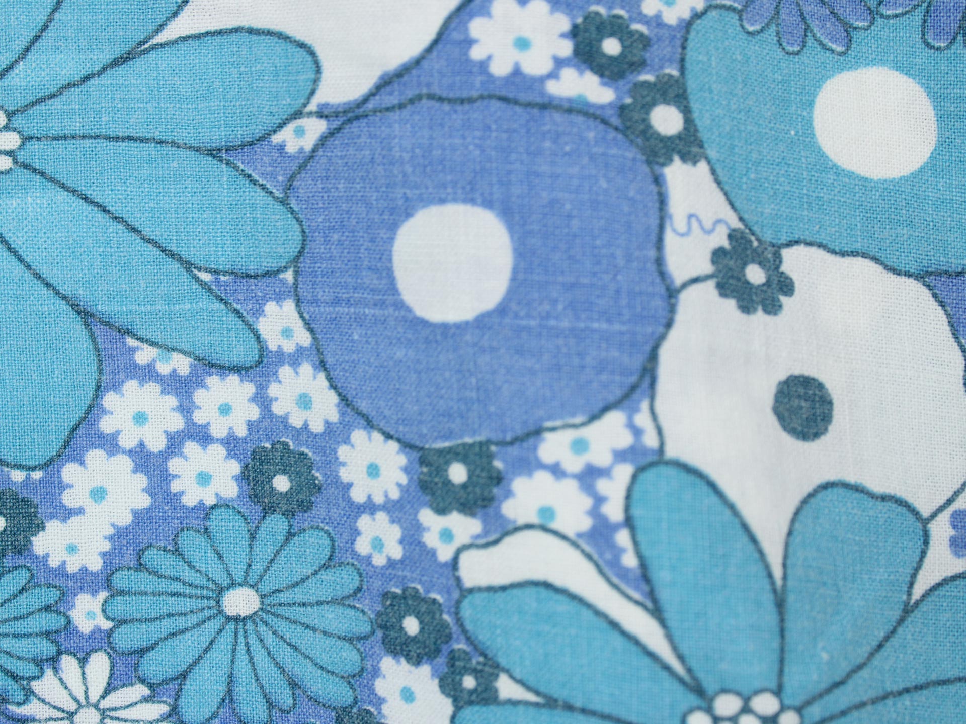 大小さまざまな花モチーフと、青のグラデーションの奥行きのあるデザイン。全体的な色落ちとかすれがヴィンテージ感をひきたてています。
