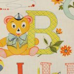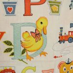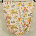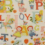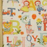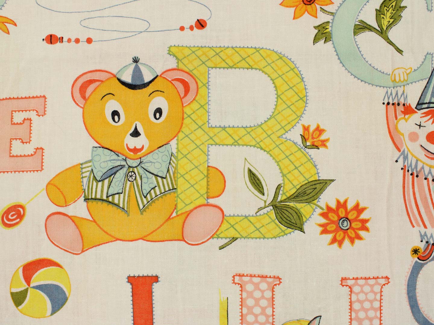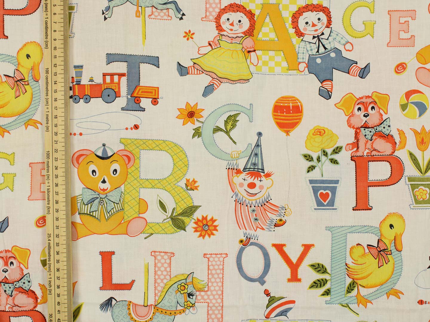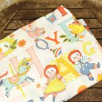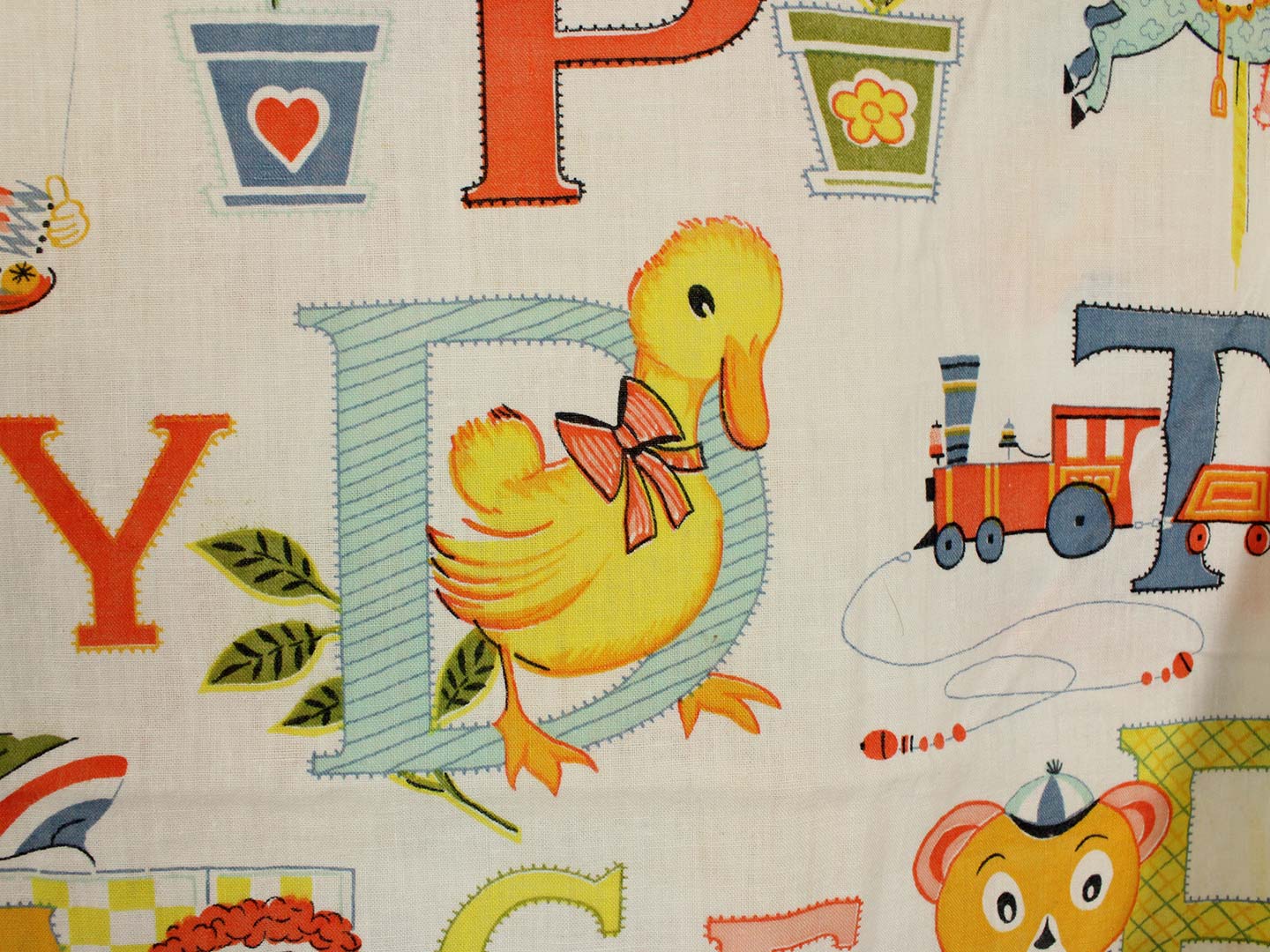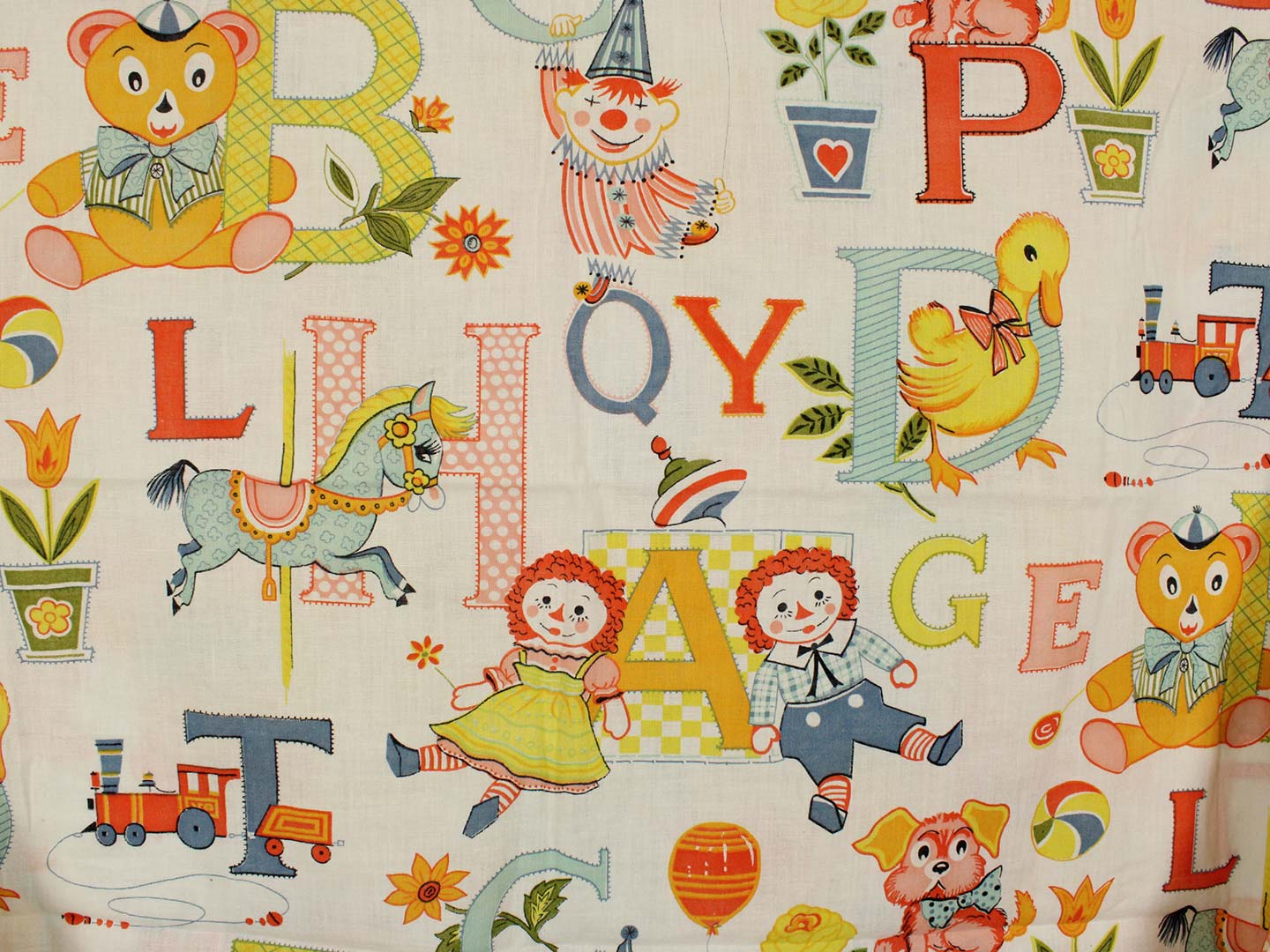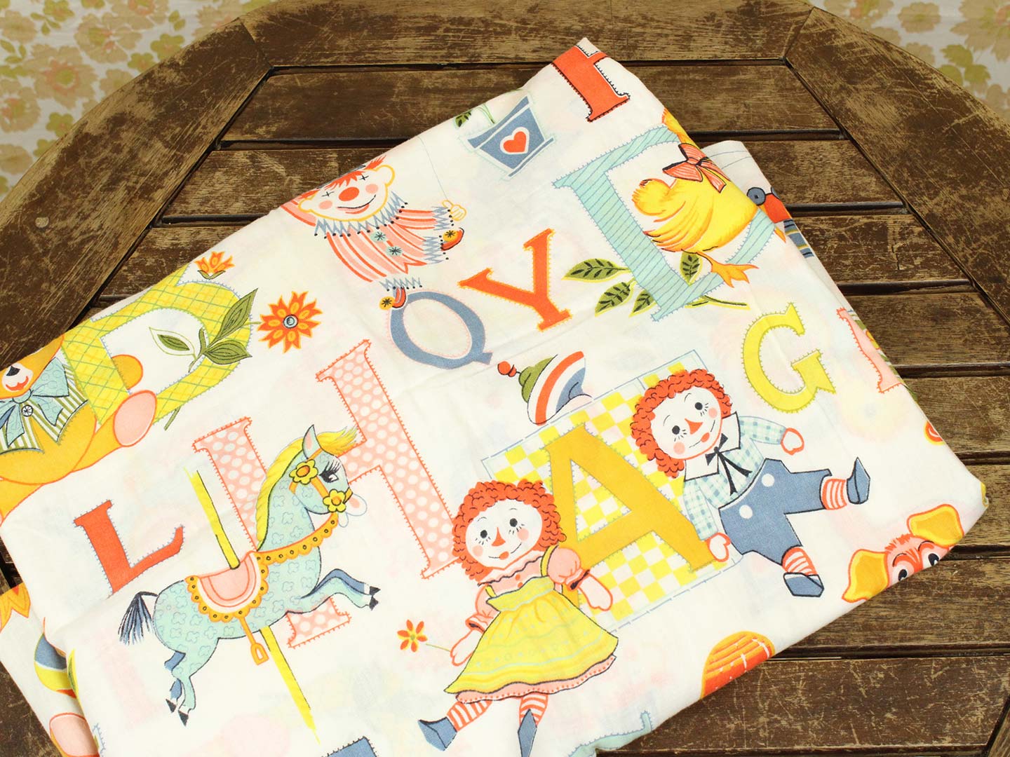 オモチャとアルファベット、人形のラガディ・アン&アンディが描かれたベビーサイズのボックスシーツです。レトロな色柄が可愛いデザイン。ベビー用マットレスに被せるタイプの立体的なシーツです。画像1枚めはシーツを2つ折りにしています。画像2枚めが全体です。