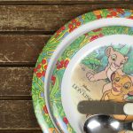 可愛らしい子供シンバとナラ、縁取りのジャングルの模様もオシャレなデザインです。大中のメラミン製平皿とステンレス製のスプーンとナイフのセットです。