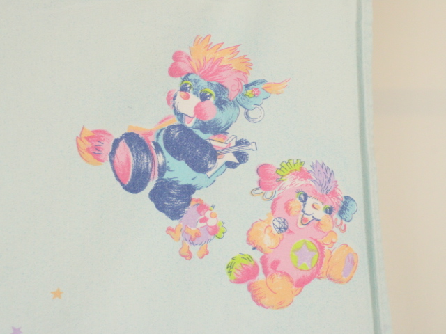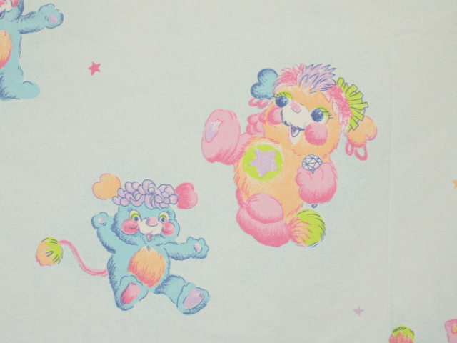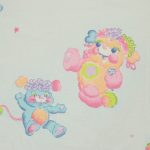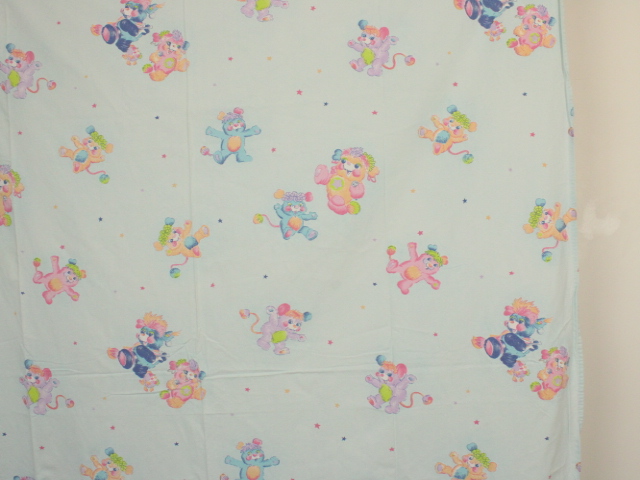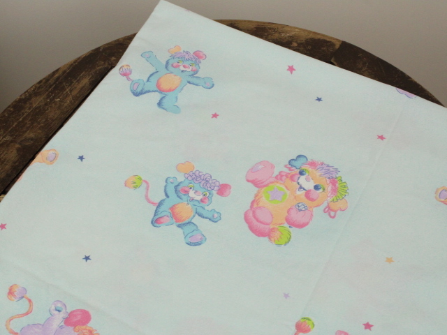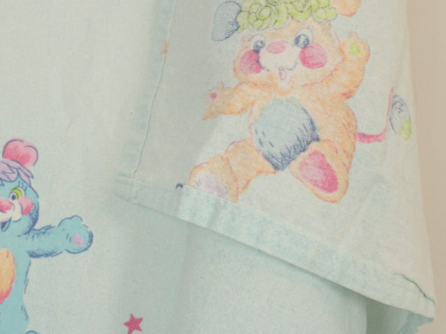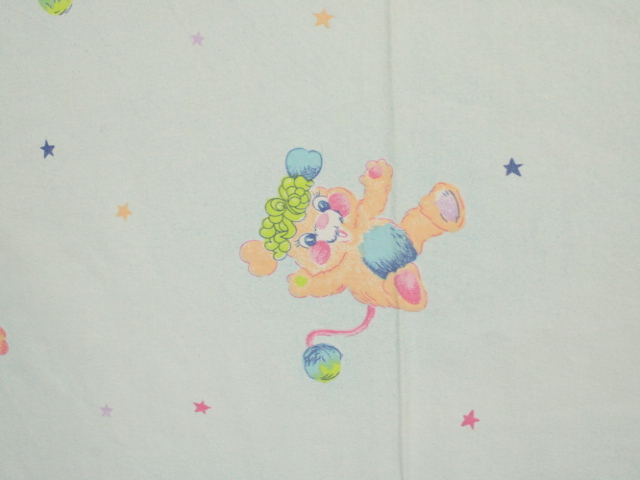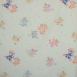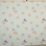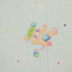 パステルカラーにベビー柄可愛い、ポップルズ(POPPLES)のフラットシーツです。ベビーサイズ。画像1枚めが全体です。