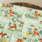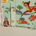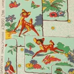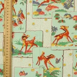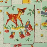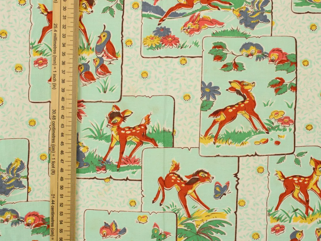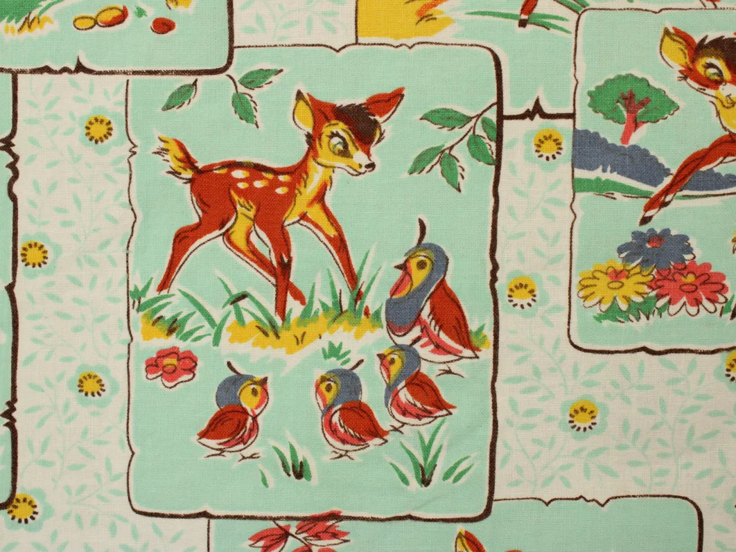明るいミントグリーンのパネルにレトロなバンビの絵柄。中古シーツの解体生地です。