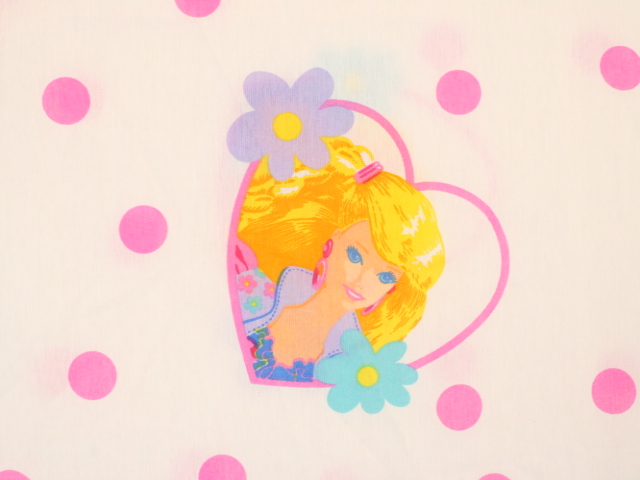 ピンクのドット地に、ハートフレームのバービー柄のお布団カバーです。サラッとした手触りの、おそらく化繊混じりの生地です。ハンドメイド品のようです。