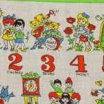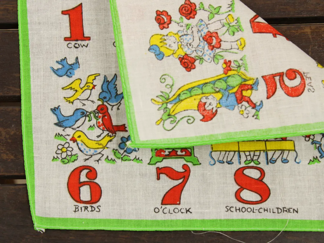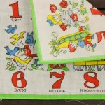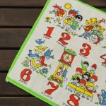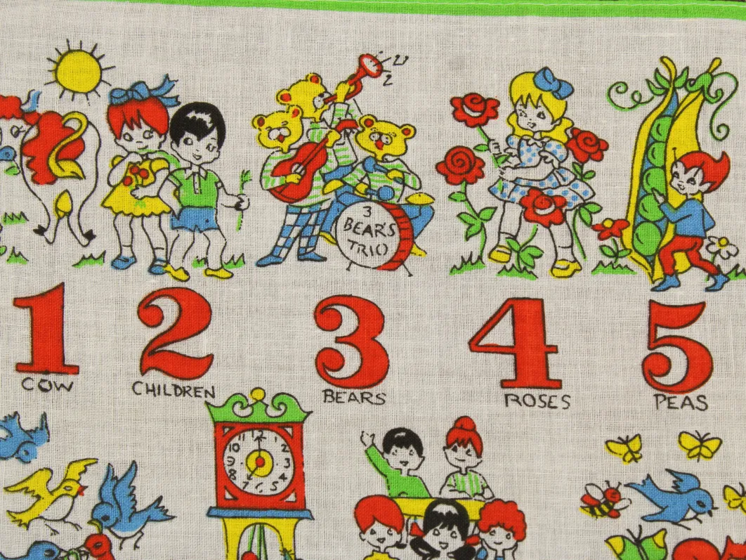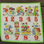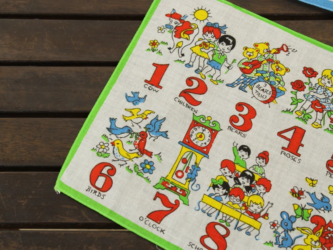 数字と子供や動物が描かれたハンカチ。
