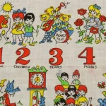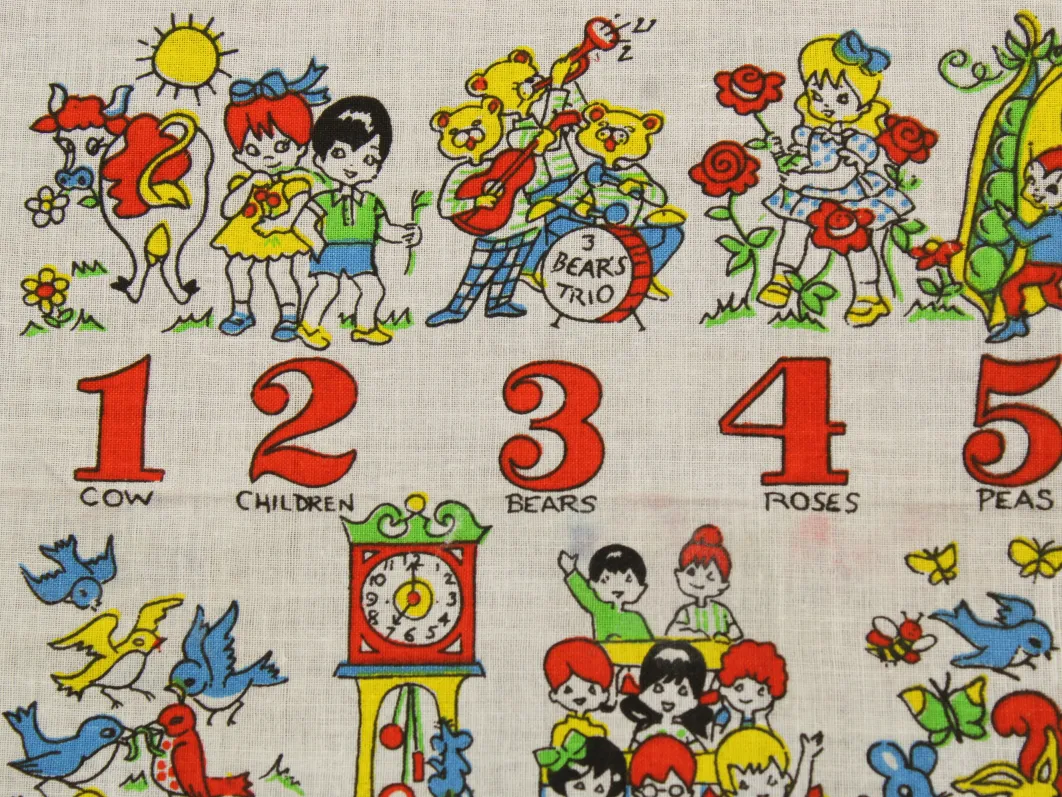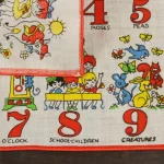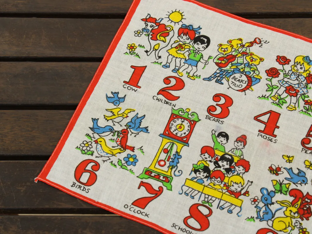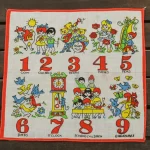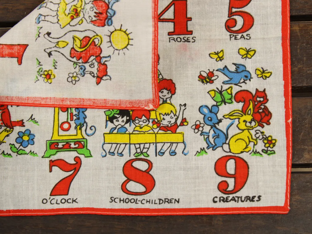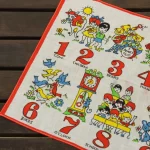 数字と子供や動物が描かれたハンカチ。