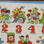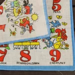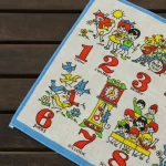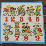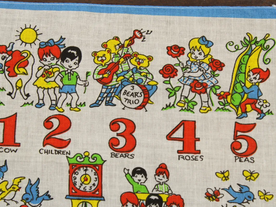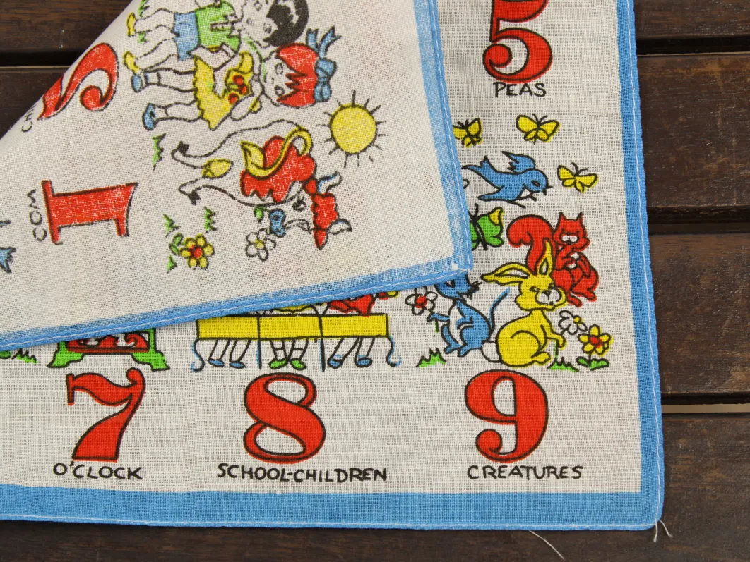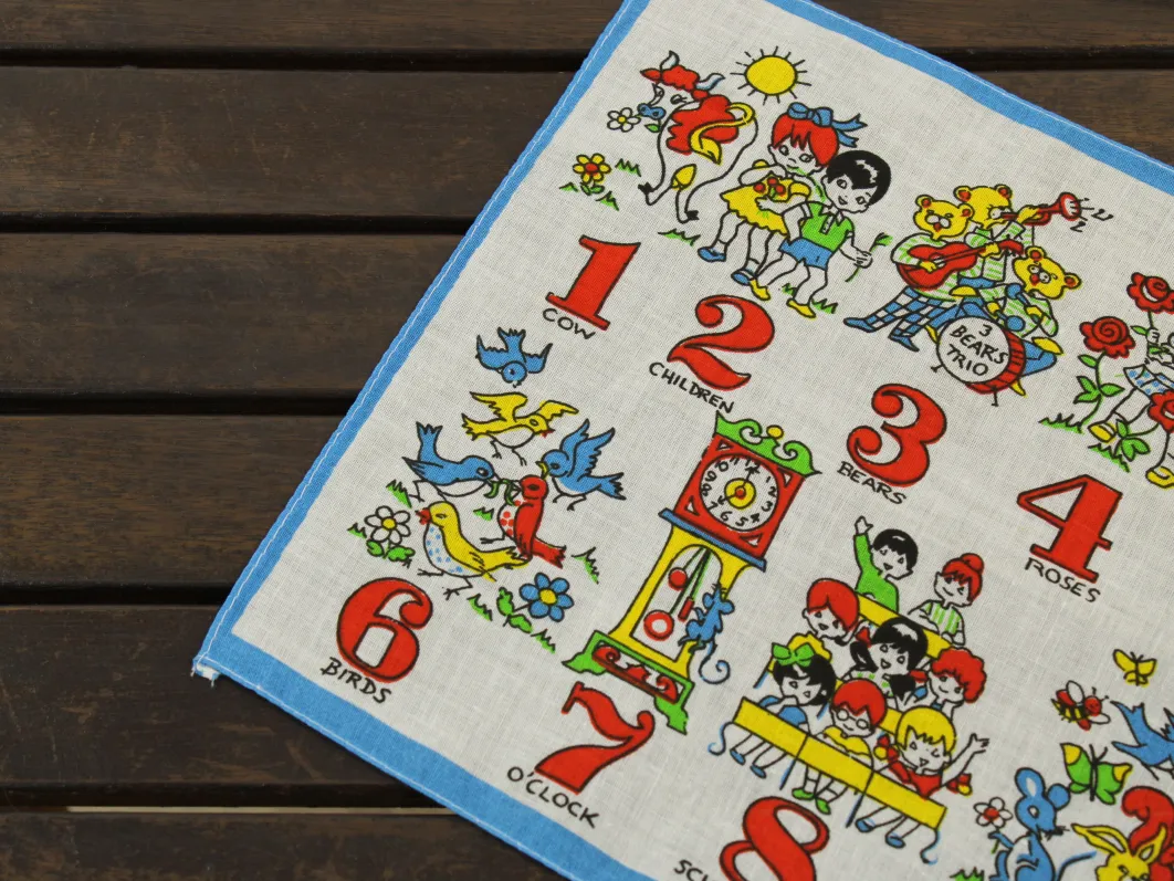 数字と子供や動物が描かれたハンカチ。
