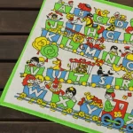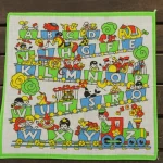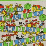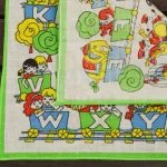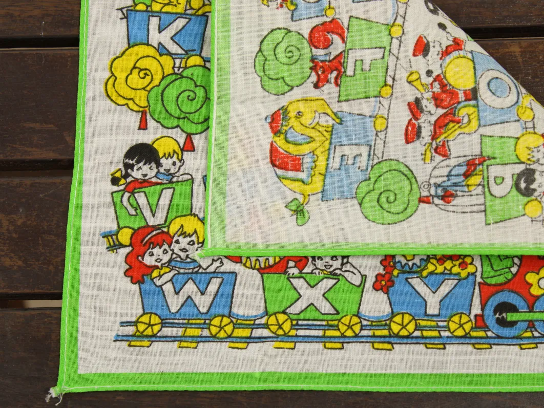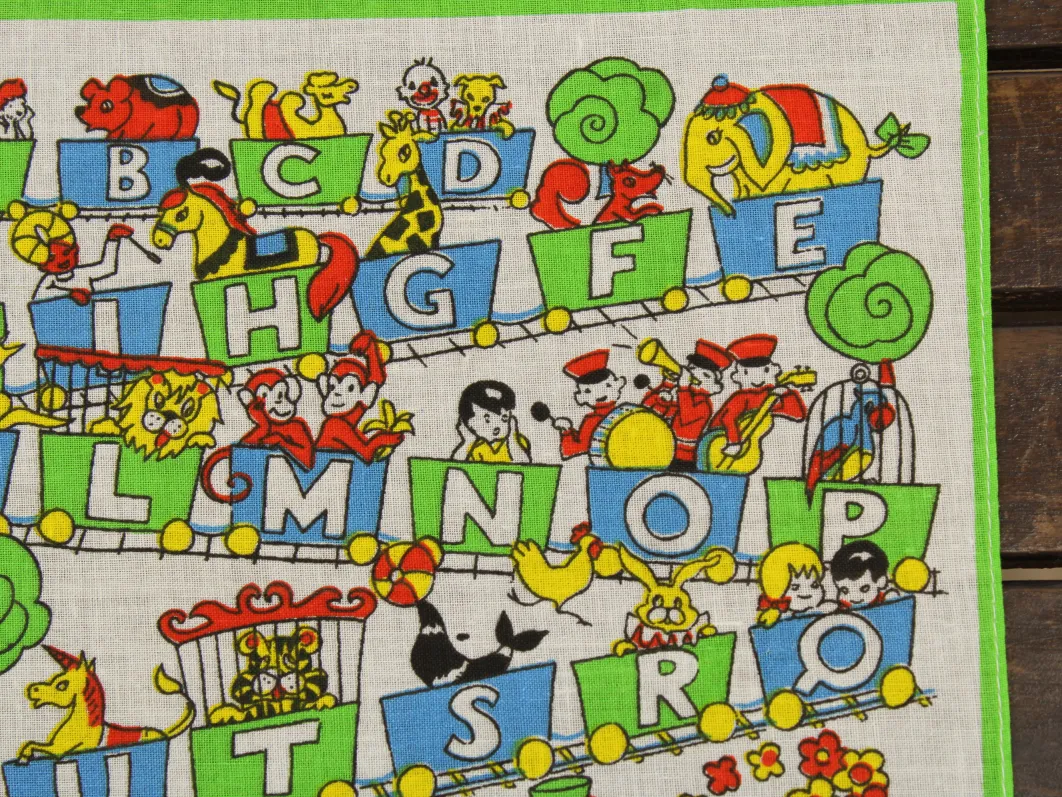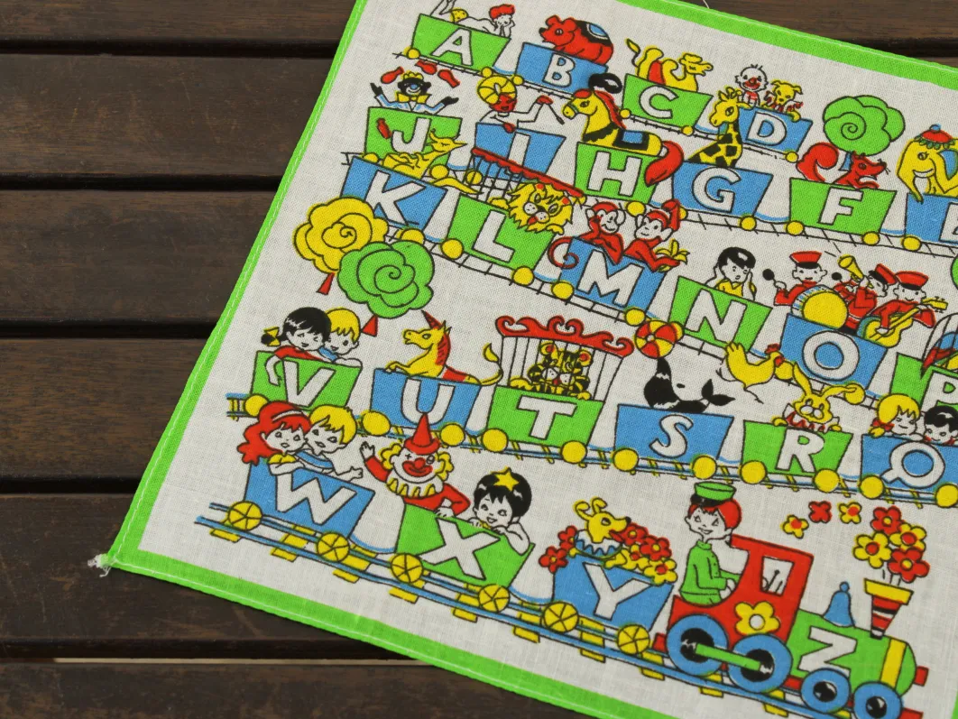 アルファベットの描かれた機関車に乗った、子供と動物たちのハンカチ。