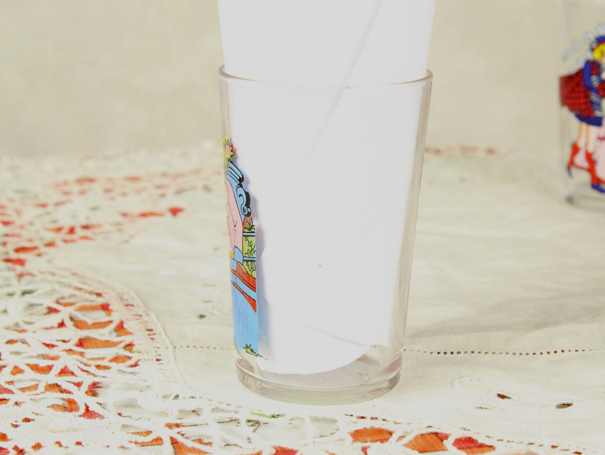 バラ園のキャンディとアンソニーが描かれたグラス。マスタードグラスと呼ばれる、元々はマスタードが入って売られていたノベルティ品です。小ぶりで可愛らしいグラスです。
