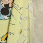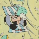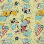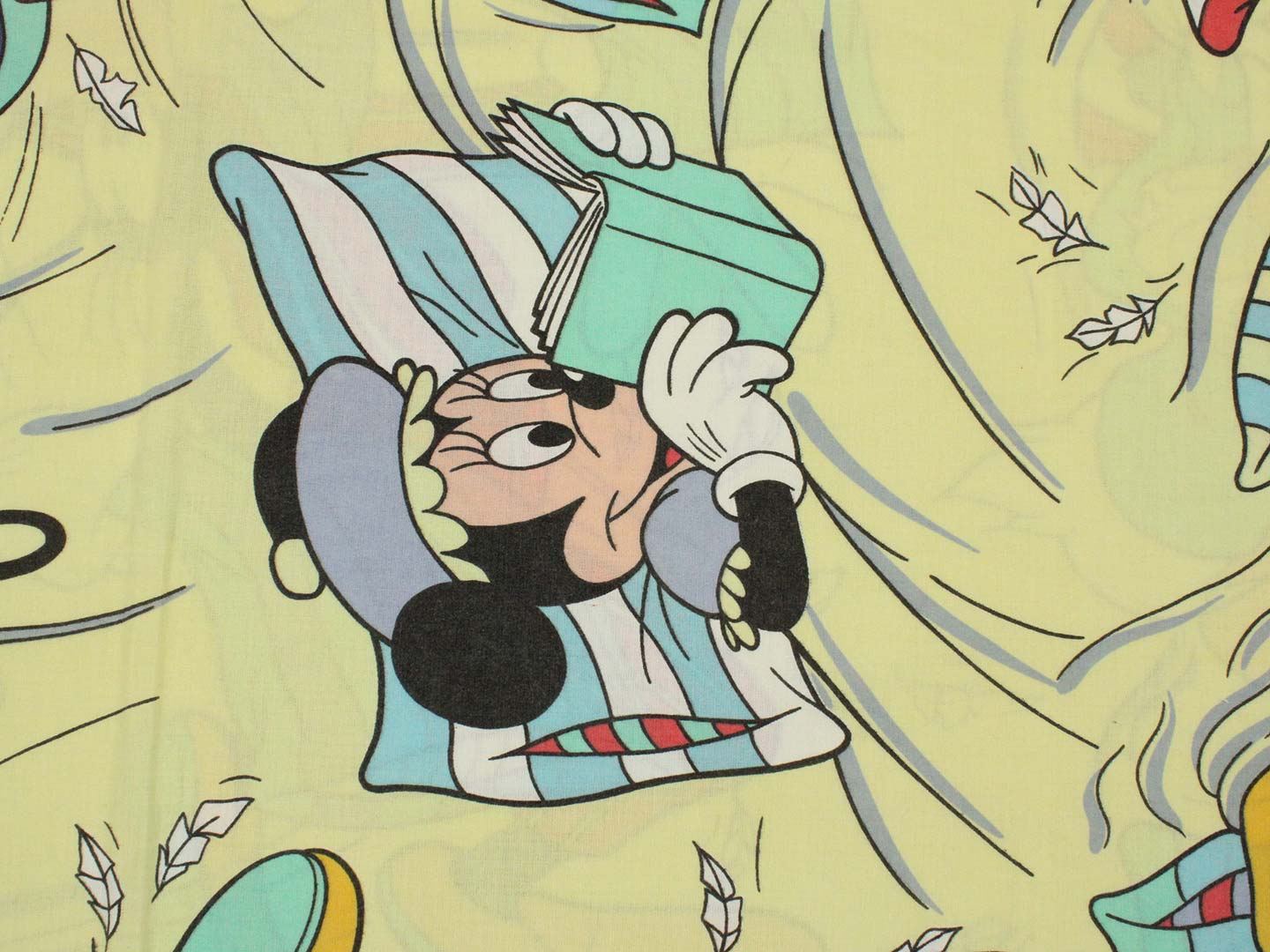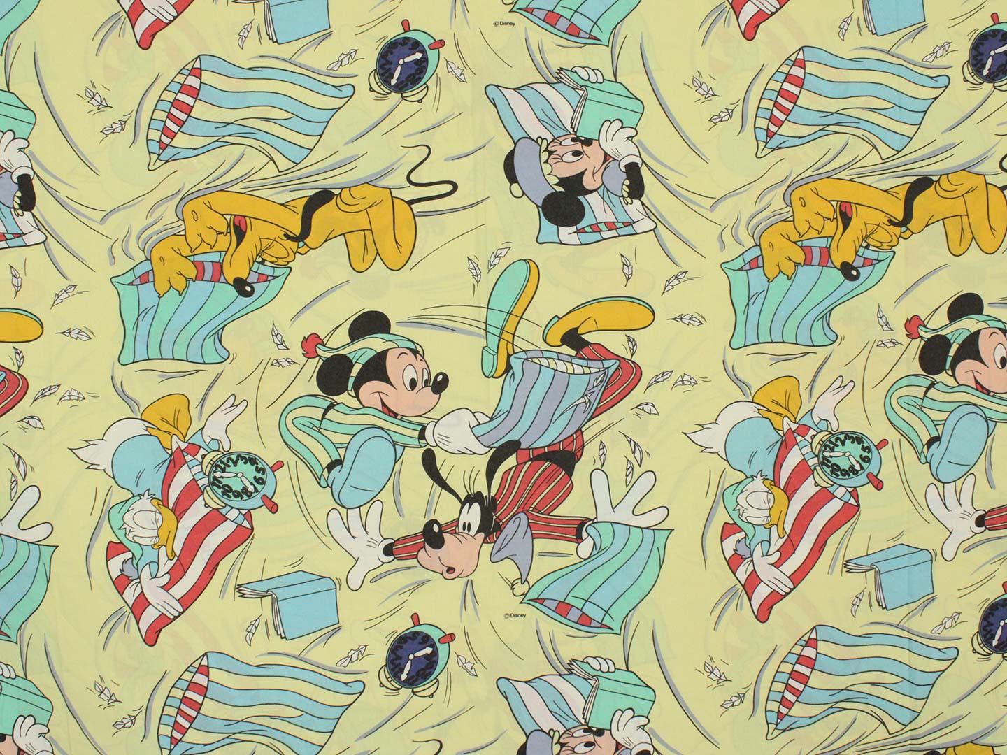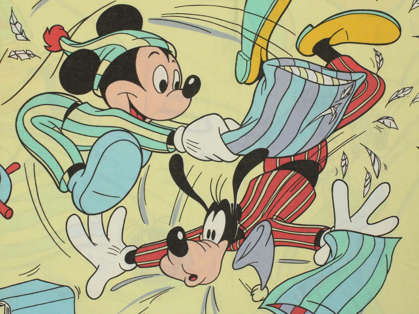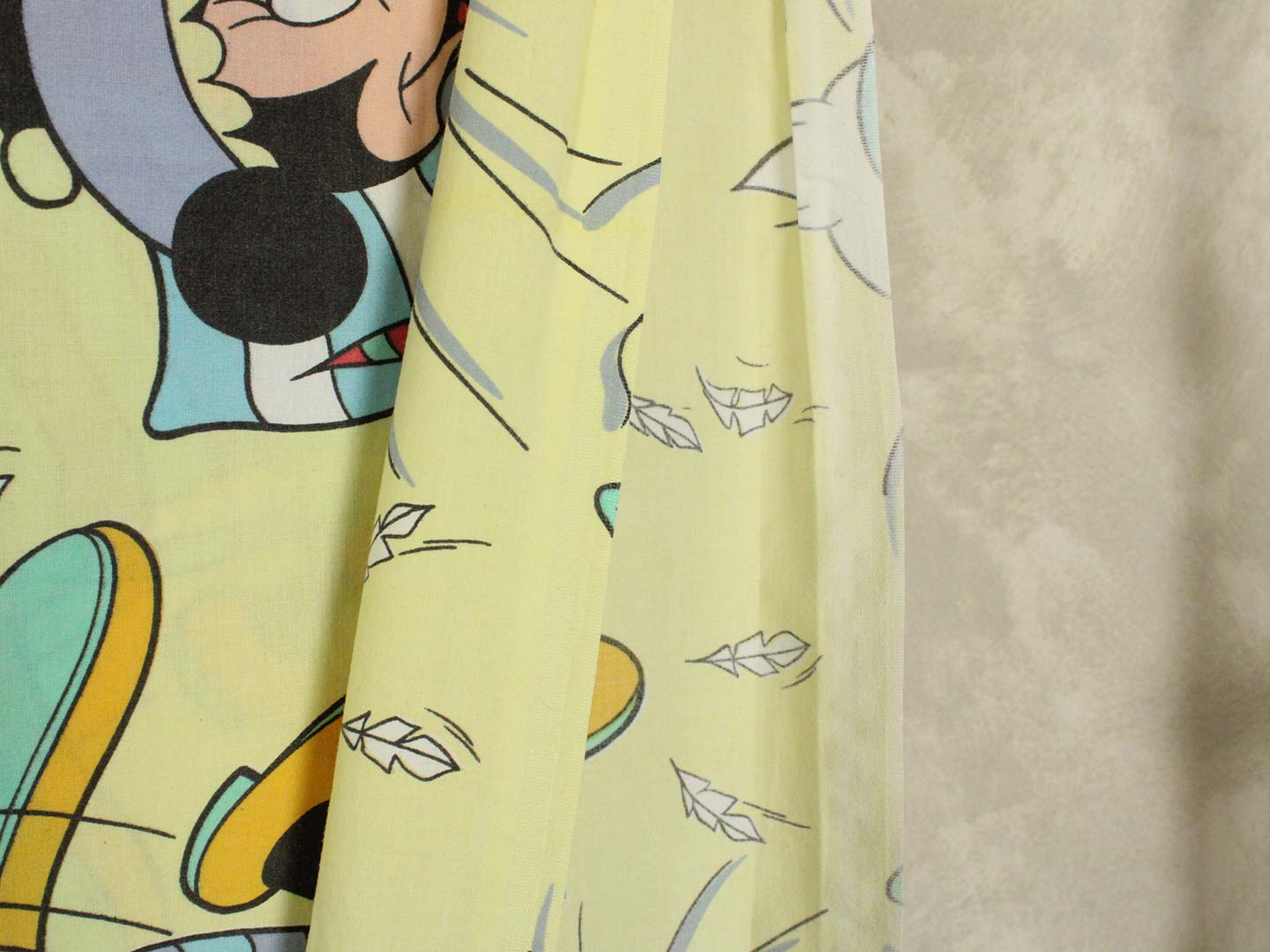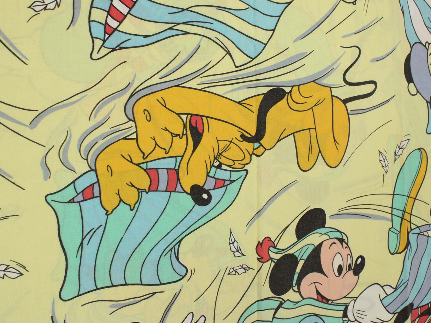 パジャマ姿のミッキーたちのフラットシーツです。まくら投げ柄の黄色バージョン。シーツは1枚もの。全体画像(1,2枚め)はそれぞれシーツを2つ折りにして撮影しています。化繊混じりのサラッとした手触り。
