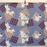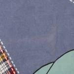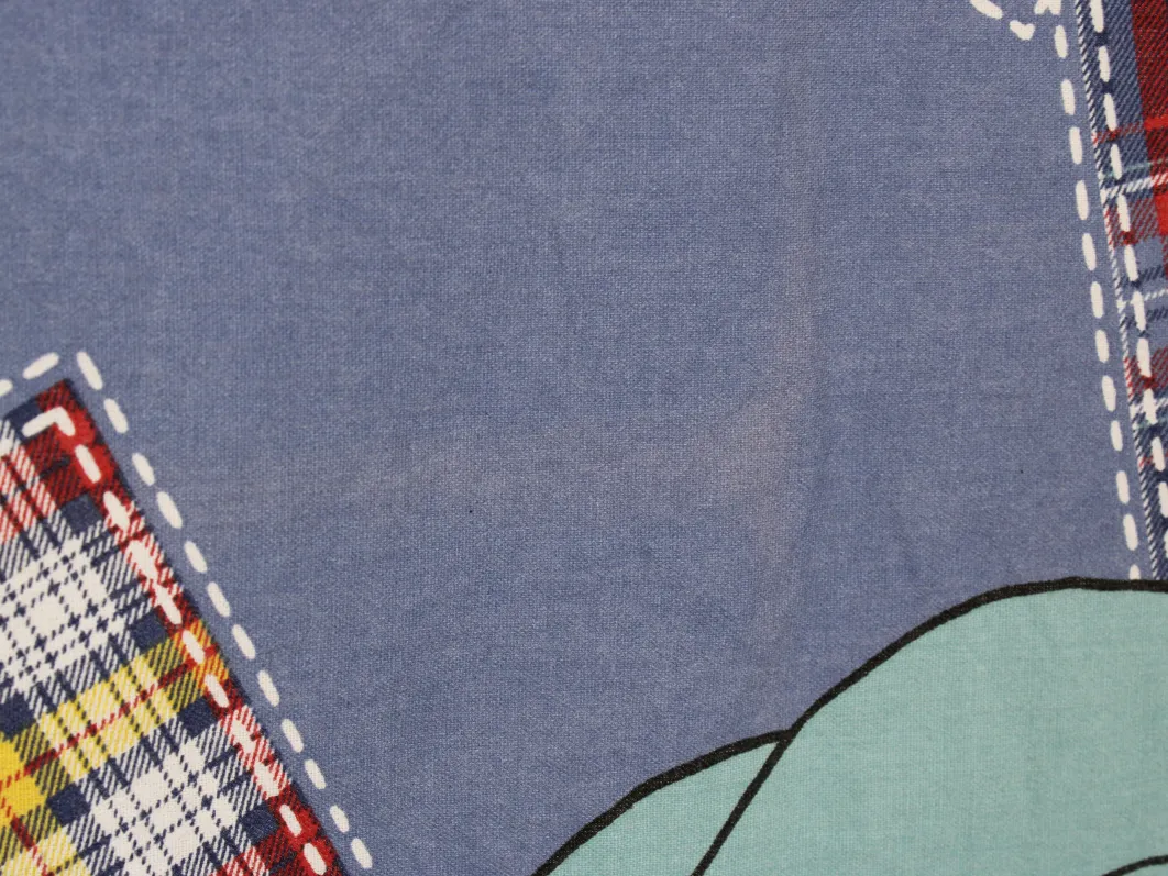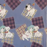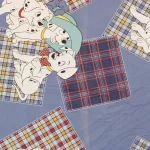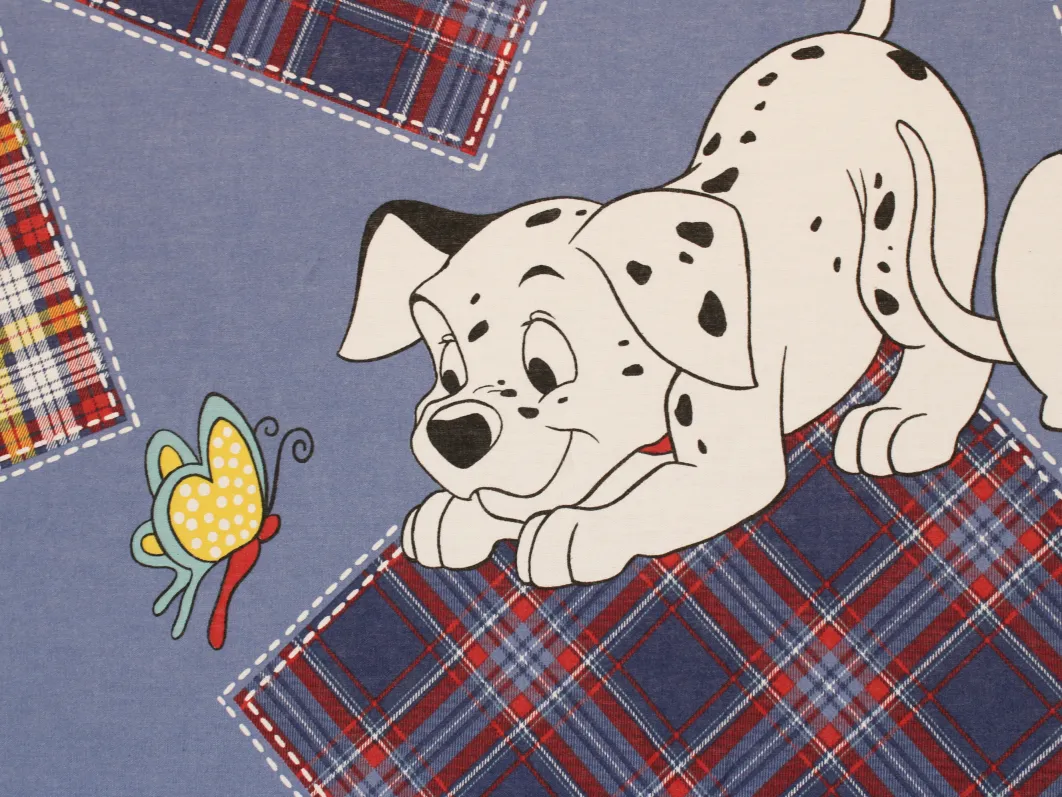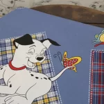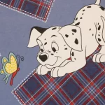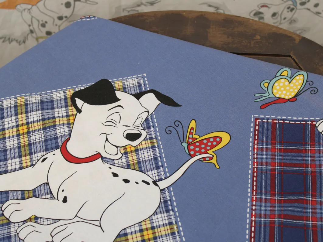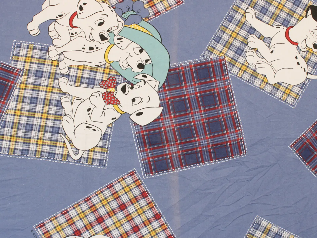 青地に赤と黄色のタータンチェックのパッチ。大きな絵柄の101匹わんちゃんです。