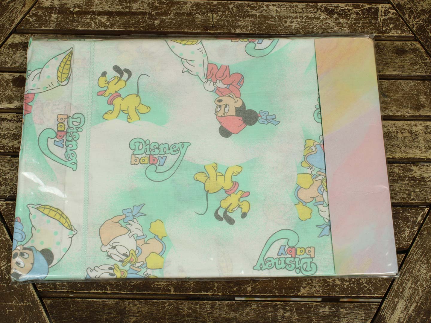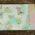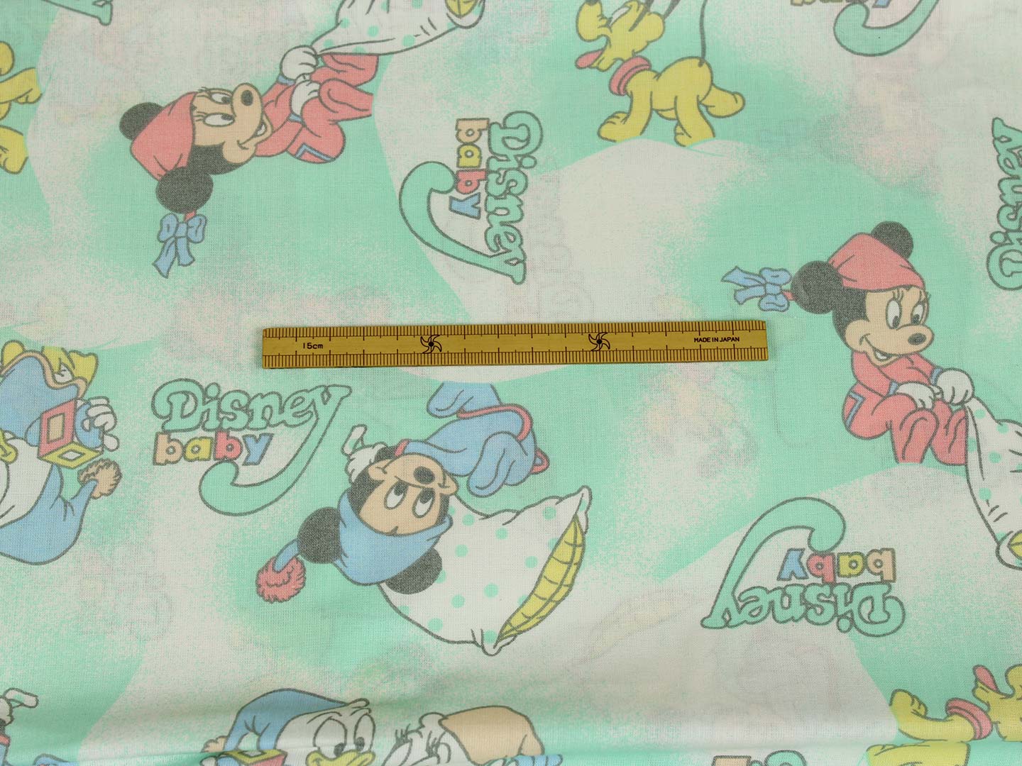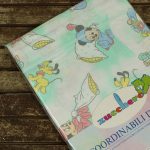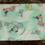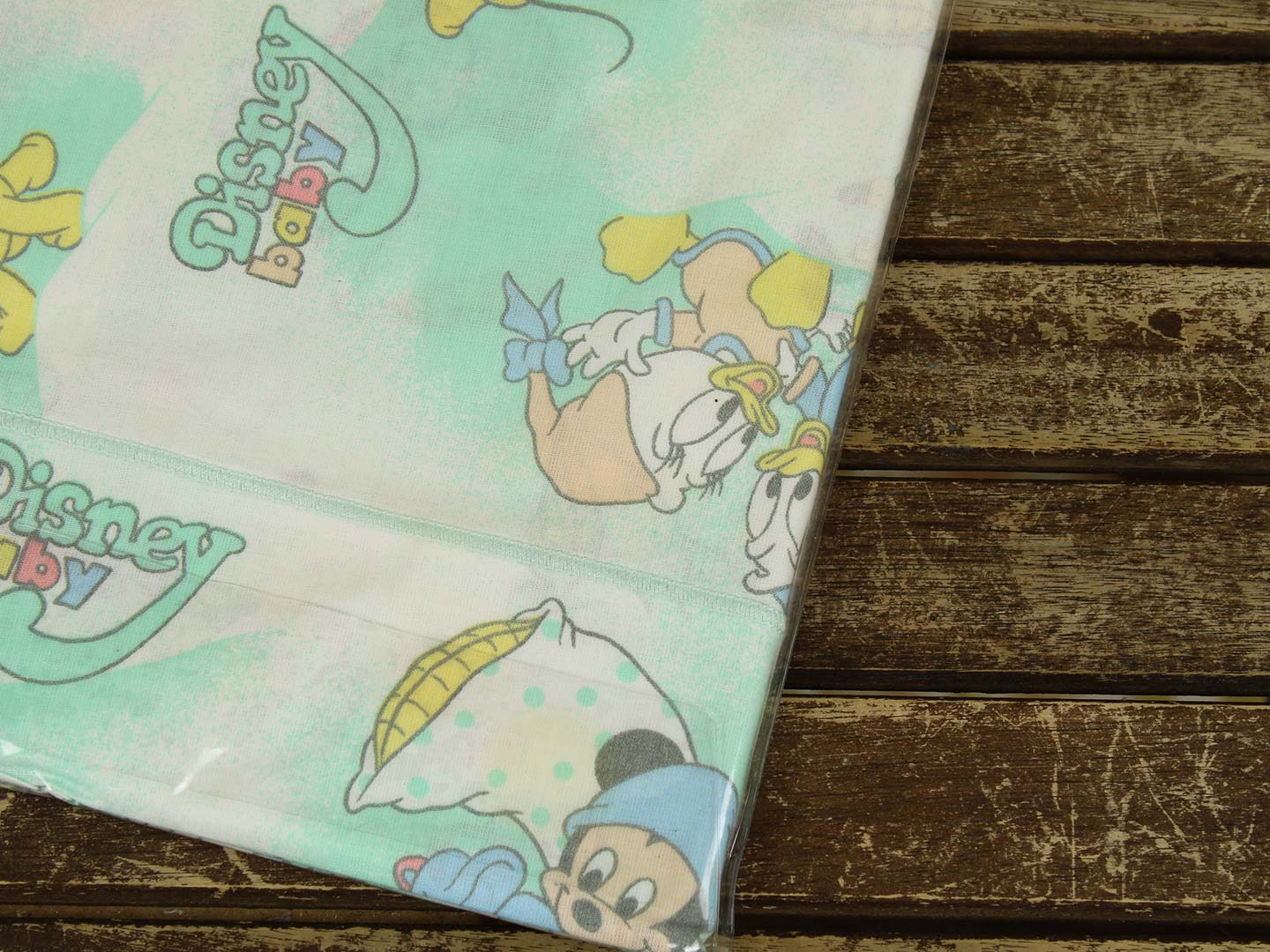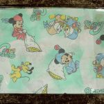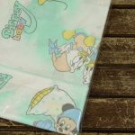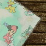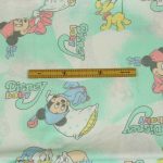 ベビーミッキーたち。エメラルドグリーンとパステルカラーが可愛い、ベビーサイズのたフラットシーツです。シーツは片面絵柄の1枚ものです。