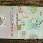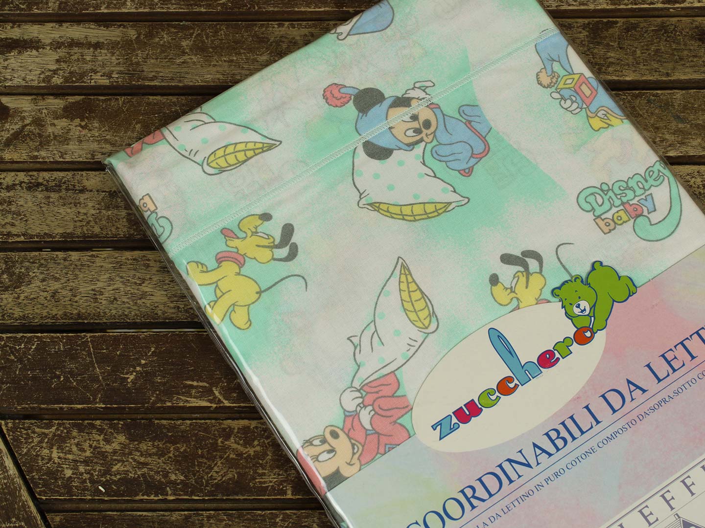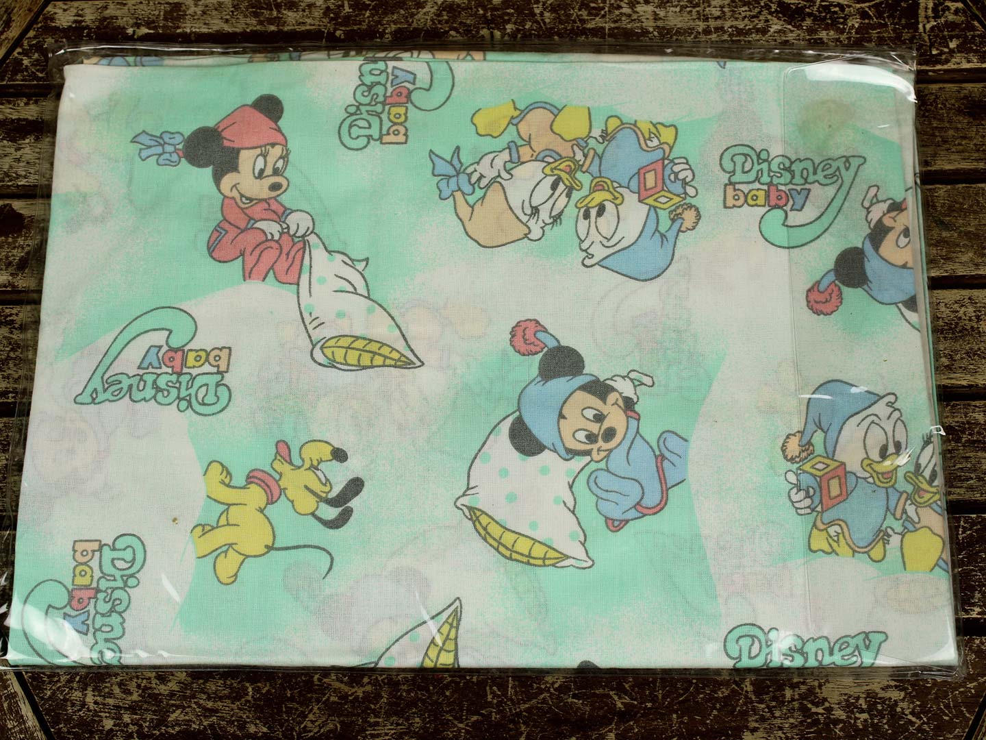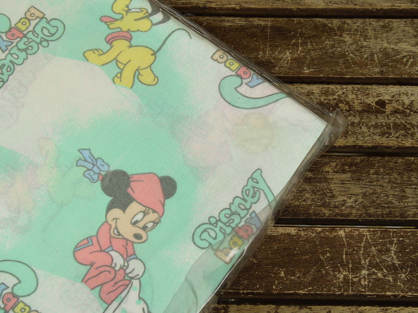 ベビーミッキーたち。エメラルドグリーンとパステルカラーが可愛い、ベビーサイズのたフラットシーツです。シーツは片面絵柄の1枚ものです。