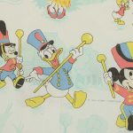 ミッキー、ミニーとドナルドや仲間たち。人気の白地、ディズニーランド柄のフラットシーツです。影が水色のバージョン。色々な衣装のキャラクターたちが可愛らしいです。