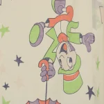 レトロカラーにシンプルな絵柄のピノキオ。紫×緑色バージョン。