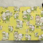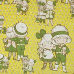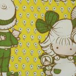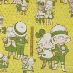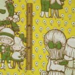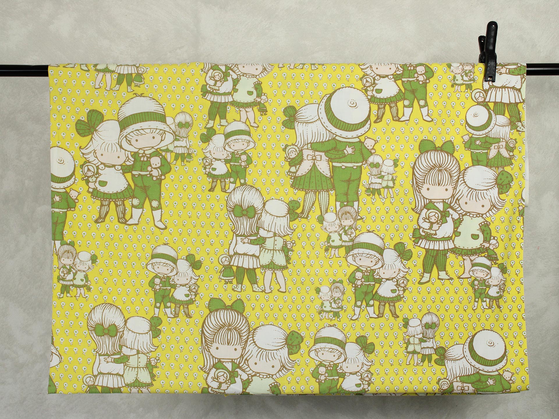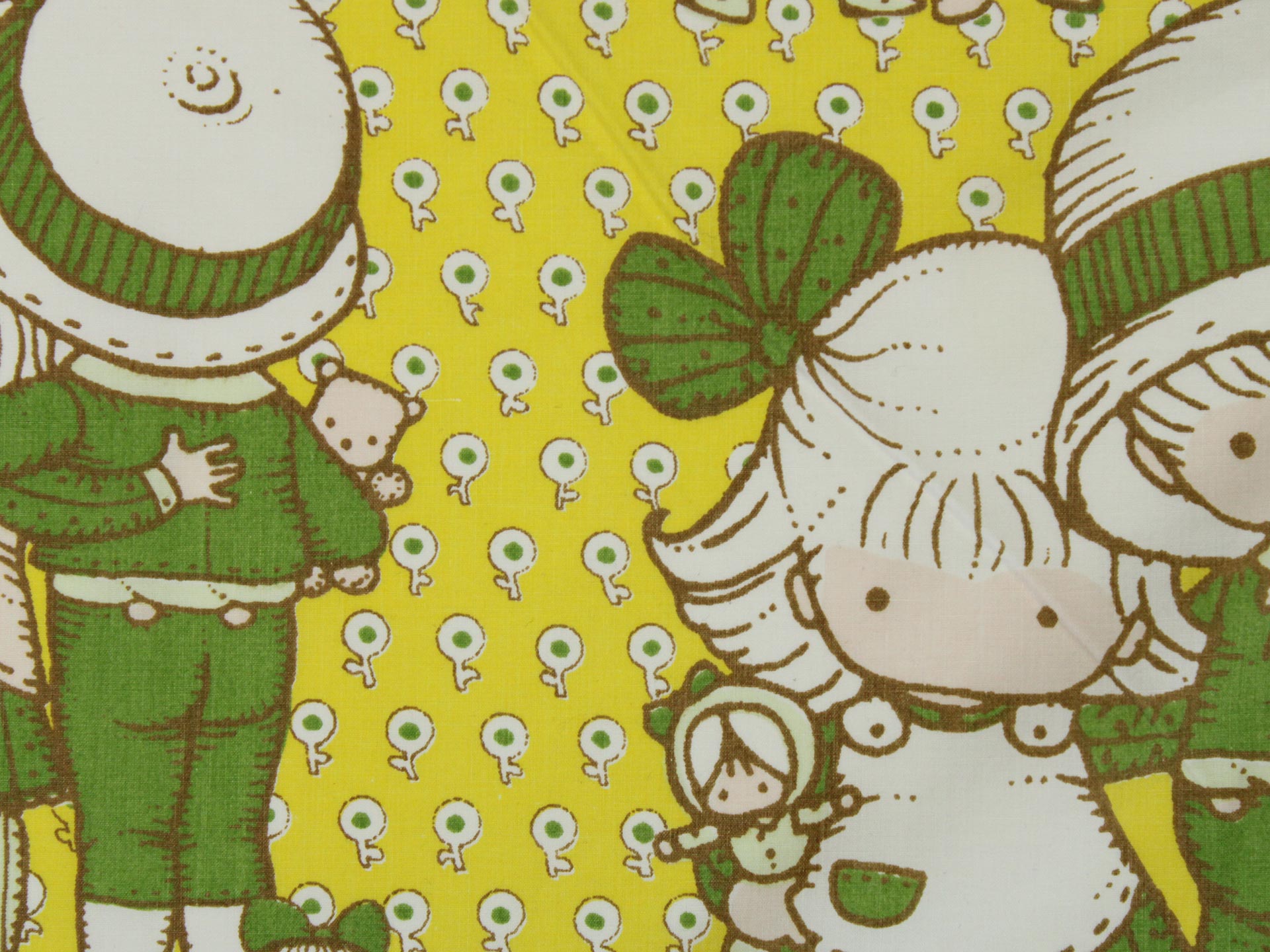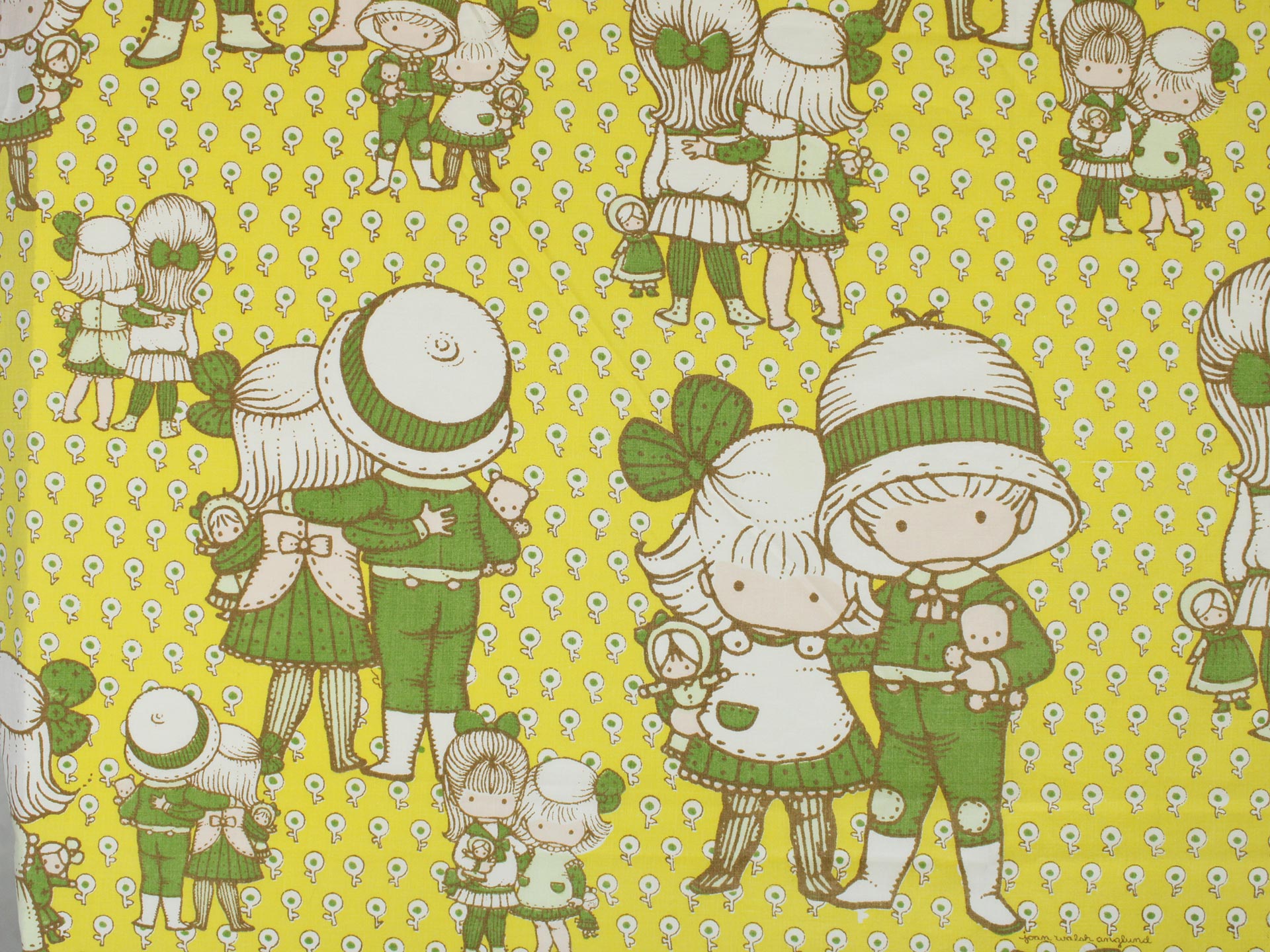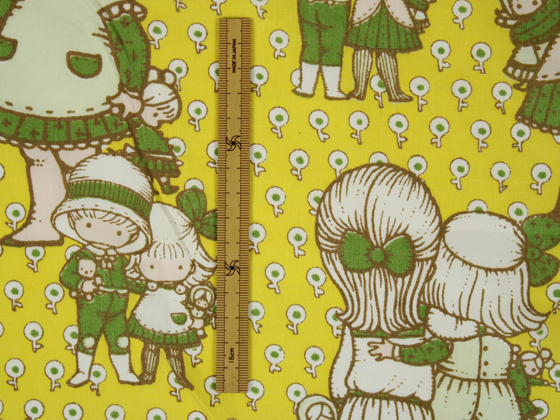 70年代、アメリカ。ジョアン・ウォルシュ・アングルンドのイラストがデザインされたファブリック。黄色い背景が印象的です。コレクションやリメイクにいかがでしょうか。