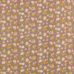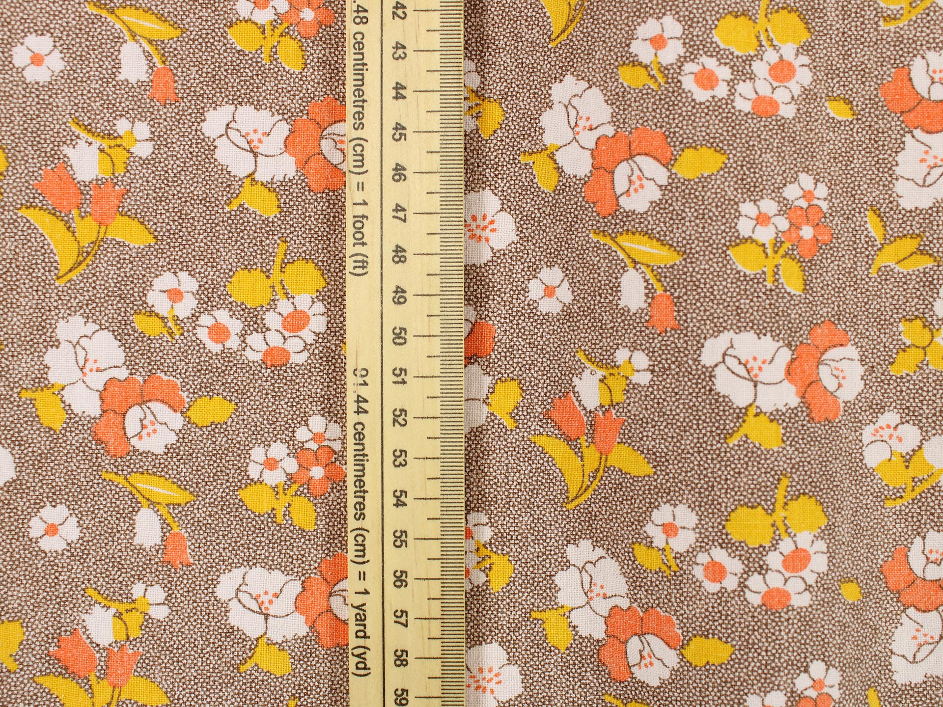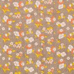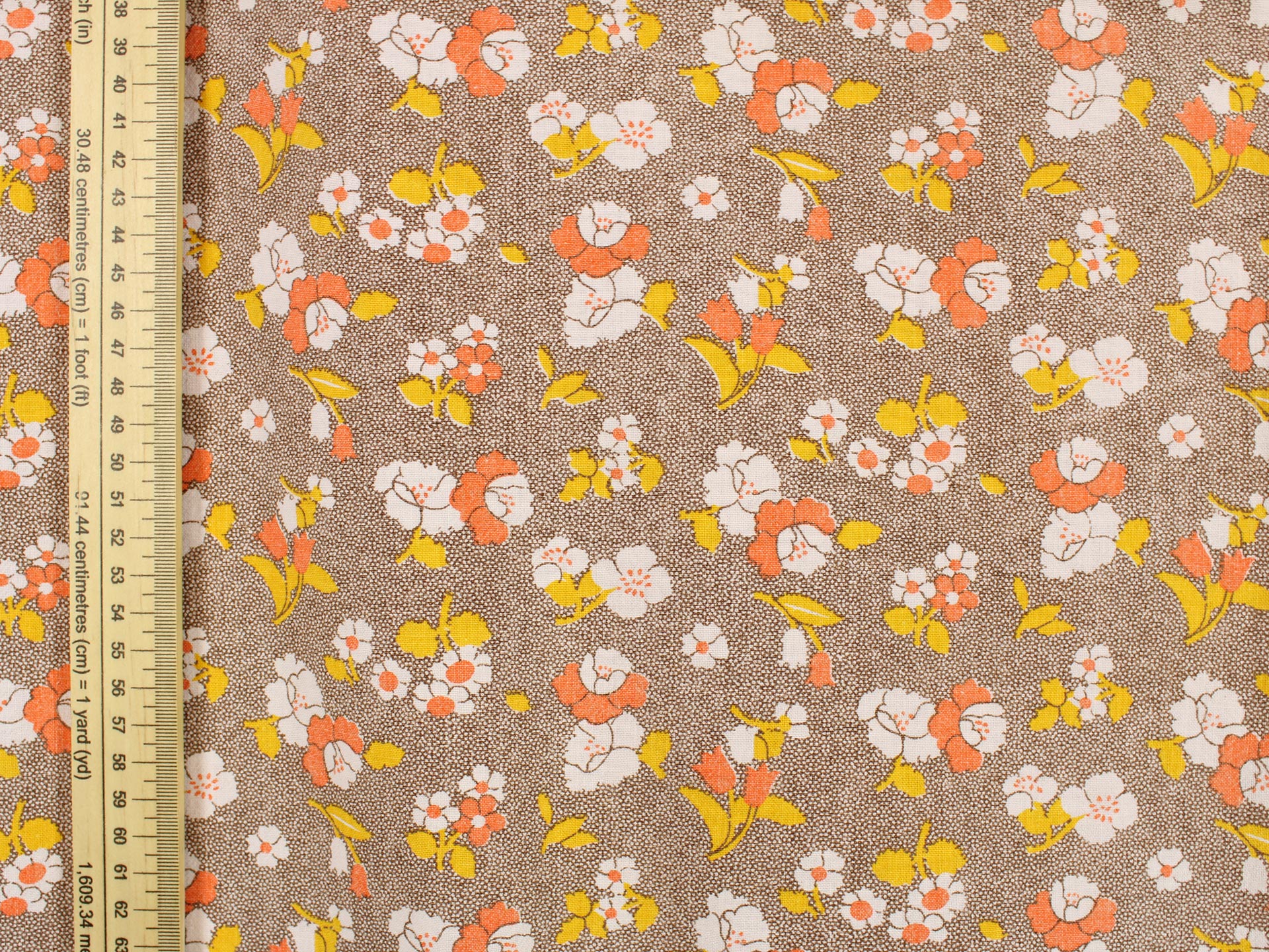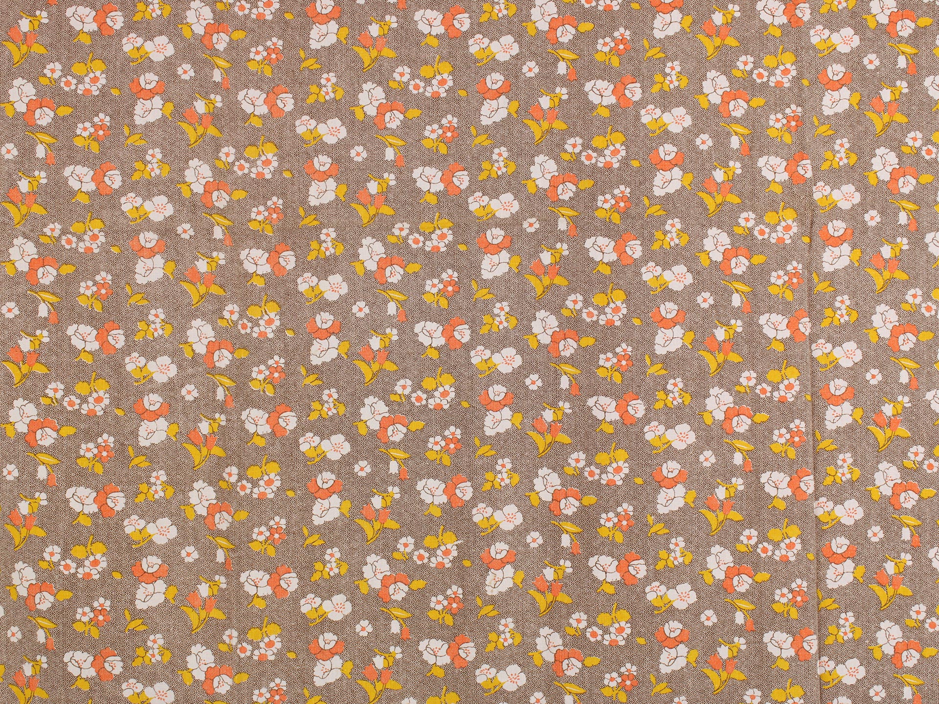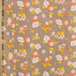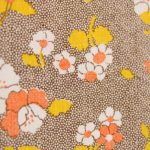 点描ブラウンの背景にオレンジとやまぶき色の小花柄ファブリック。