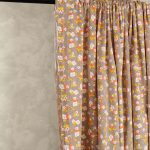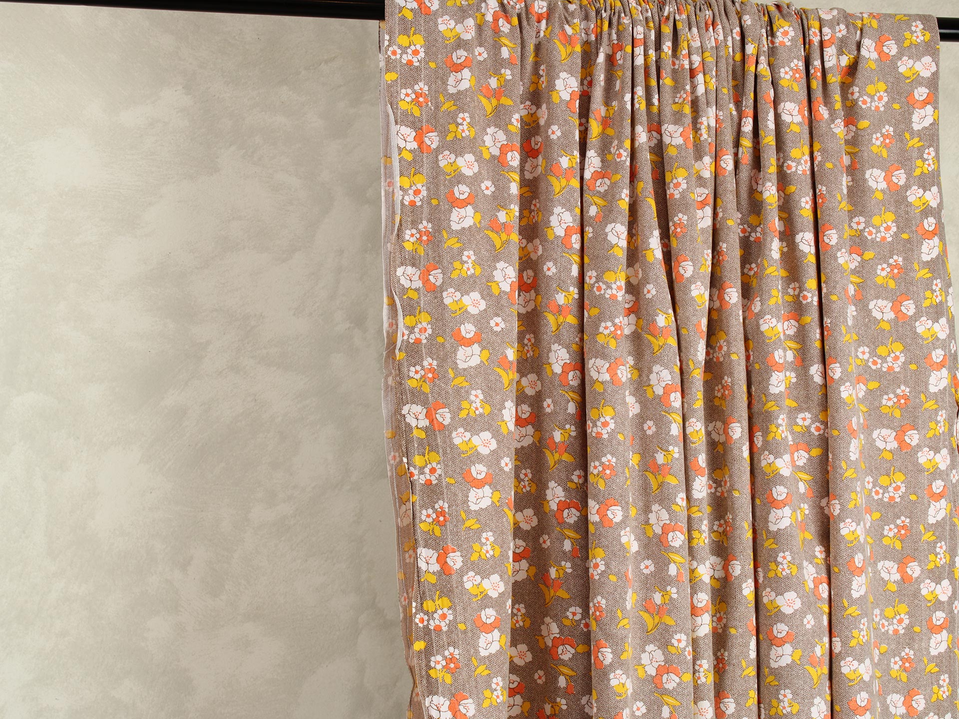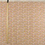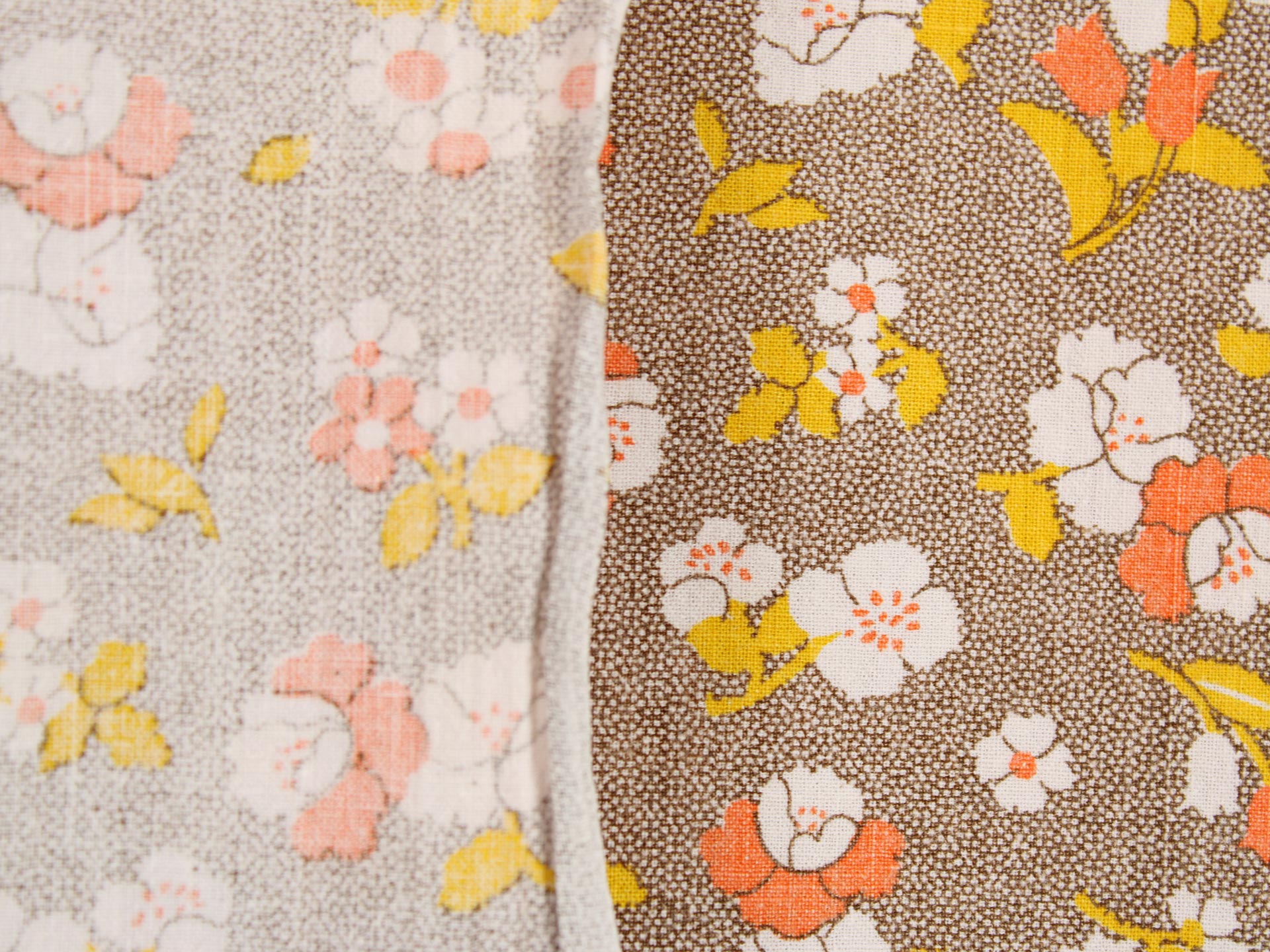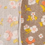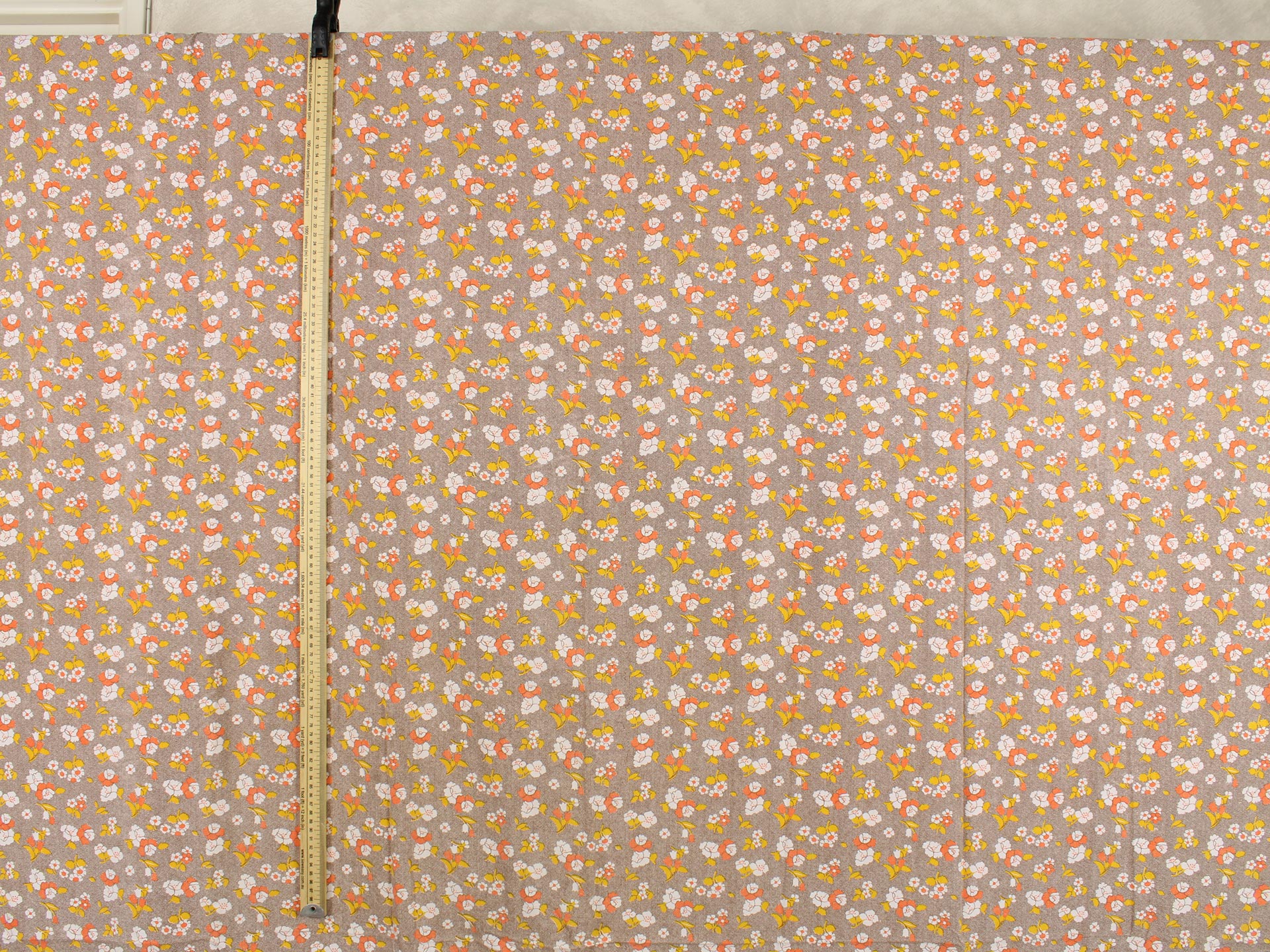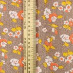 点描ブラウンの背景にオレンジとやまぶき色の小花柄ファブリック。