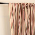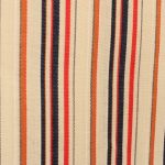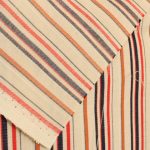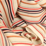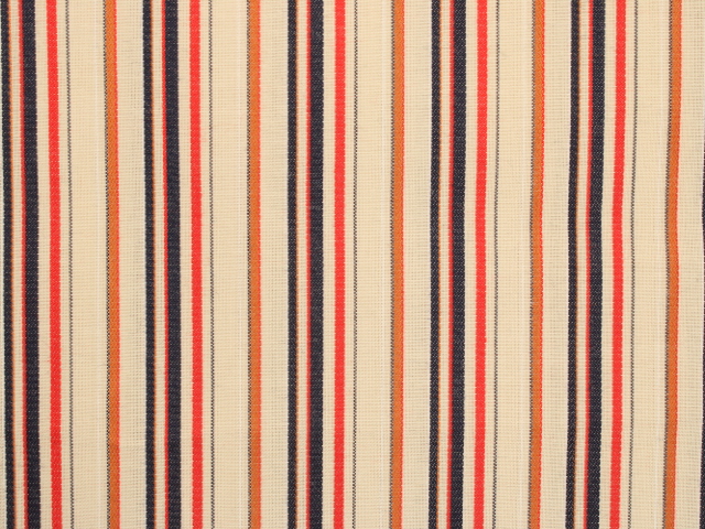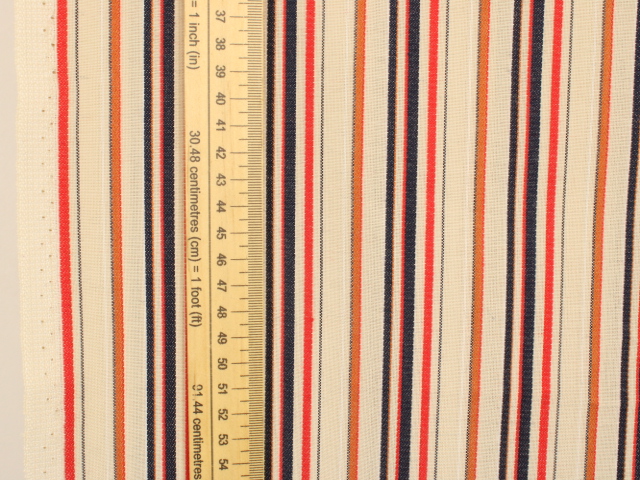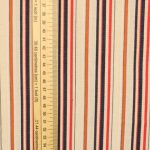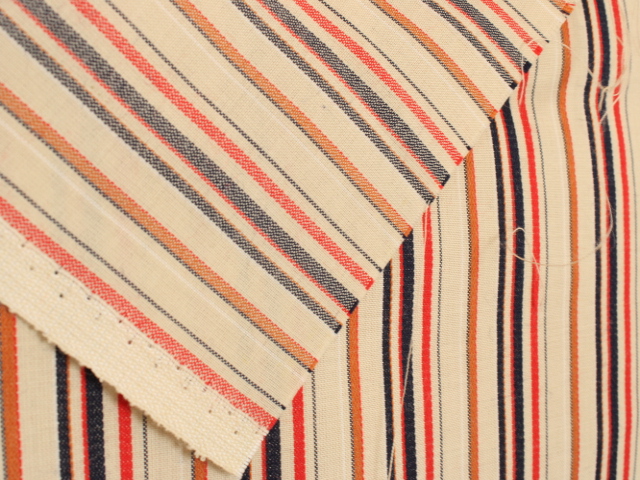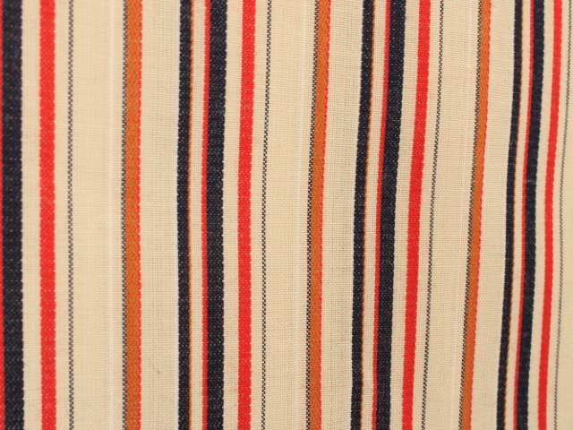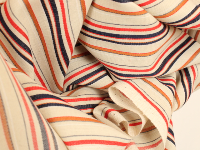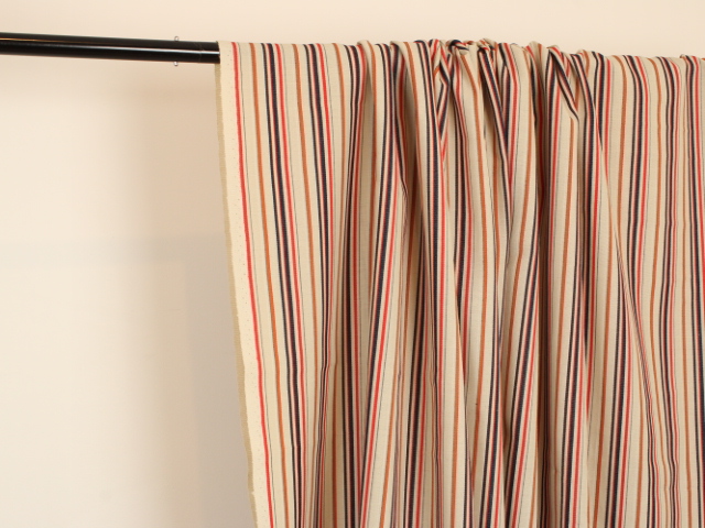 ベージュに赤、オレンジ、黒のレトロなストライプ模様が織り込まれた先染め生地です。