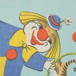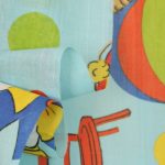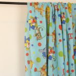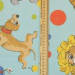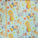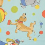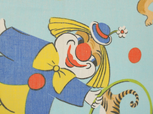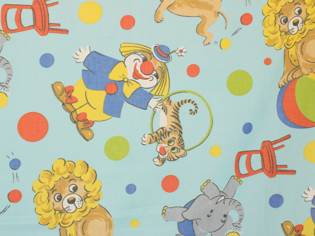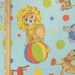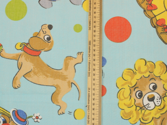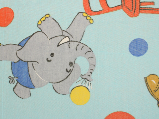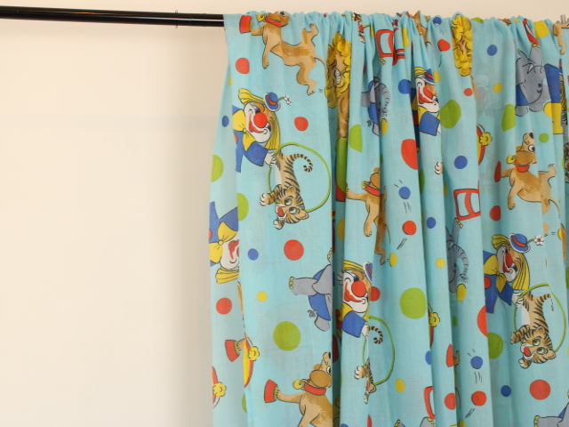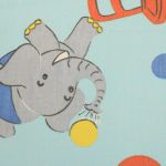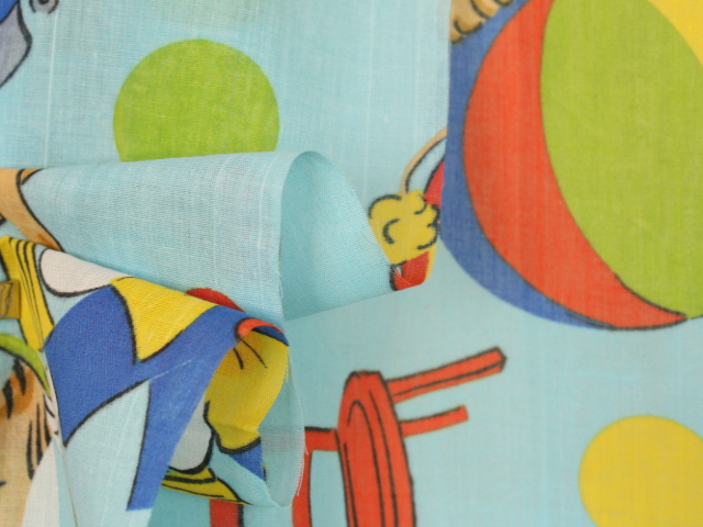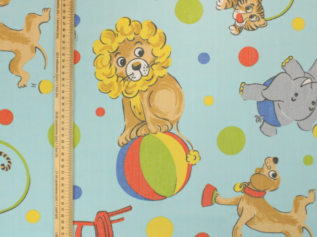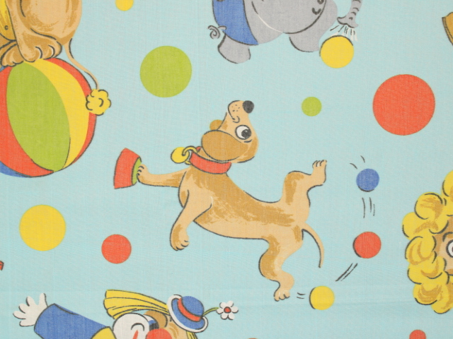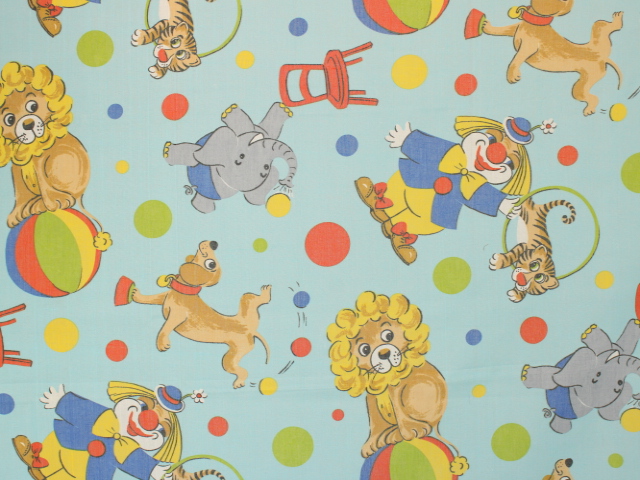 明るい水色地に、カラフルなサーカス柄のファブリックです。
