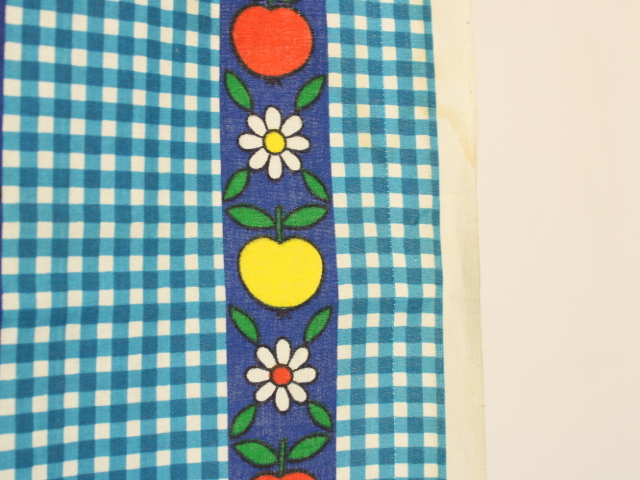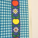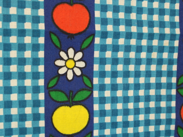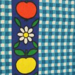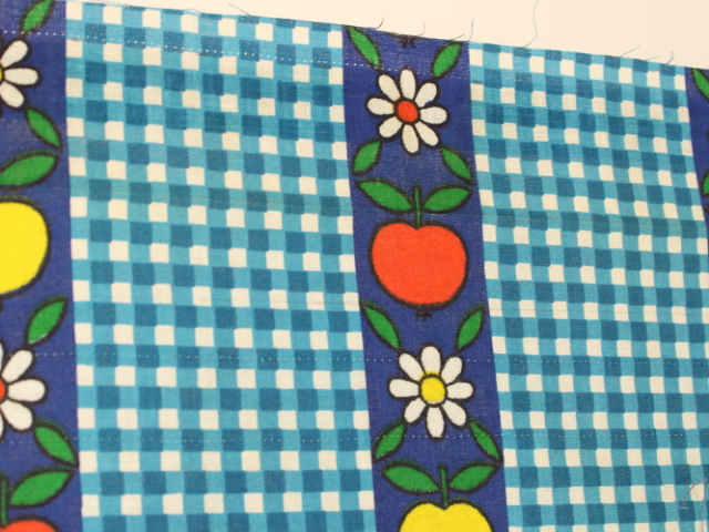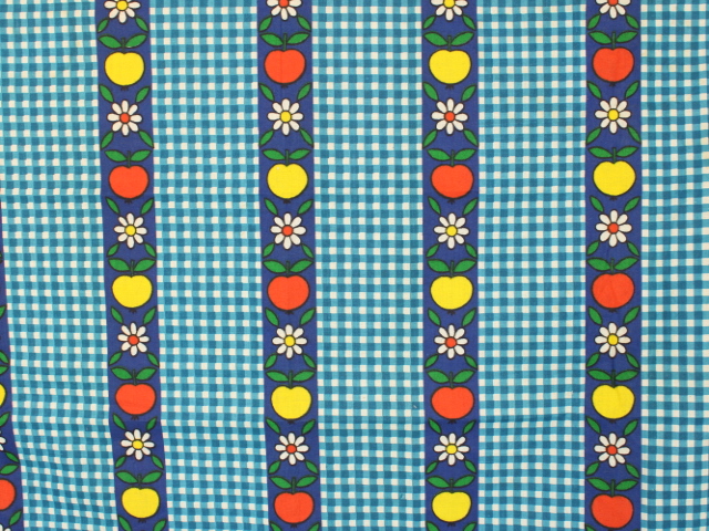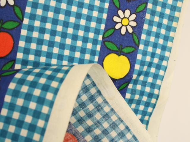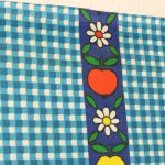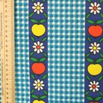 青いギンガムチェック地に、リンゴと花のパターン柄ファブリック。